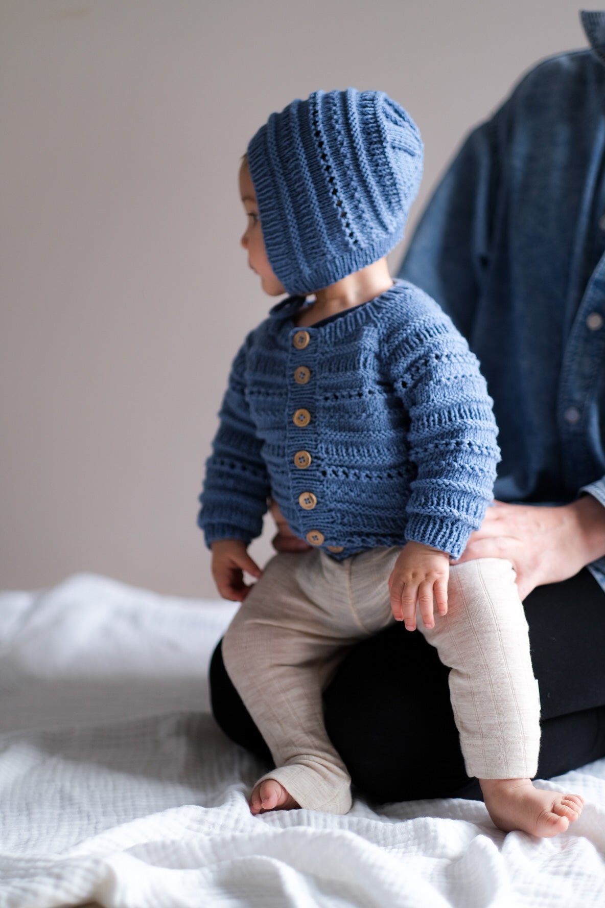 Hele settet strikkes i Un-told Cottonmerino, et helårsgarn i en blanding av merinoull og bomull som er mykt og kløfritt. På bildene er settet strikket opp i fargene Blue Jeans, Linen og Picante.