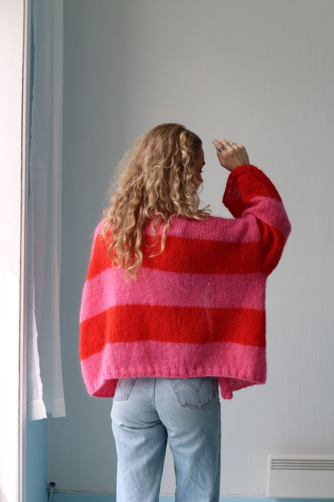 Denne skikkelig oversized og boksformede cardigan strikkes ovenfra og ned, frem og tilbake. Den kan enten strikkes med trippel tråd Pure Silk Mohair eller en tråd Chunky mohair. Prøv på underveis og skreddersy den til mottaker!