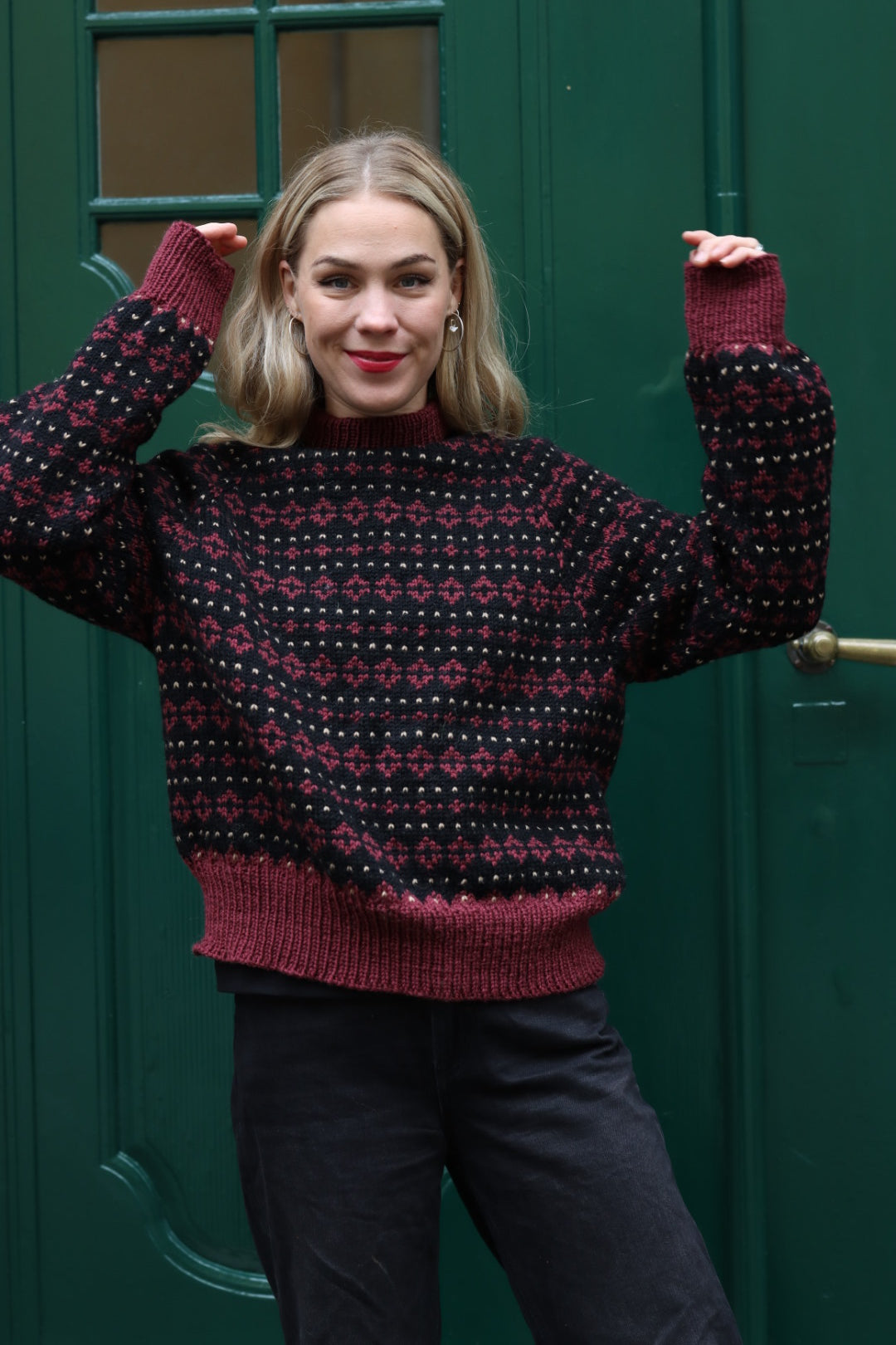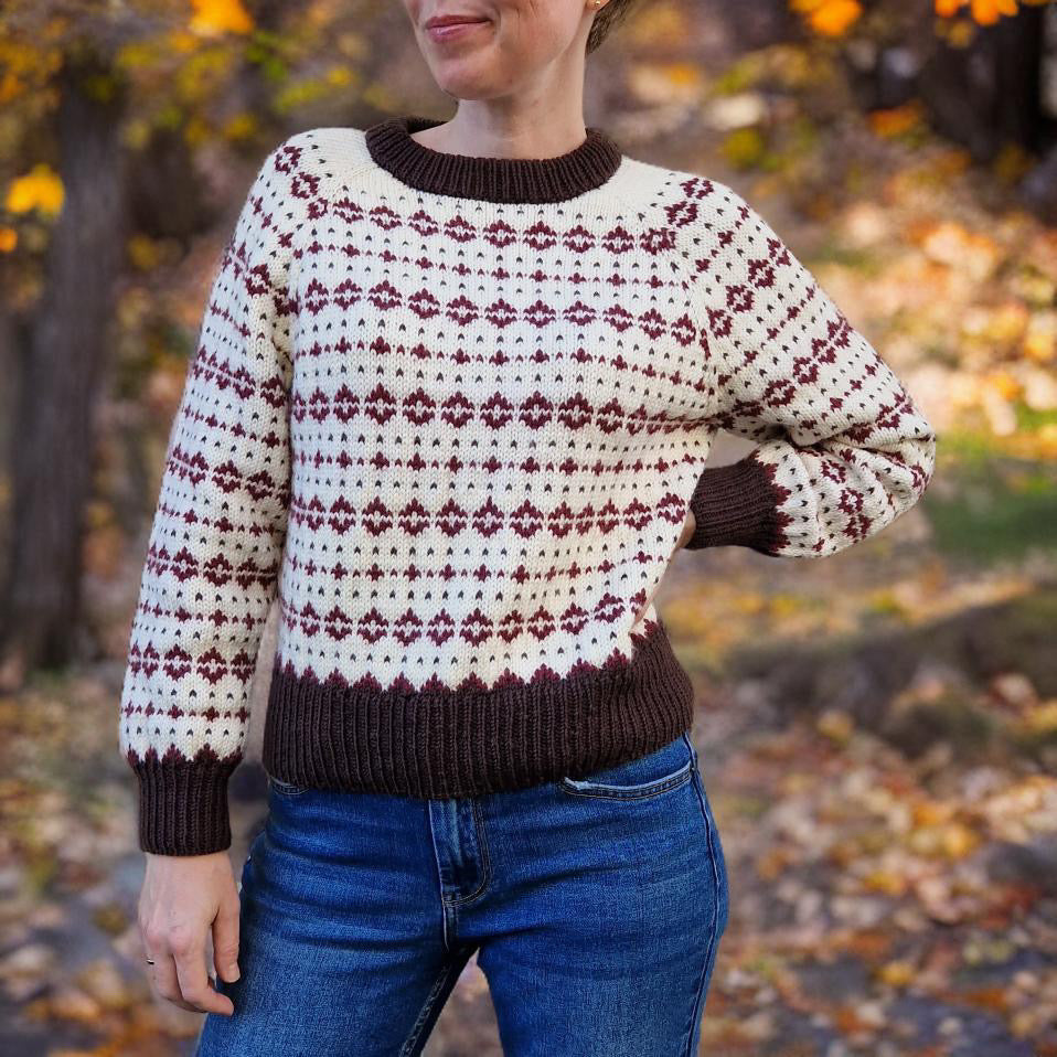Norasweater strikkes ovenfra og ned, med raglanøkning og mønster hele veien. Mønsteret er lettlært og sitter fort i fingrene!