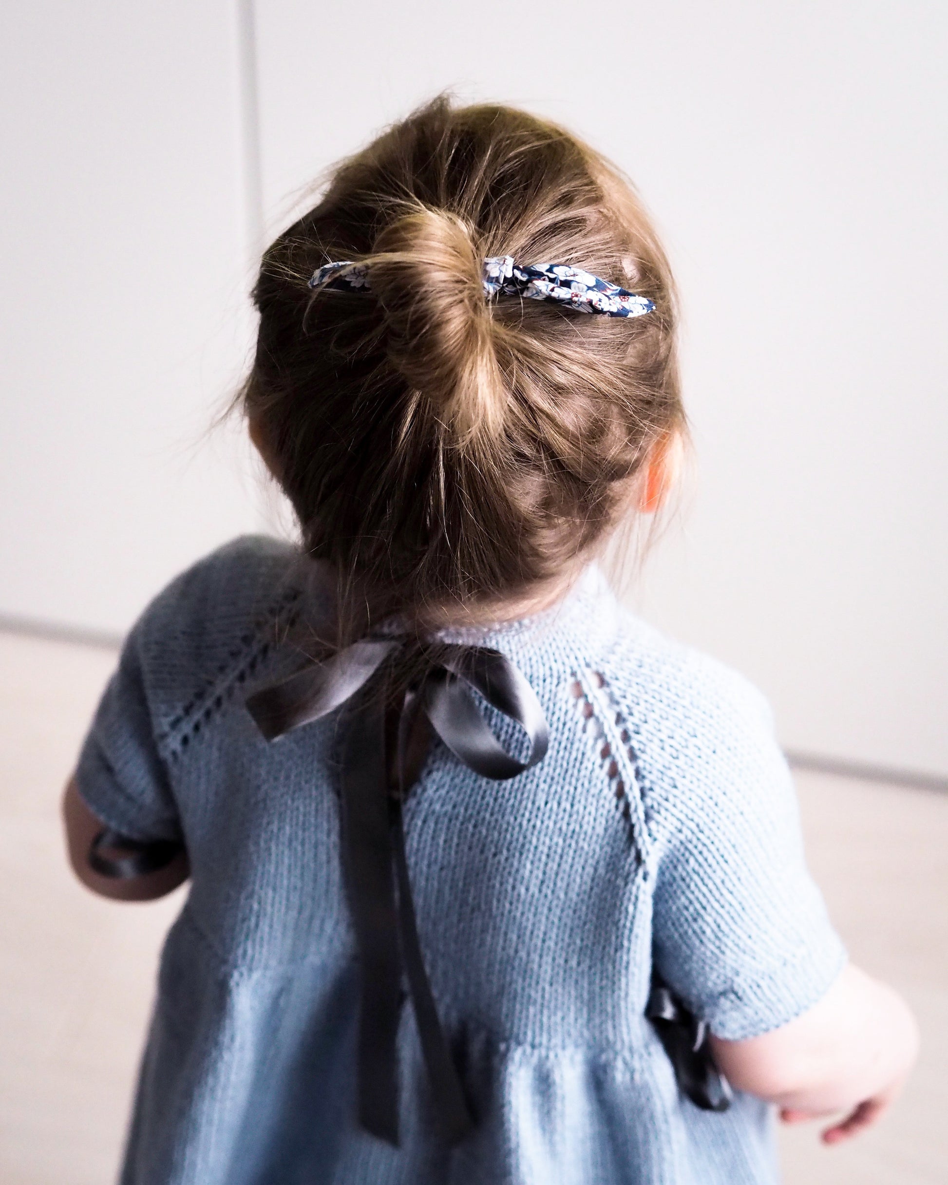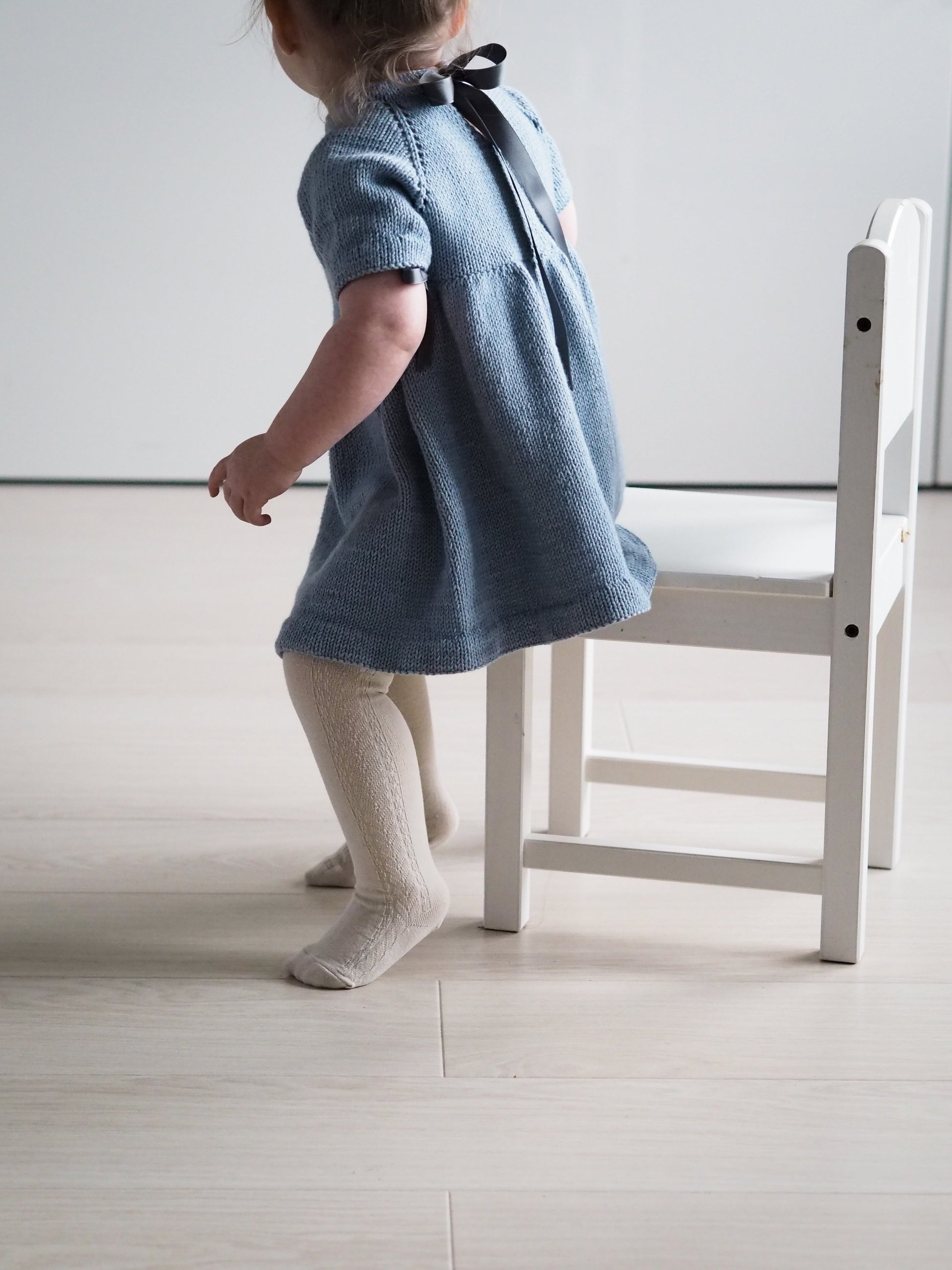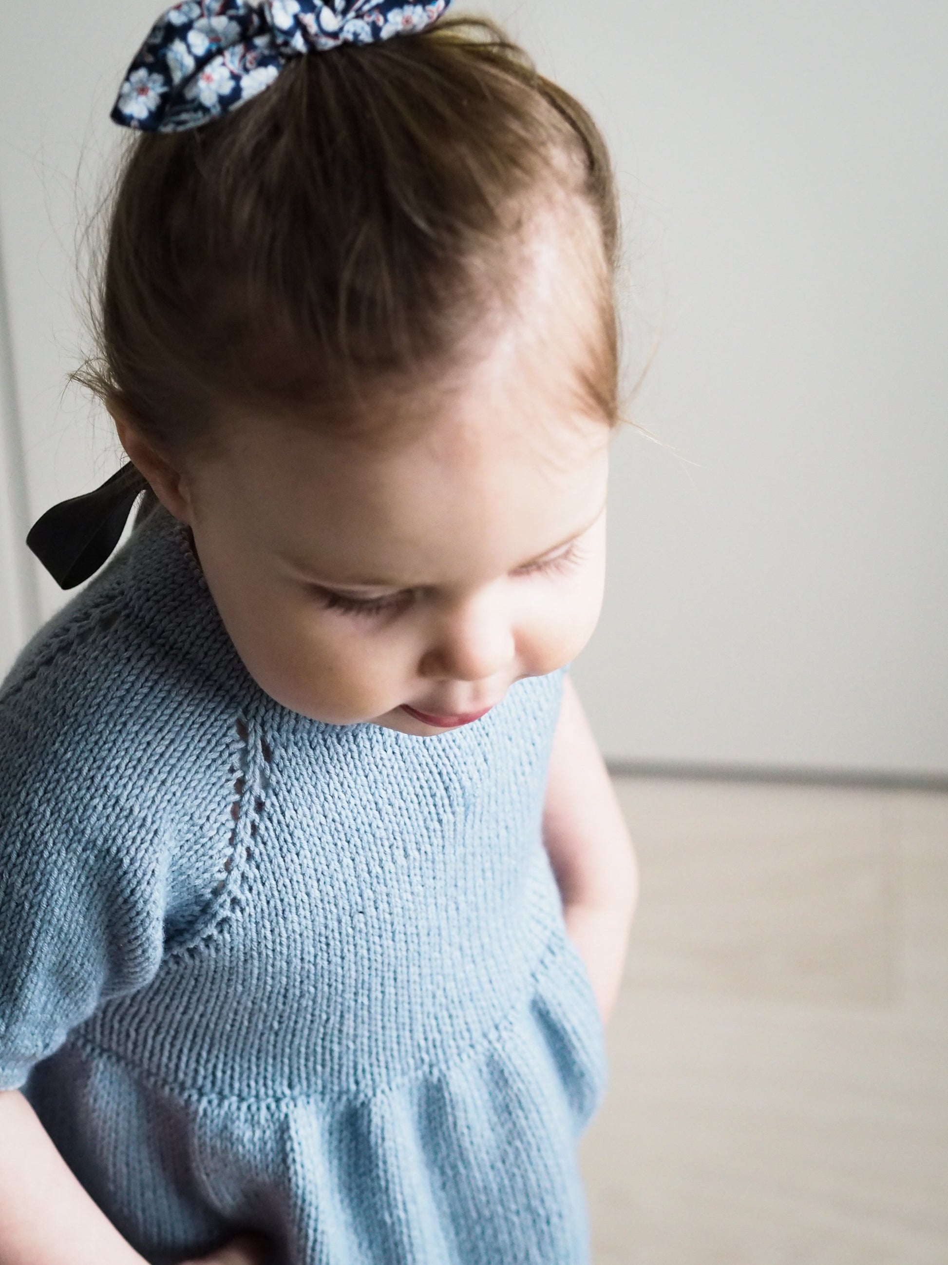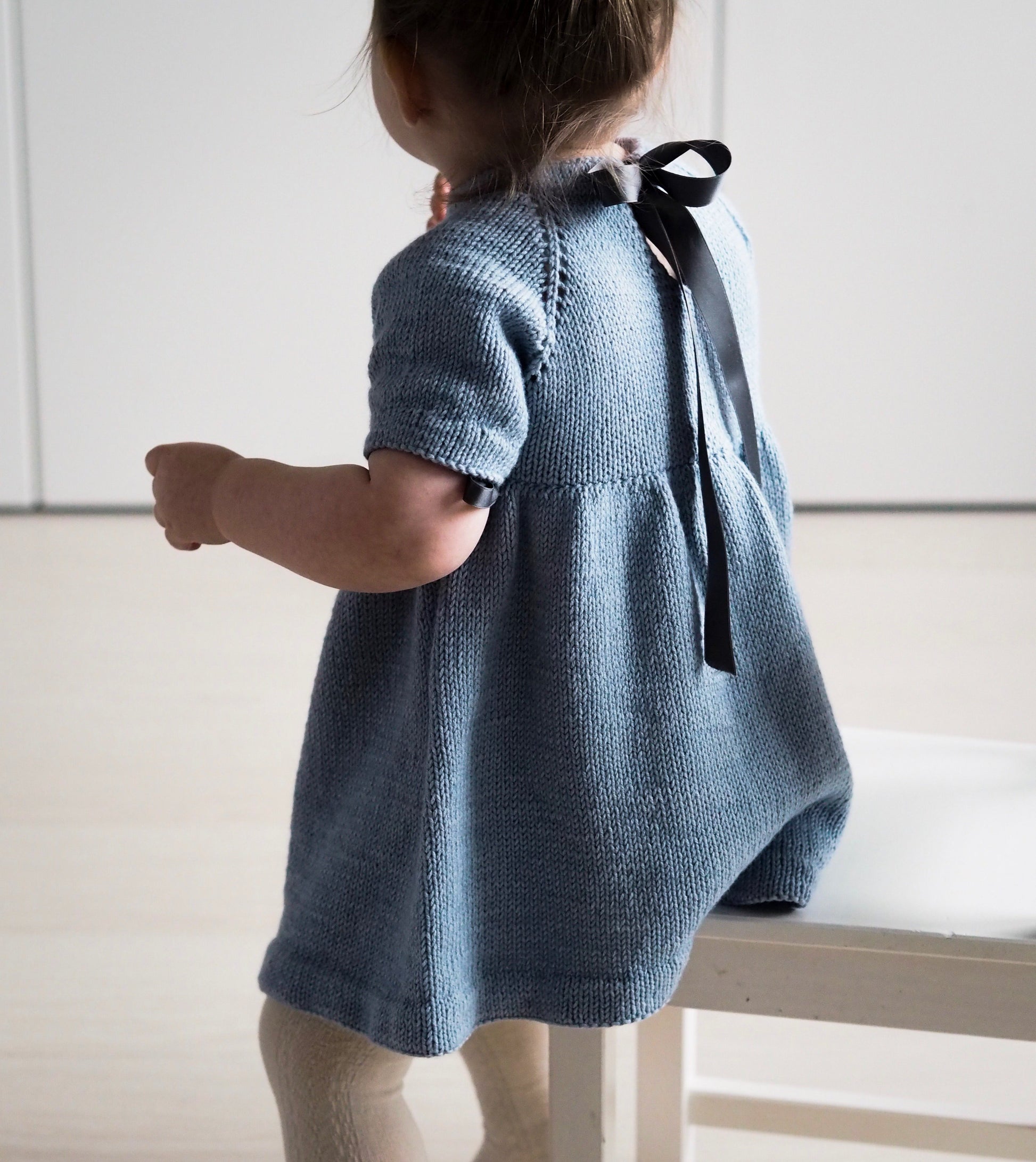 The Sonja dress is a simple dress that is knit top down with adjustable tunnels on the sleeves and neckline. The waistline is shaped by binding off and picking up stitches again. Since this is a top down knit the length of the skirt can be adjusted as desired.