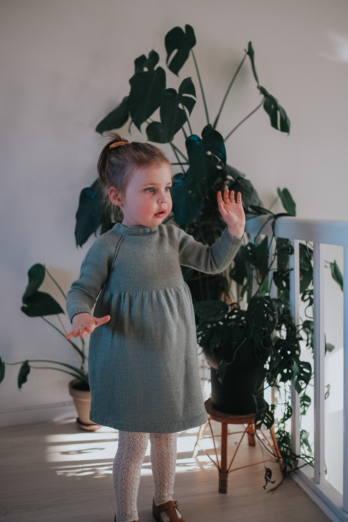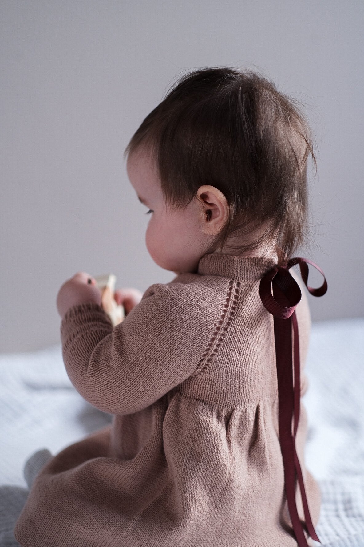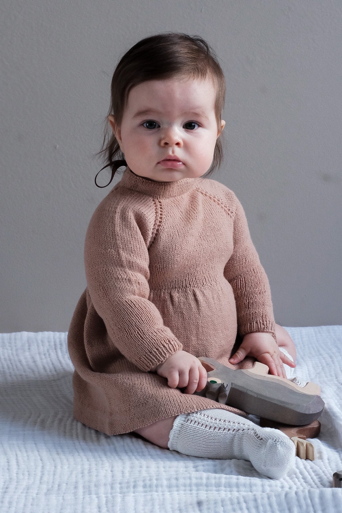 Das Sonja Kleid ist ein simples Kleid, das von oben nach unten gestrickt wird und Tunnelzüge an Ärmeln und dem Halsausschnitt hat.