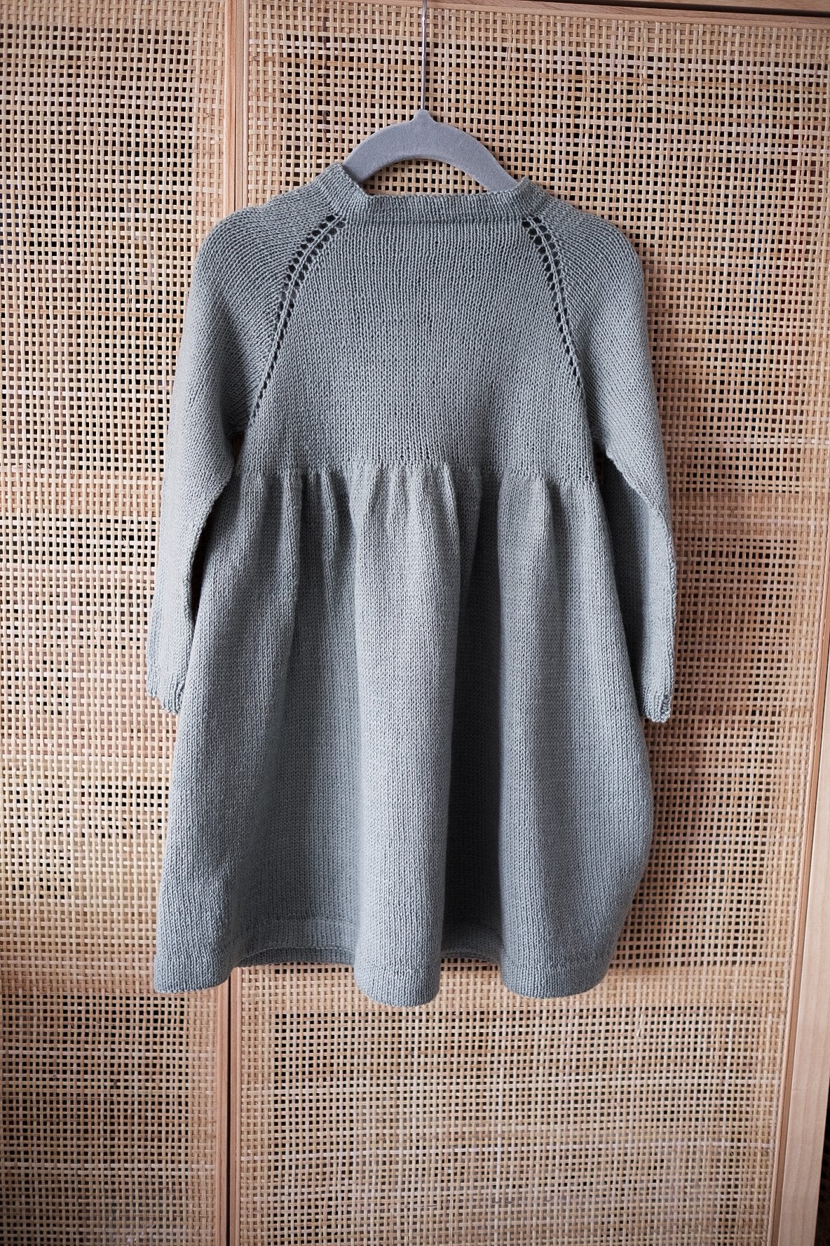 Die Maschen am Rumpf werden alle abgekettet, bevor sie für den Rock wieder aufgenommen und glatt rechts nach unten gestrickt werden. Da das Kleid von oben nach unten gearbeitet wird, lässt sich die Länge ausgezeichnet an die Größe des Kindes anpassen.