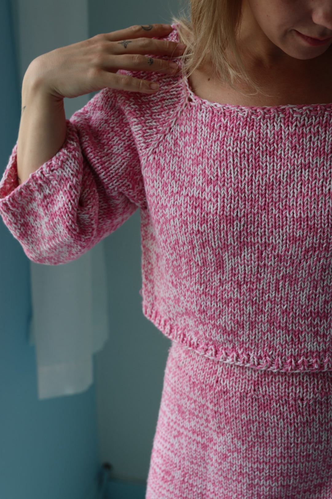The skirt in the photos is knitted in the colors Bright White og Bubblegum.