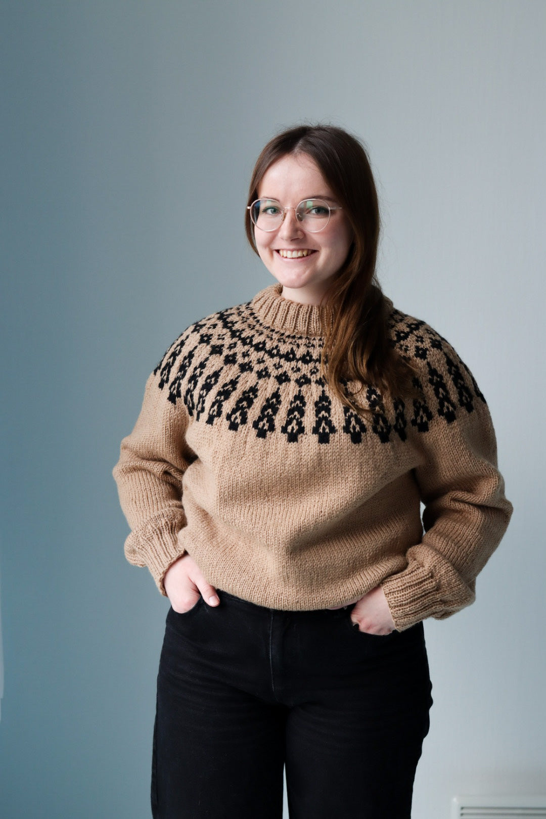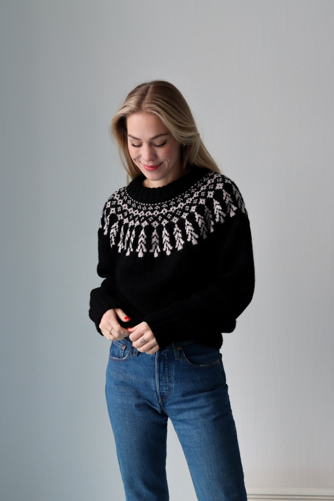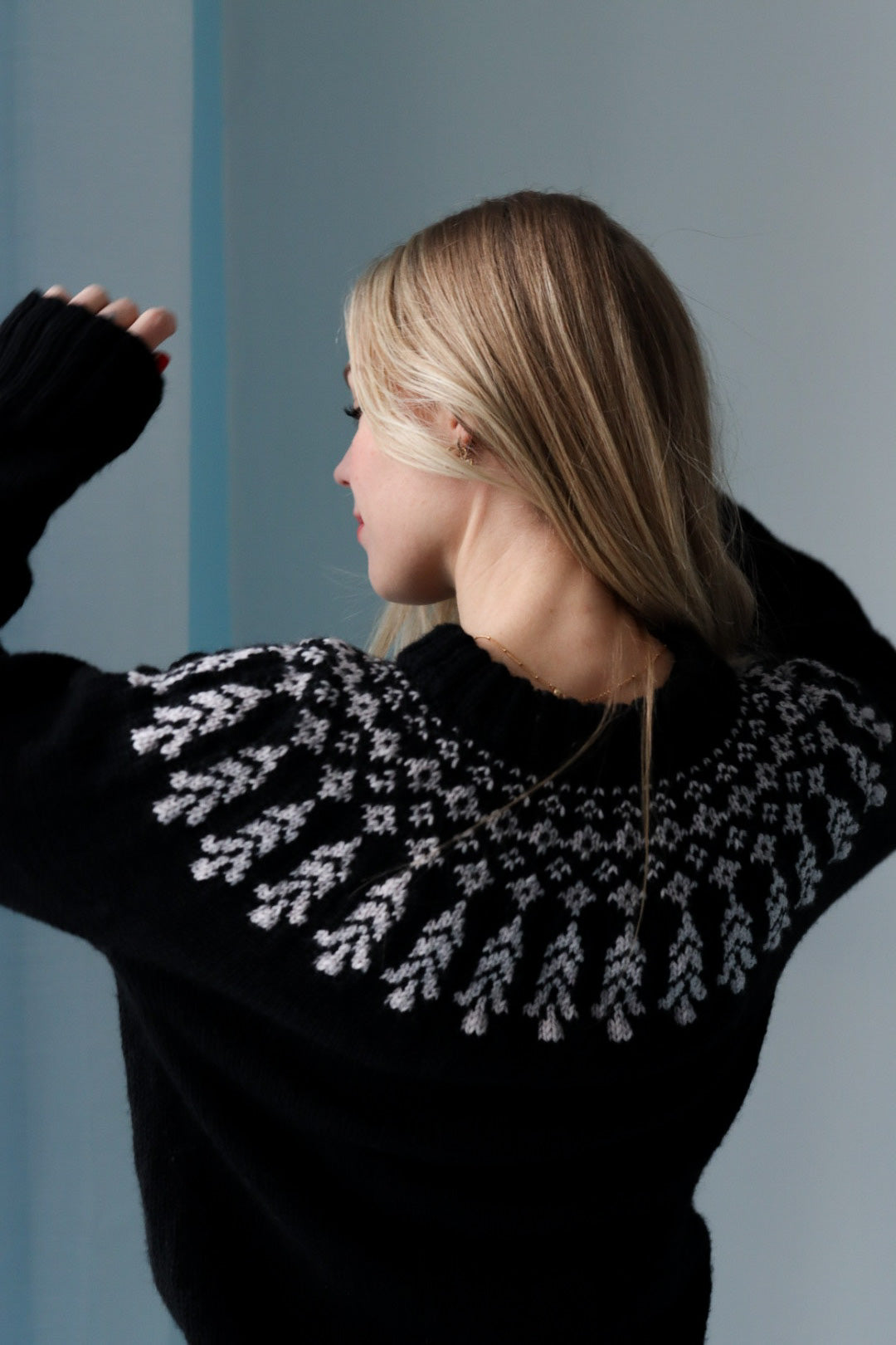 Den sorte genseren er strikket i bunnfarge Jet Black med mønsterfarge Pearly White. Den burgunderrøde genseren er strikket i bunnfarge Rouge Noir med mønsterfarge Pearly White. Den beige genseren er strikket i bunnfarge Hazelnut med mønsterfarge Jet Black. Takk til @knittedbykristina for lån av bilde!