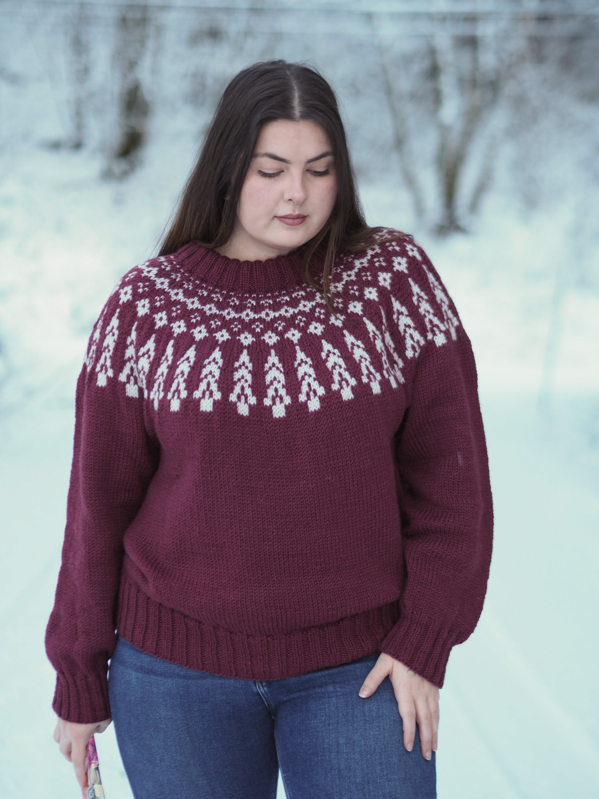 Vinterskoggenser strikkes i Supreme Wool. Genseren strikkes ovenfra og ned med rundøkninger på bærestykket. Siden den strikkes ovenfra og ned kan lengden enkelt justeres.