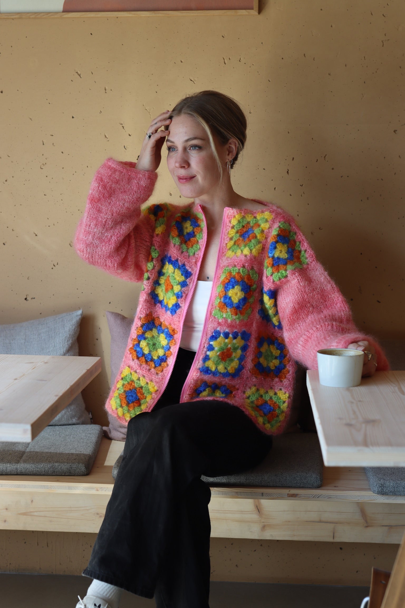Anna jakke er en varm og luftig jakke bestående av heklede bestemorruter med strikkede ermer i glattstrikk som avsluttes med i-cord nederst. Like fin med glidelås som uten. Du kan enkelt endre uttrykk ved å bruke en eller flere farger.Perfekt restegarnprosjekt!