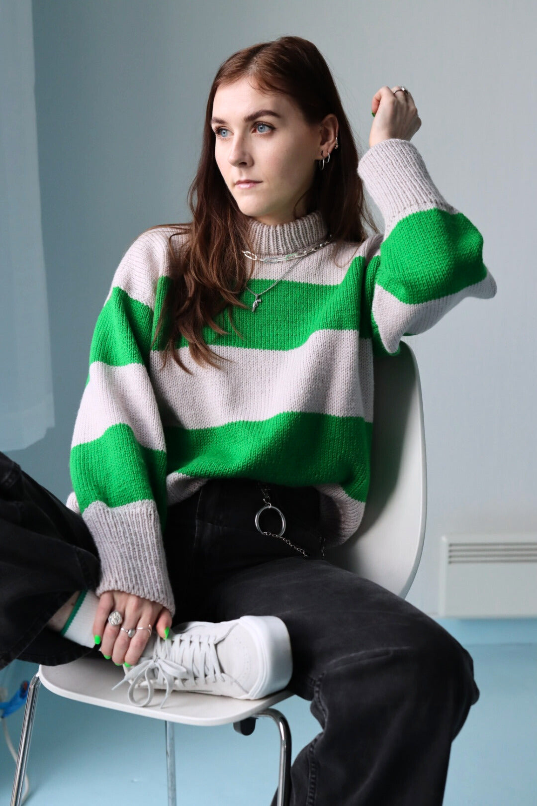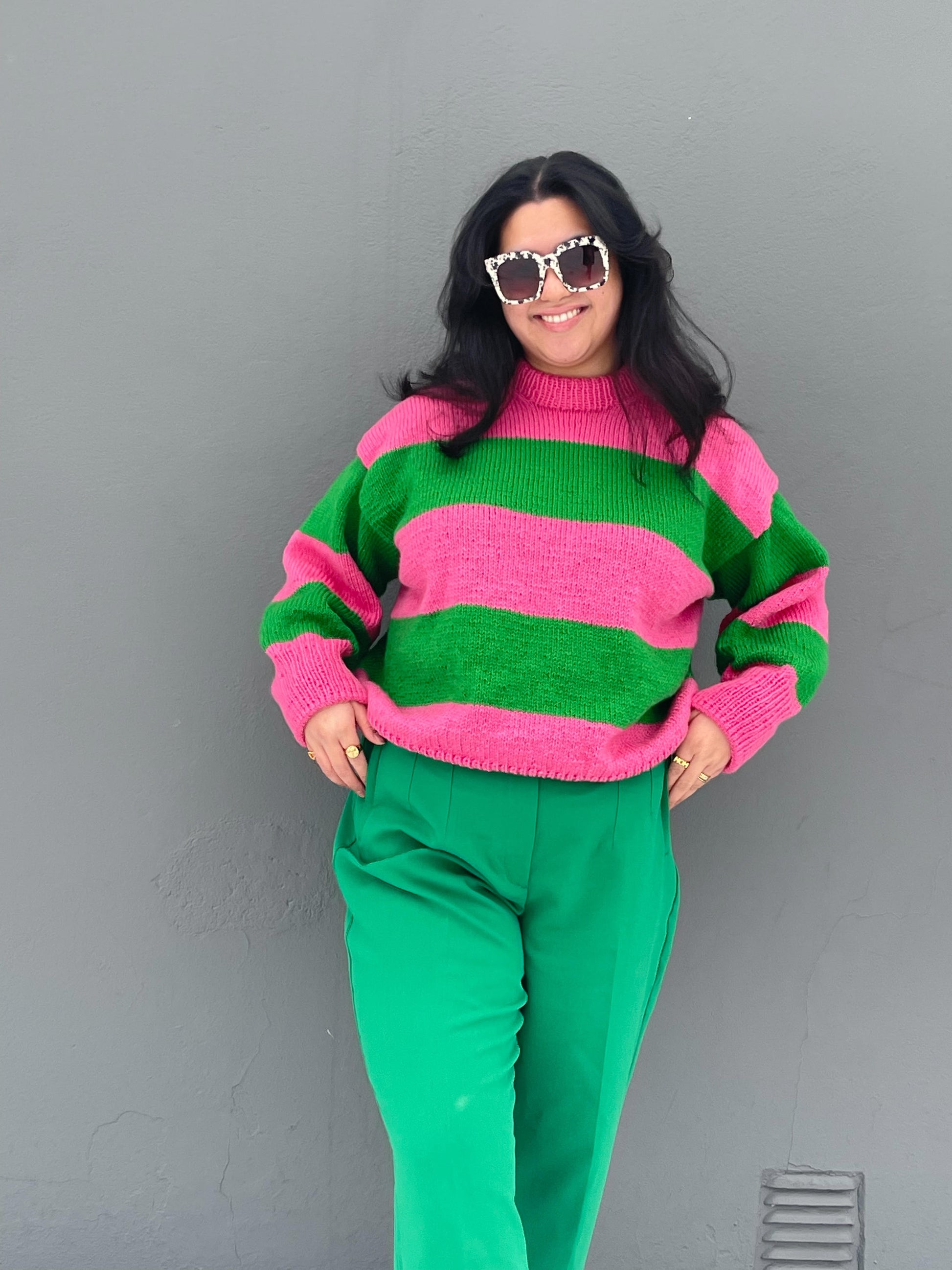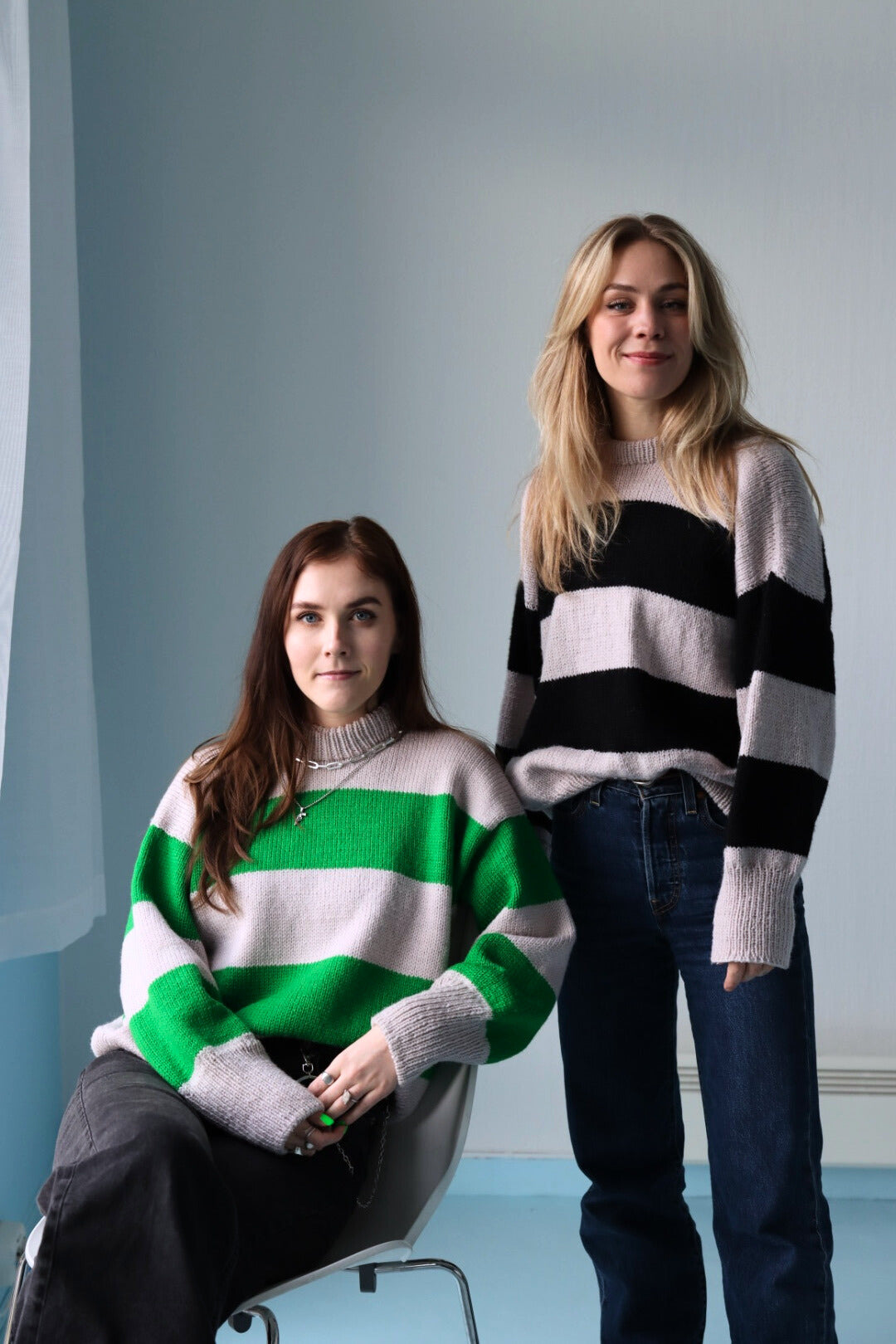 Genserene på bildene er strikket i fargene Jet Black/Pearly White og Bold Green/Pink Punch.