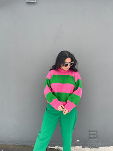 This sweater is worked top down. You start with the front pieces, whereafter the back piece is worked and then the body. You pick up stitches around the armhole openings for the sleeves, which are worked top down, too. The complete sweater is worked with stripes.