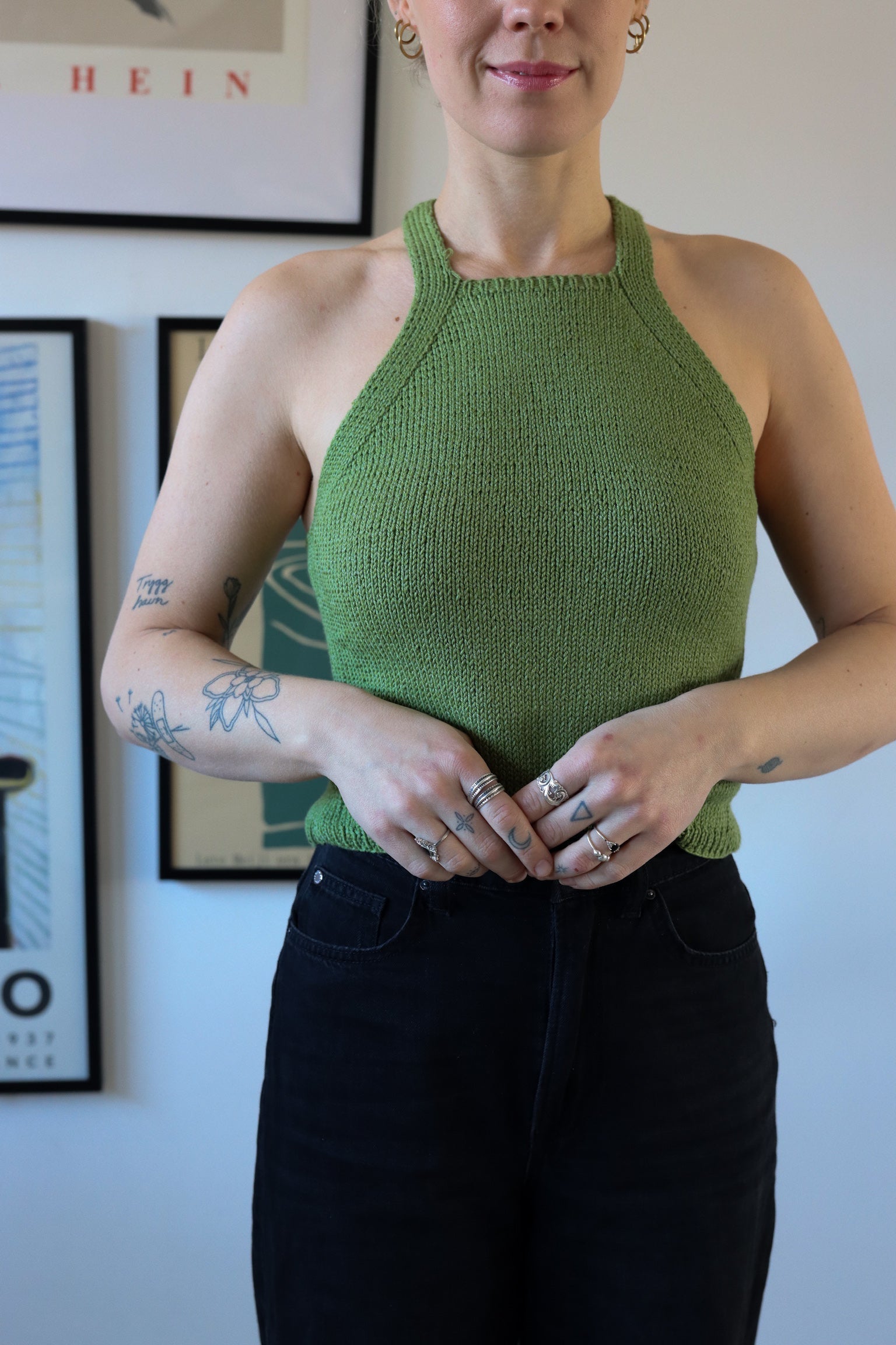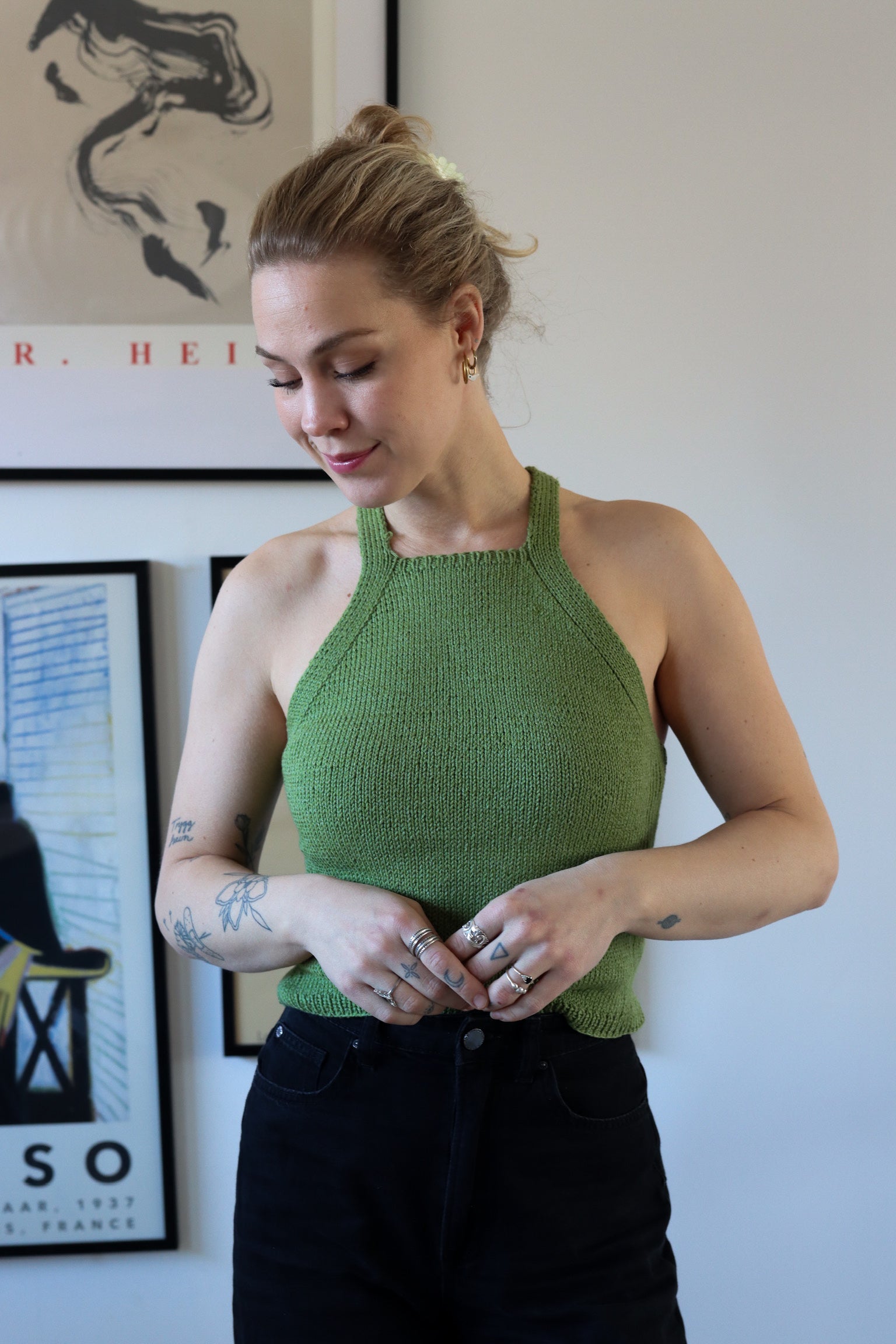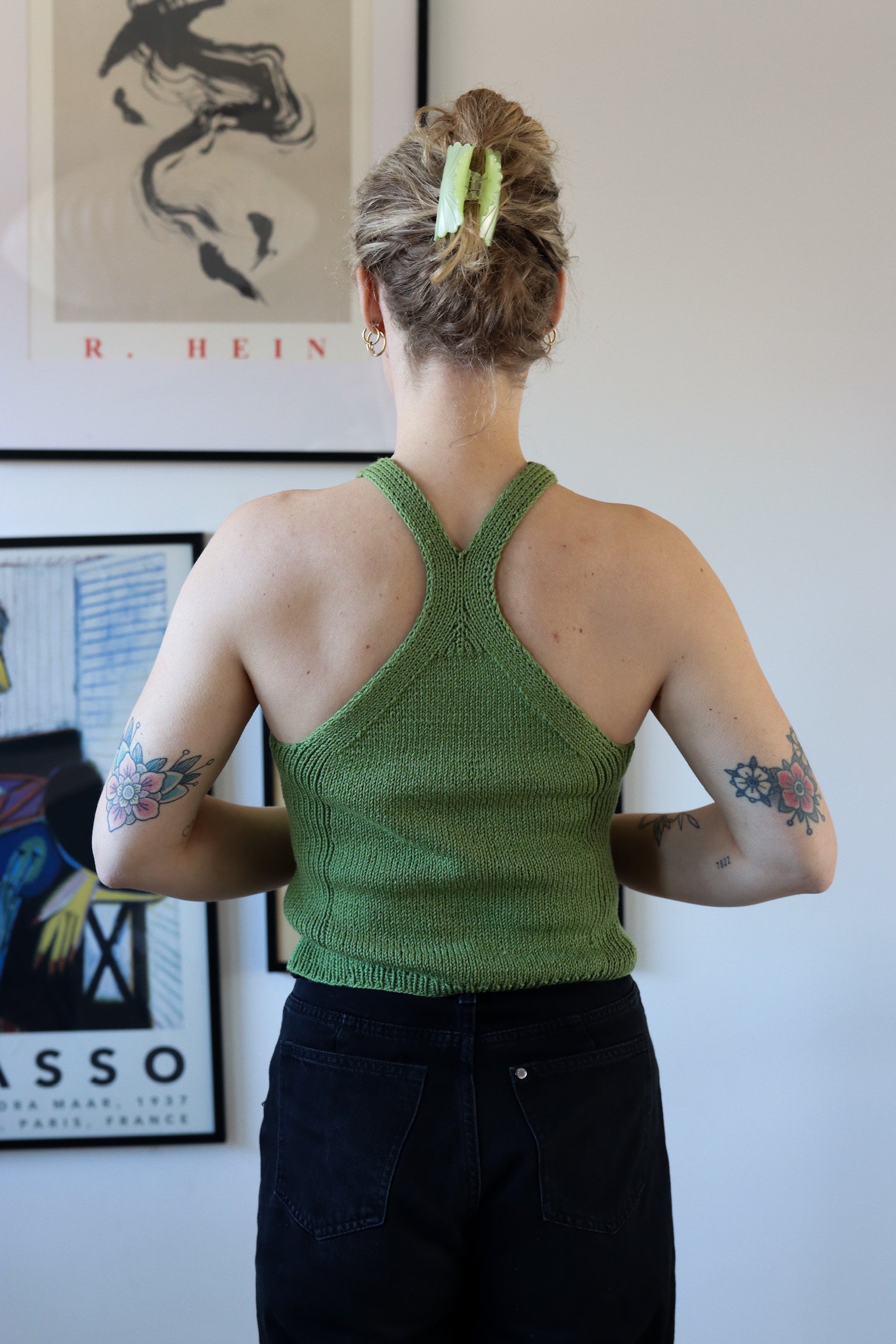 Basil topp er en enkel singlet med racerback rygg. Den er ettersittende, formflatterende og cropped i livet. Siden den strikkes ovenfra kan den med fordel prøves på underveis for den perfekte lengden til akkurat deg!
