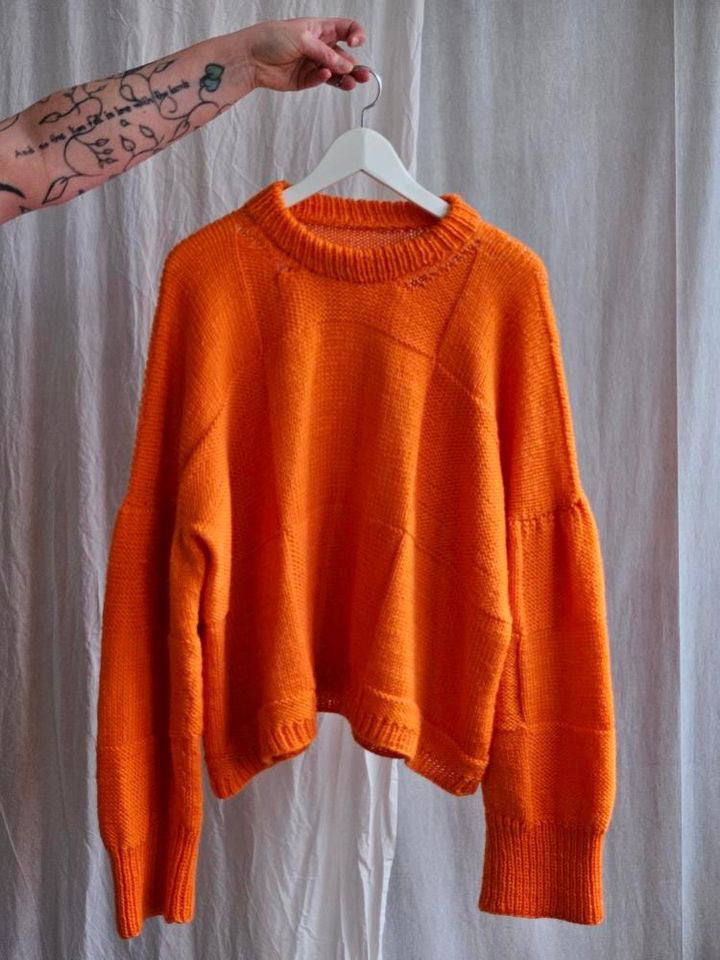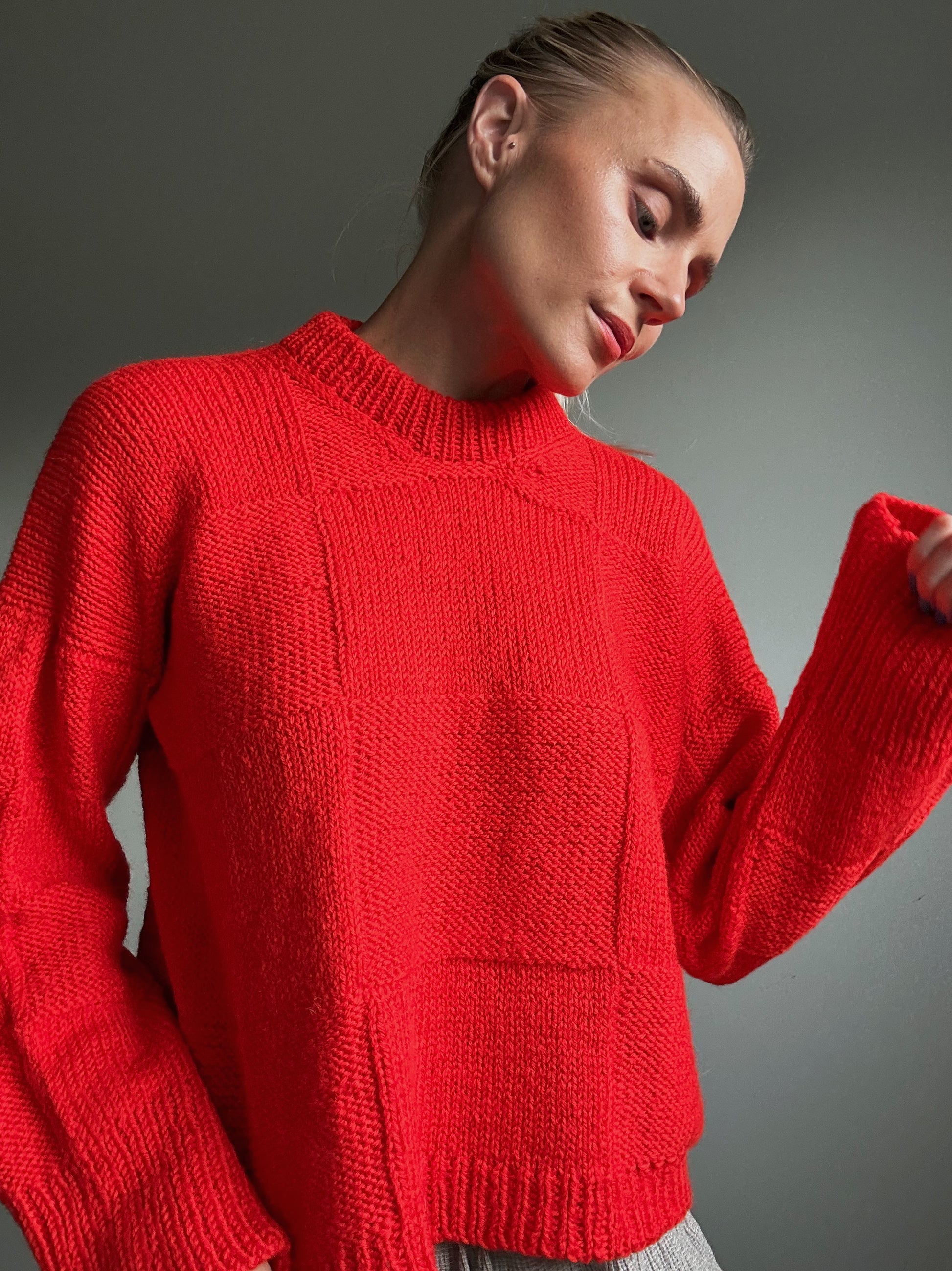 Genserene på bildene er strikket i fargene True Blue, Orange Pop og Fiery Red.