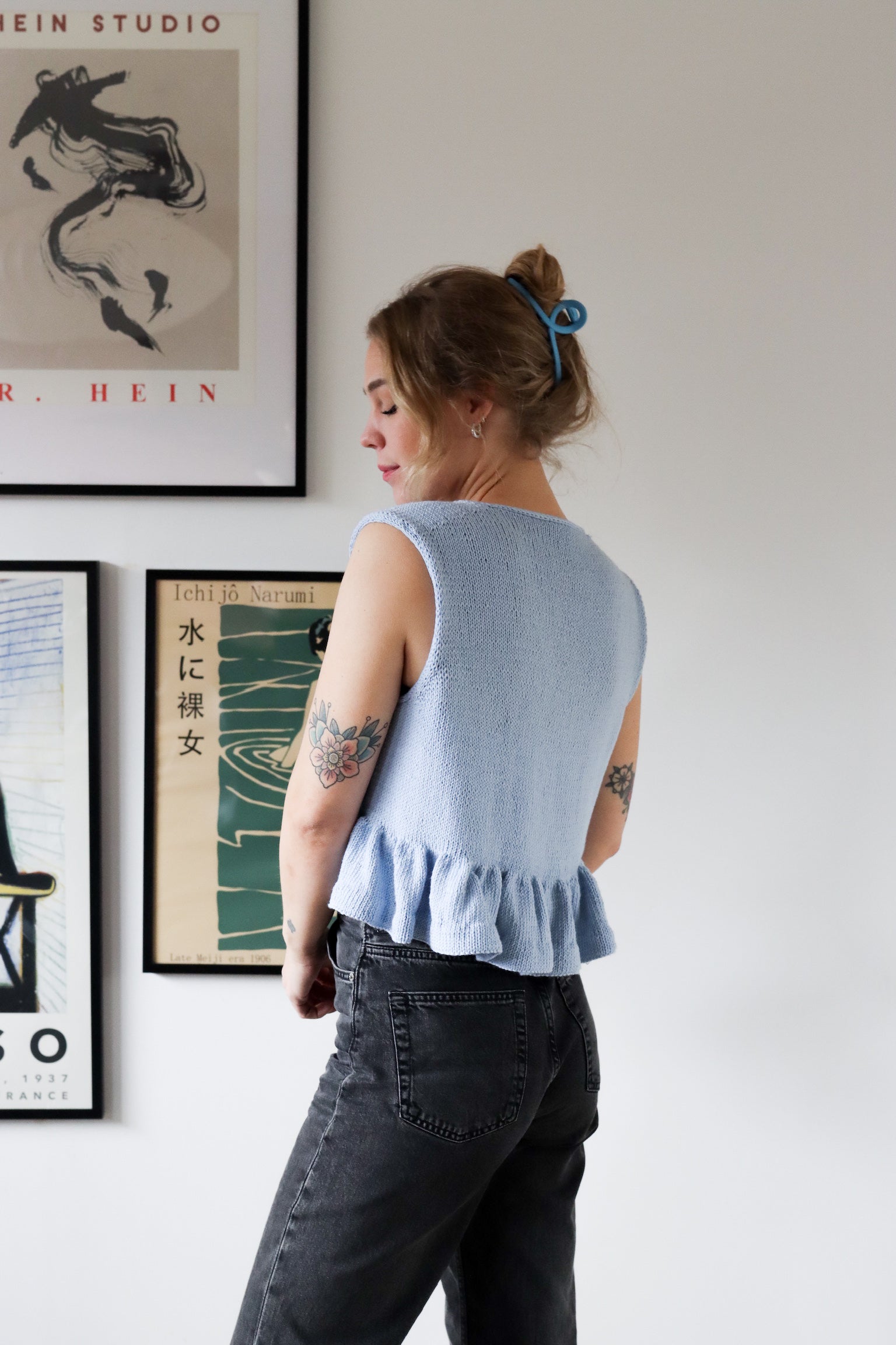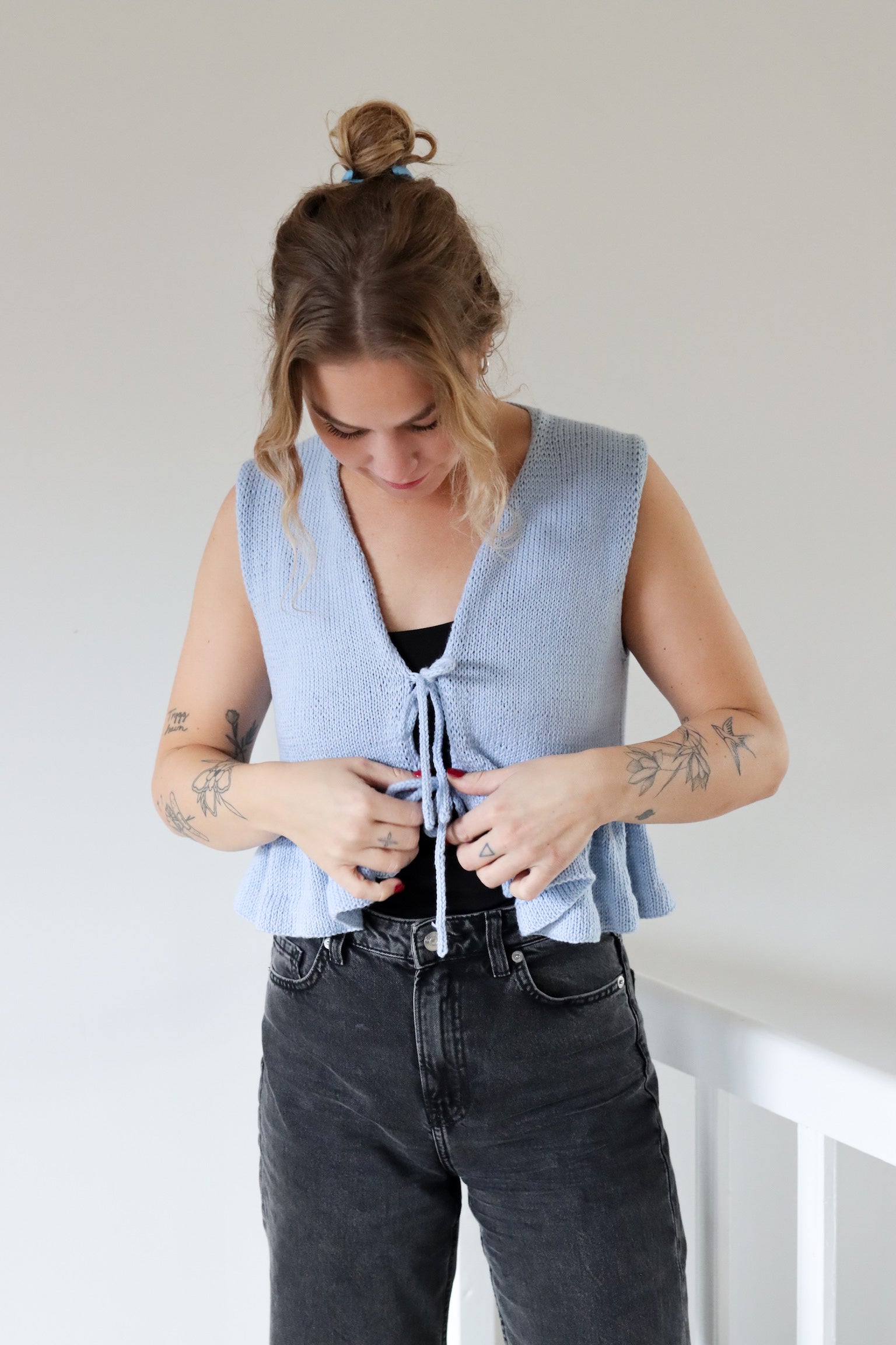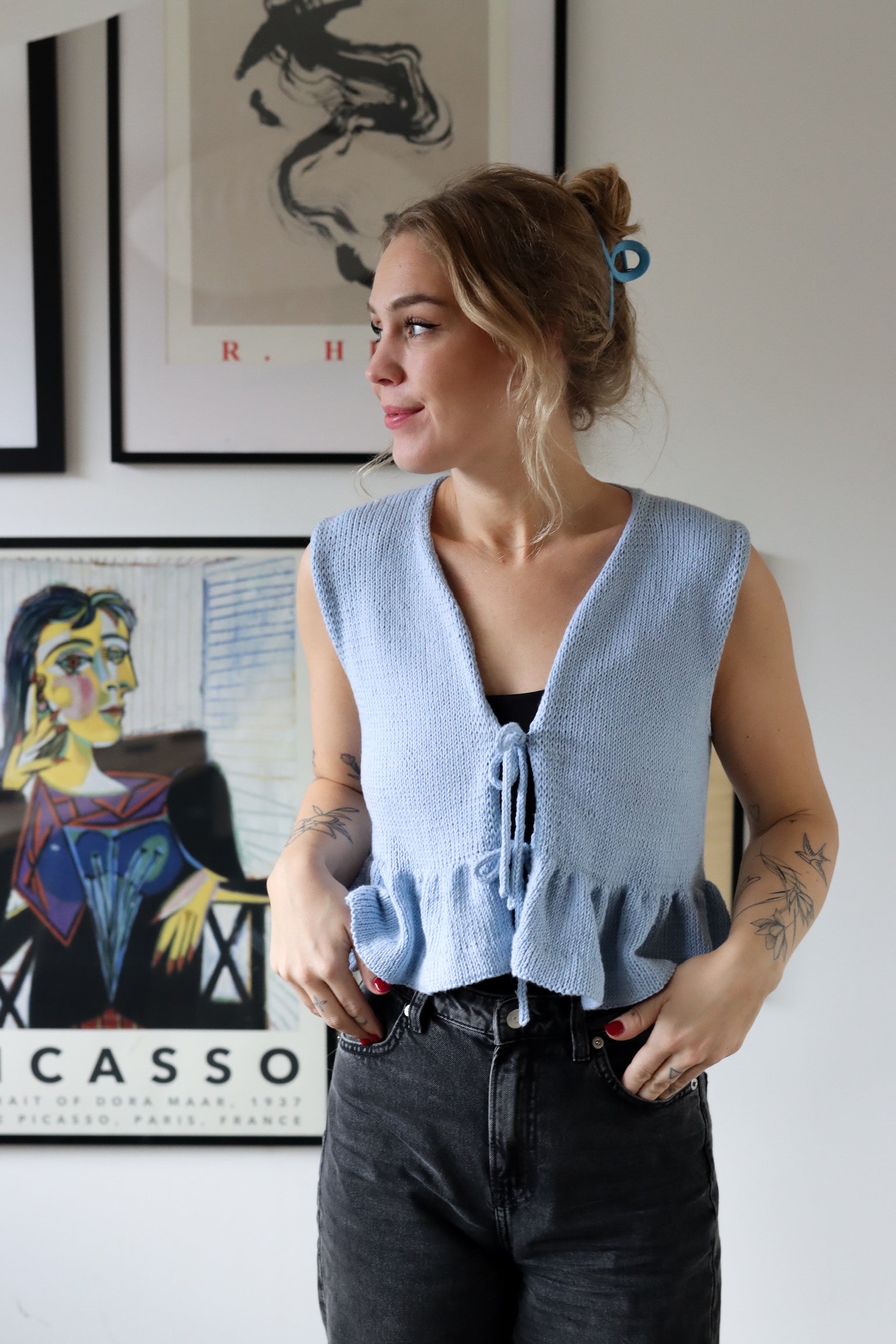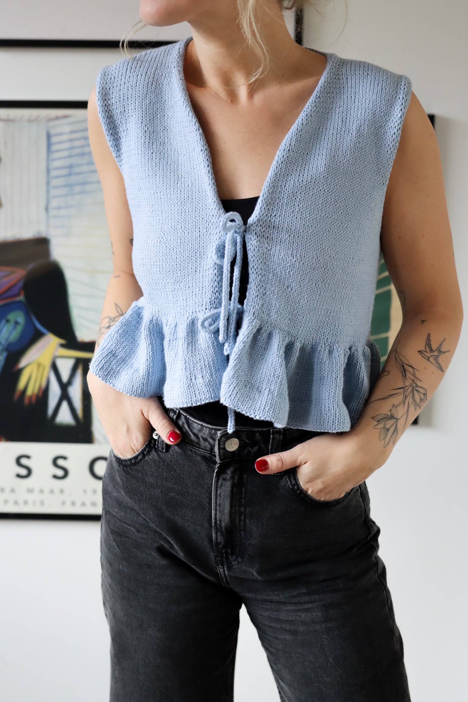 Blusen på bildet er strikket i fargen himmelblå.