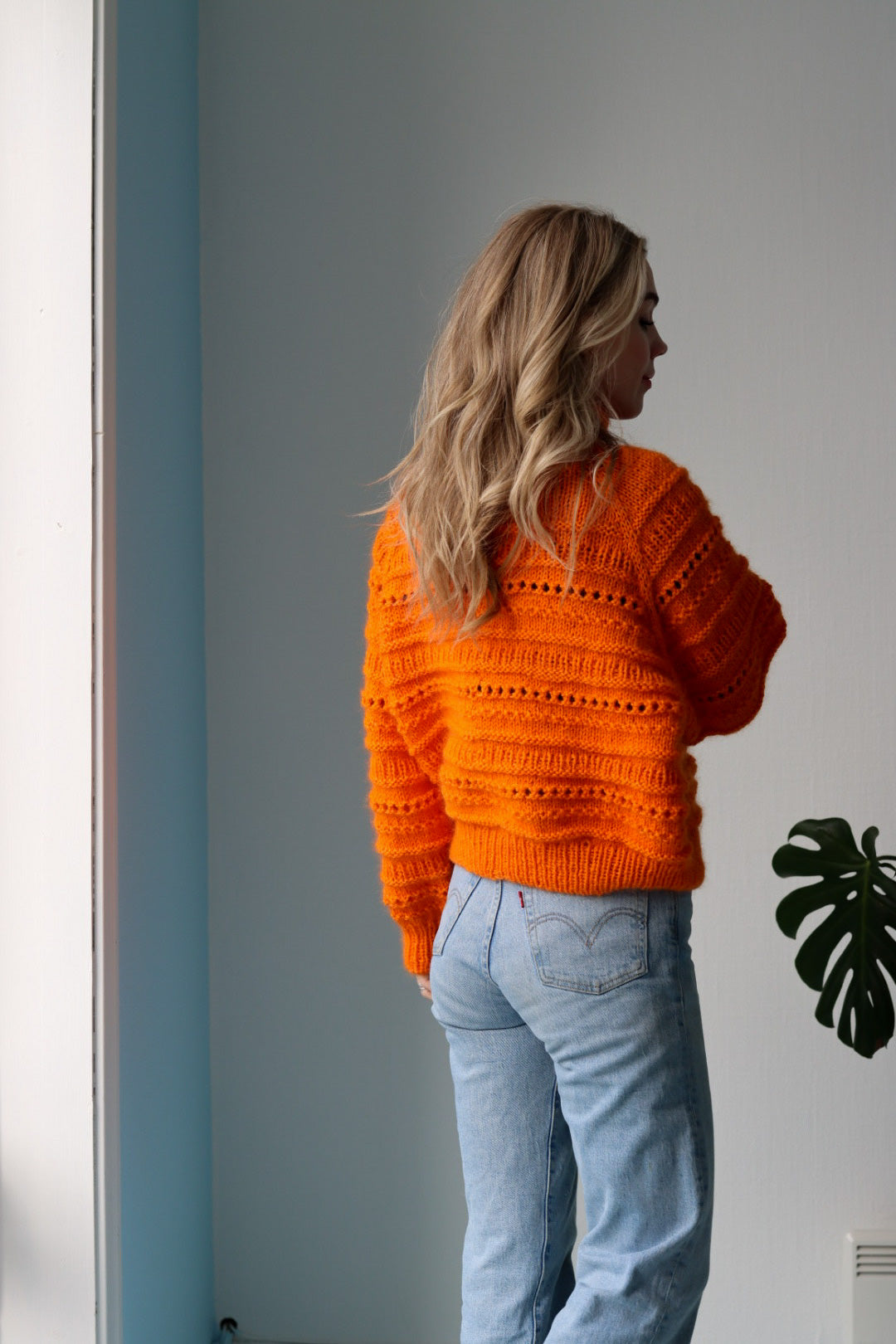 Genserene på bildene er strikket i fargene Orange Pop, True Blue og Bold Green.