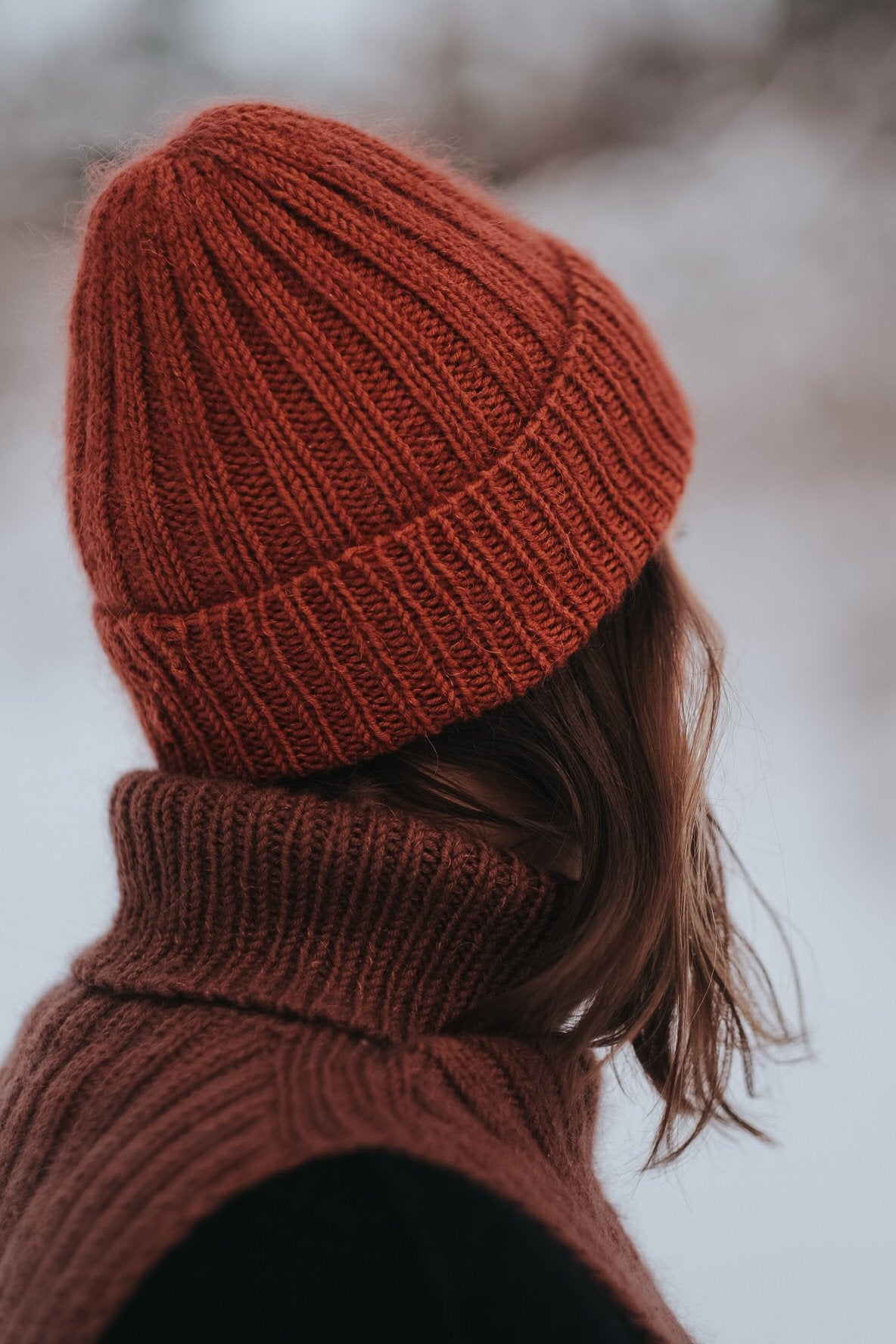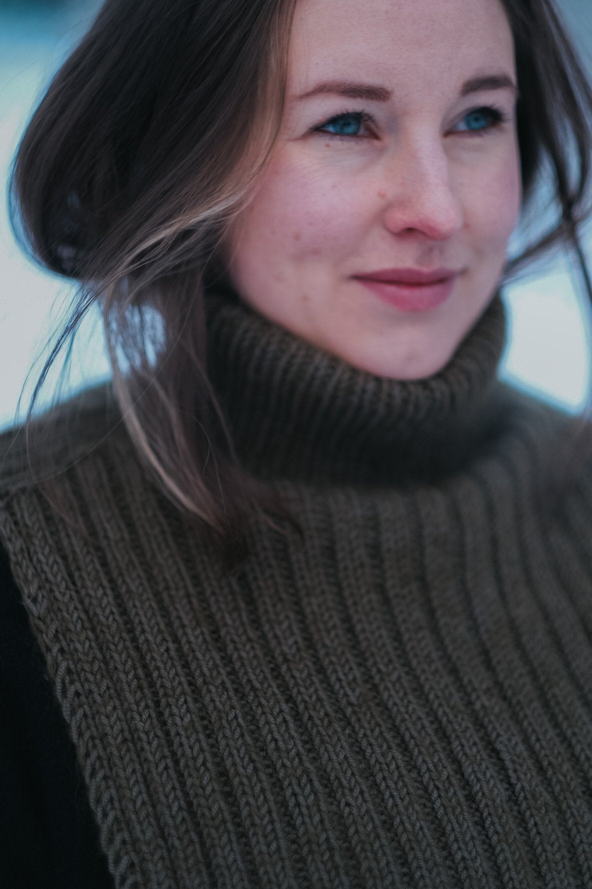 Brede Hals wird von oben nach unten gestrickt. Zuerst wird der Rollkragen im 1x1 Rippenmuster (1 re, 1 li) gearbeitet, bevor im weiteren Verlauf (2 re, 2 li) mit Schulterzunahmen gestrickt werden. Brede Hals wird dann mit verkürzten Reihen geformt.