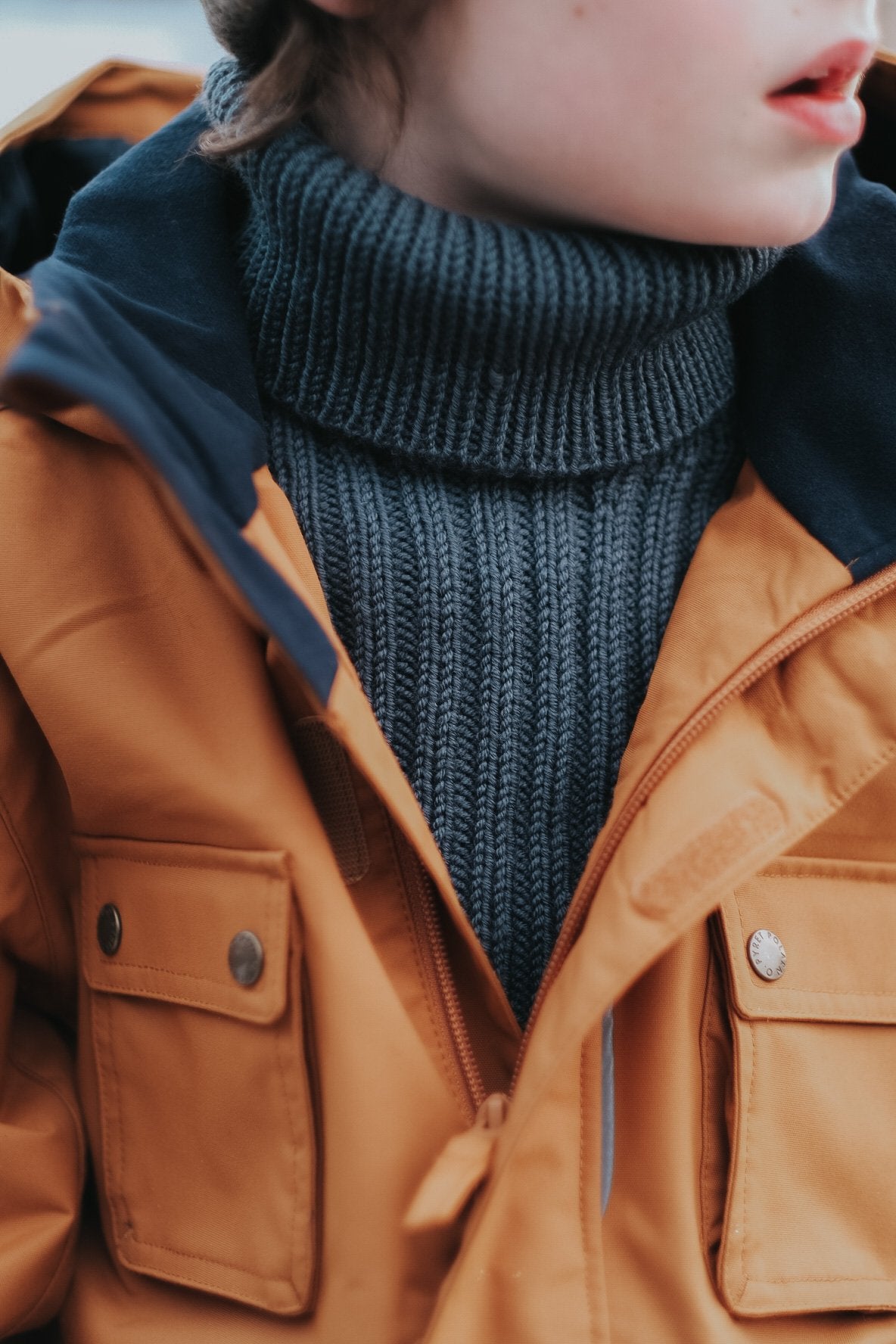 Bredehals strikkes ovenfra og ned. Halsen strikkes først i vrangbord (1r, 1 vr) (=brettekant) før den strikkes videre (2 r, 2 vr) samtidig som det gjøres skulderøkninger og halsen formes ved å strikke vendepinner.