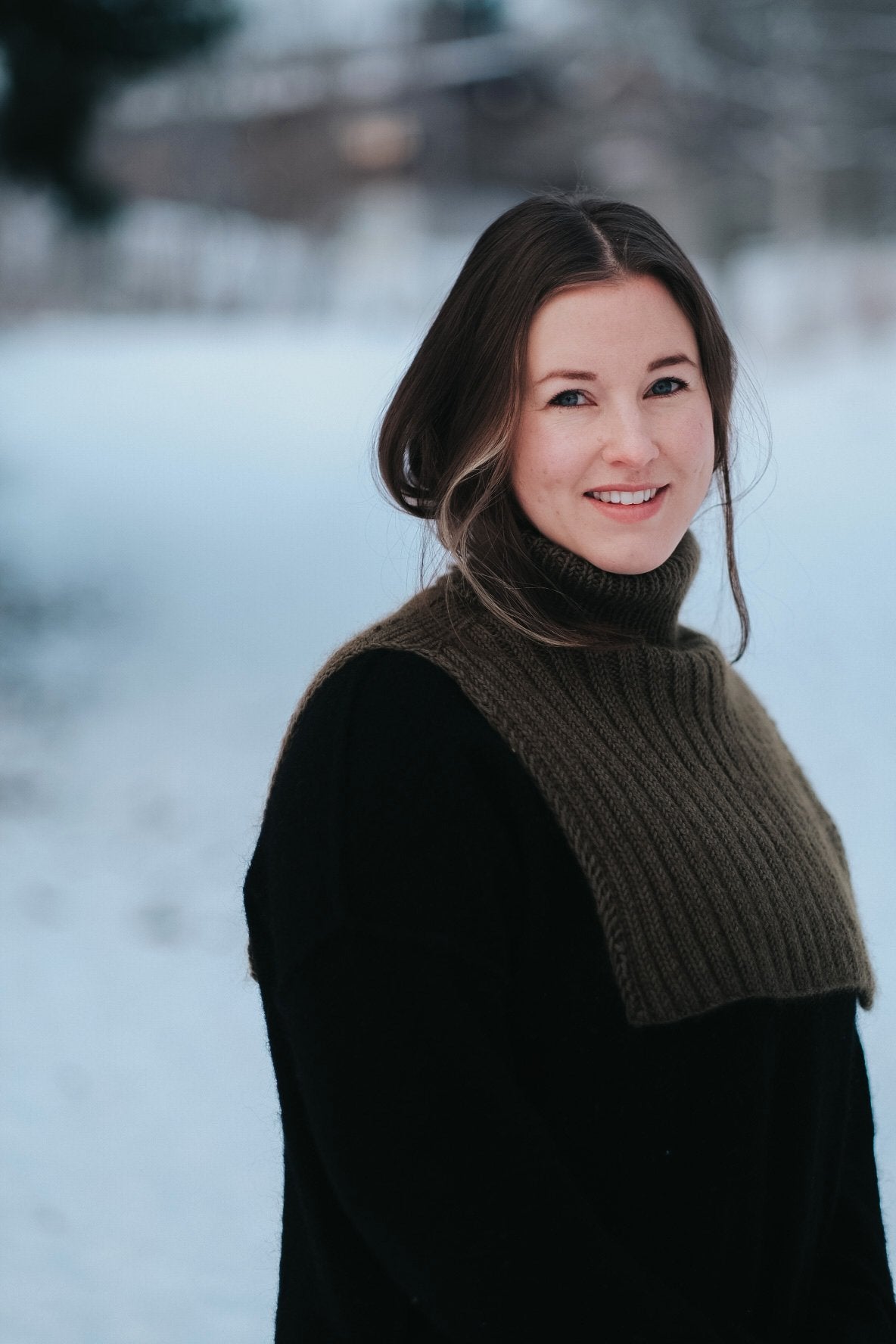 Bredehals strikkes ovenfra og ned. Halsen strikkes først i vrangbord (1r, 1 vr) (=brettekant) før den strikkes videre (2 r, 2 vr) samtidig som det gjøres skulderøkninger og halsen formes ved å strikke vendepinner.