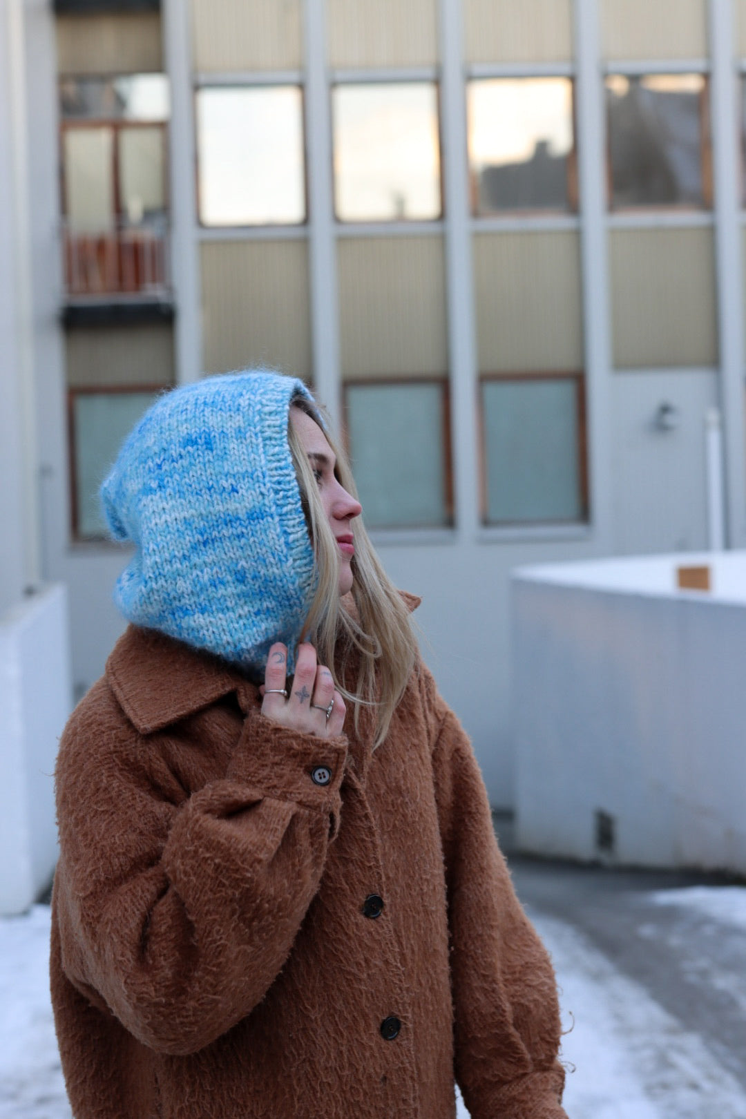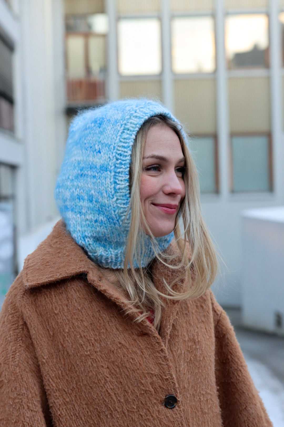 Chunky Balaklava er en oversized og deilig balaklava som varmer godt. Den strikkes i en tråd Troll sammen med en tråd Chunky Mohair. Den strikkes ovenfra og ned i glattstrikk frem og tilbake med vrangbord i kantene.