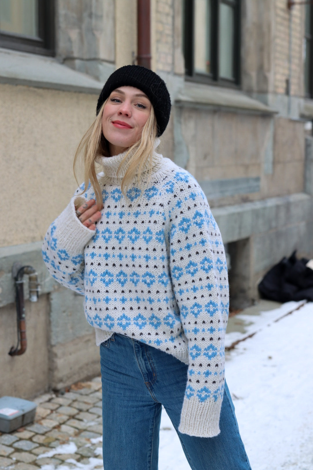 Norasweater strikkes ovenfra og ned, med raglanøkning og mønster hele veien. Mønsteret er lettlært og sitter fort i fingrene! Genseren strikkes med høy hals som brettes utover. Genseren har en løs og ledig passform.
