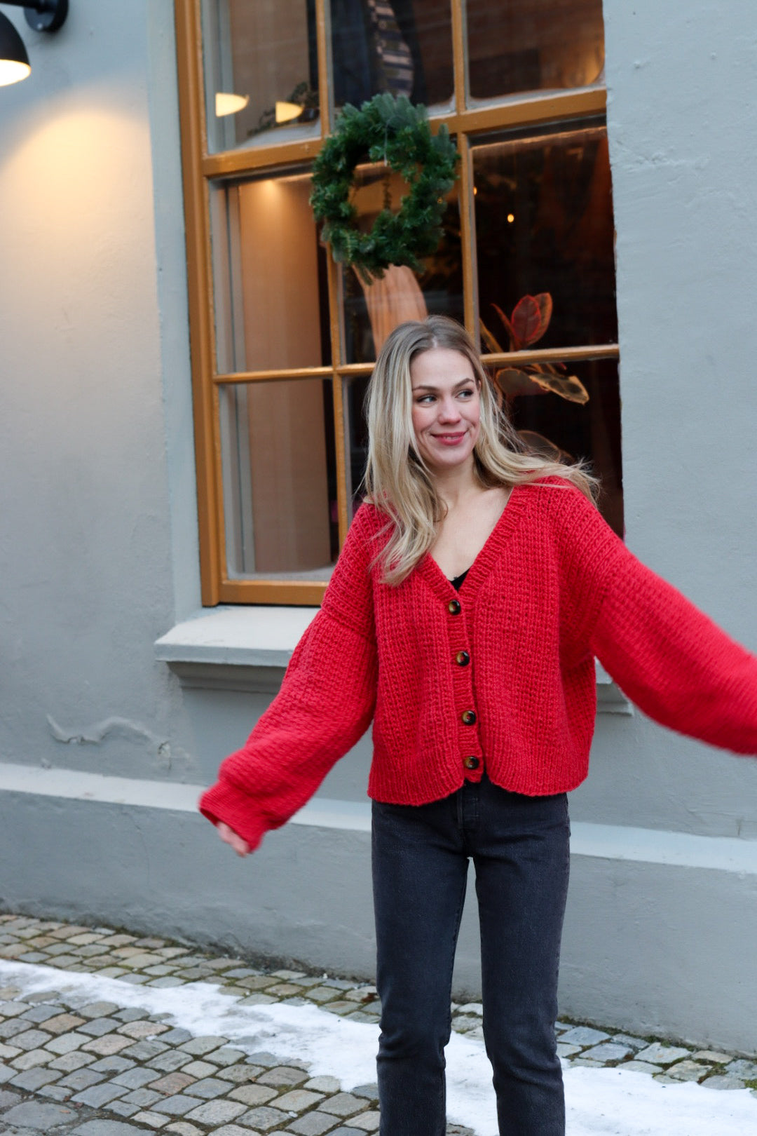 Jakken på bildet er strikket i fargen Sweet Cherry.