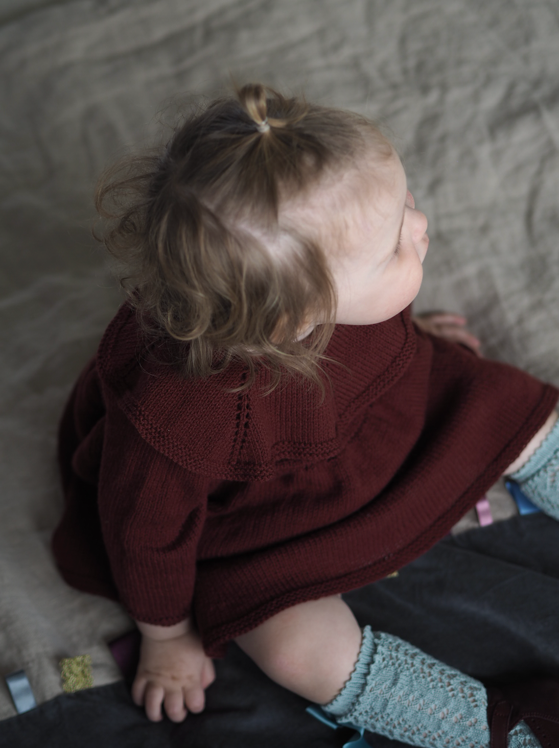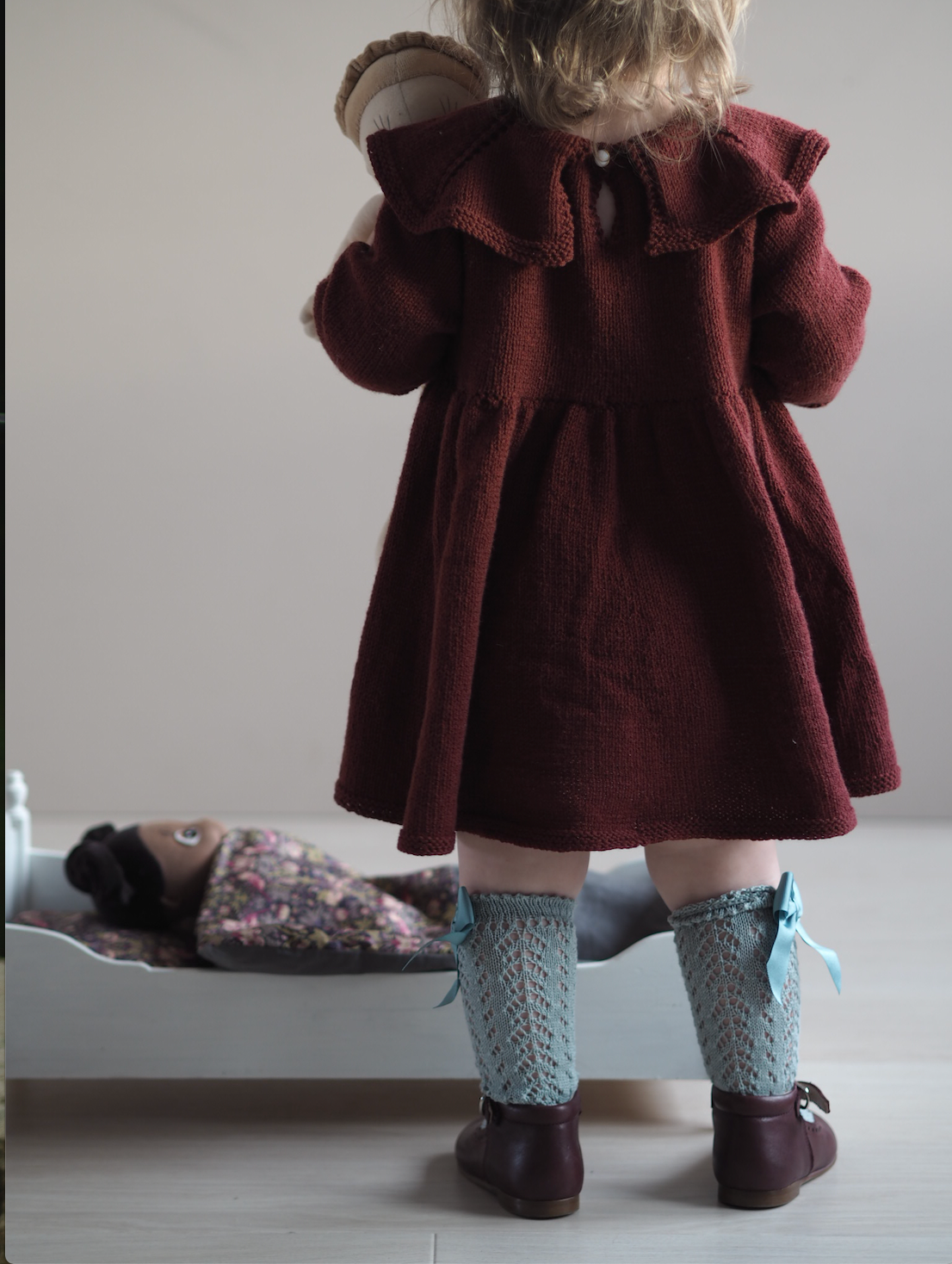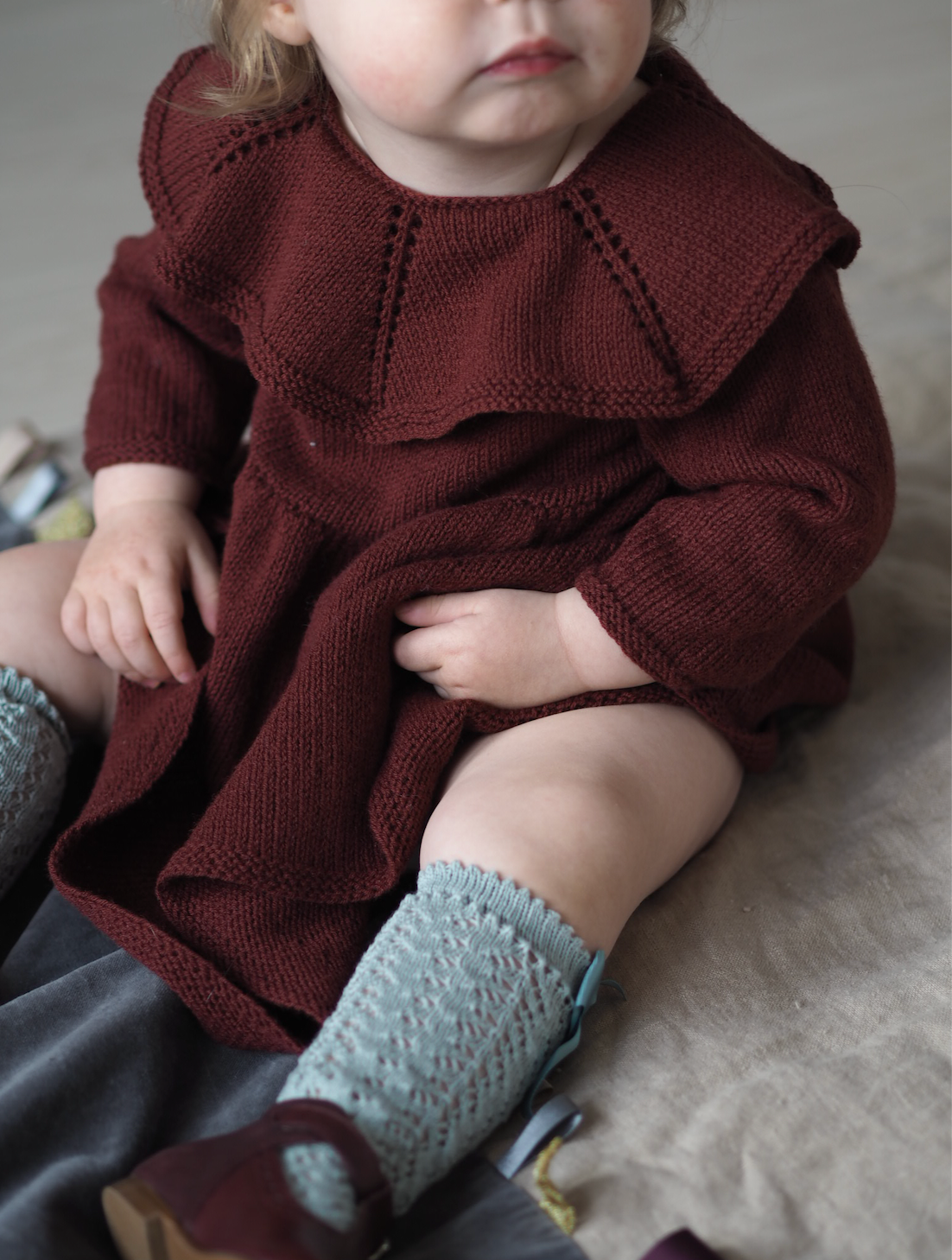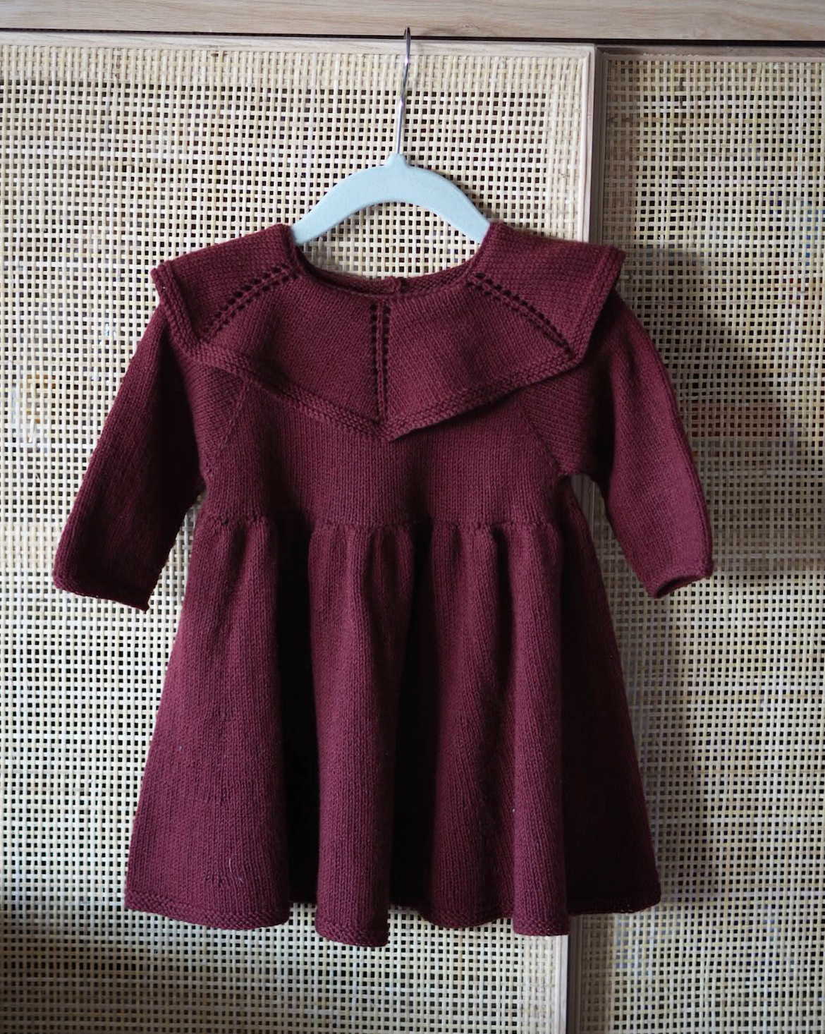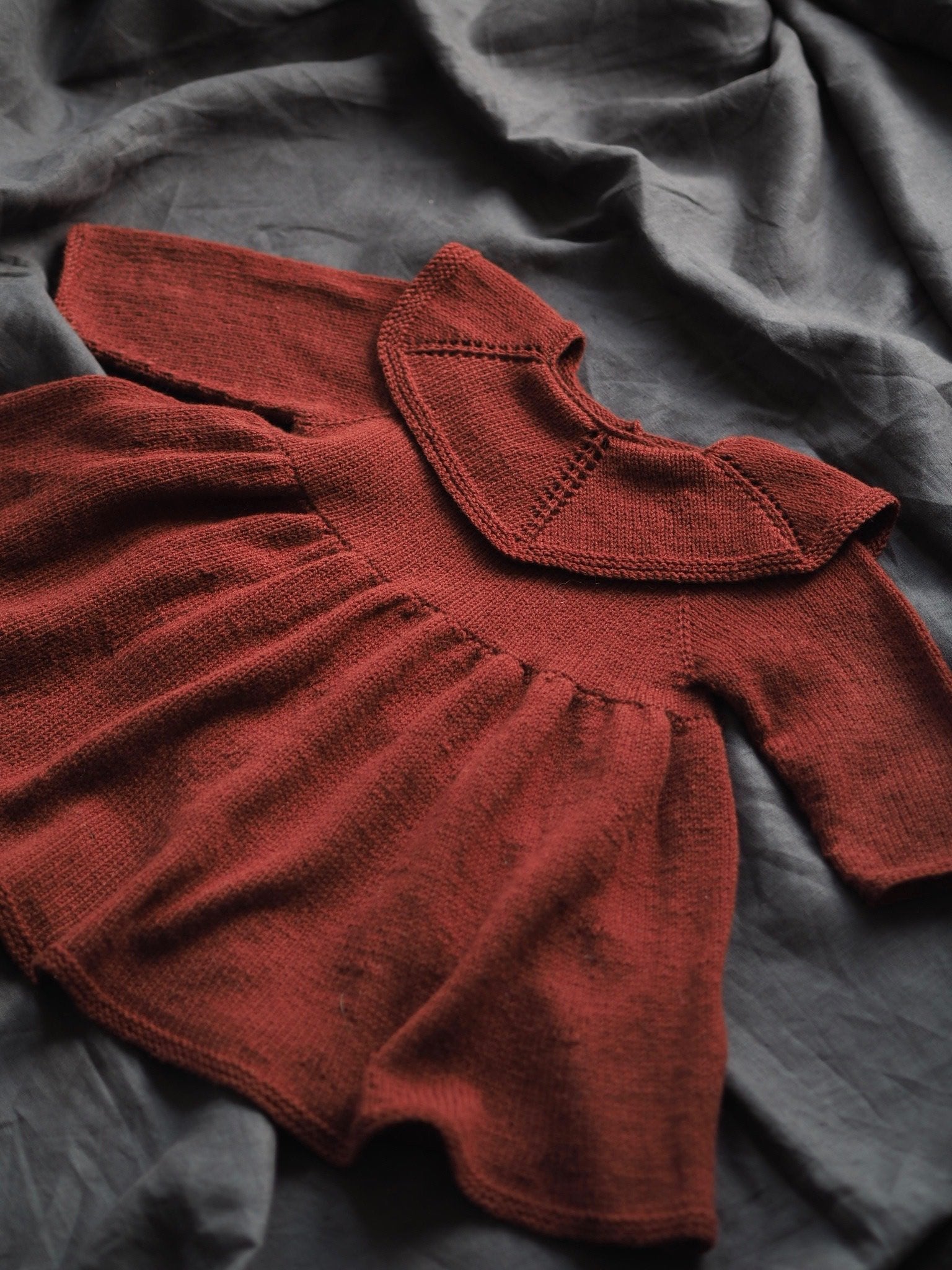Denne kjolen strikkes ovenfra og ned med raglanøkninger. Etter at den øvre delen er ferdig, tar du opp masker for å strikke skjørtet. Som et siste trinn strikkes kragen ved å plukke opp masker fra halsen.