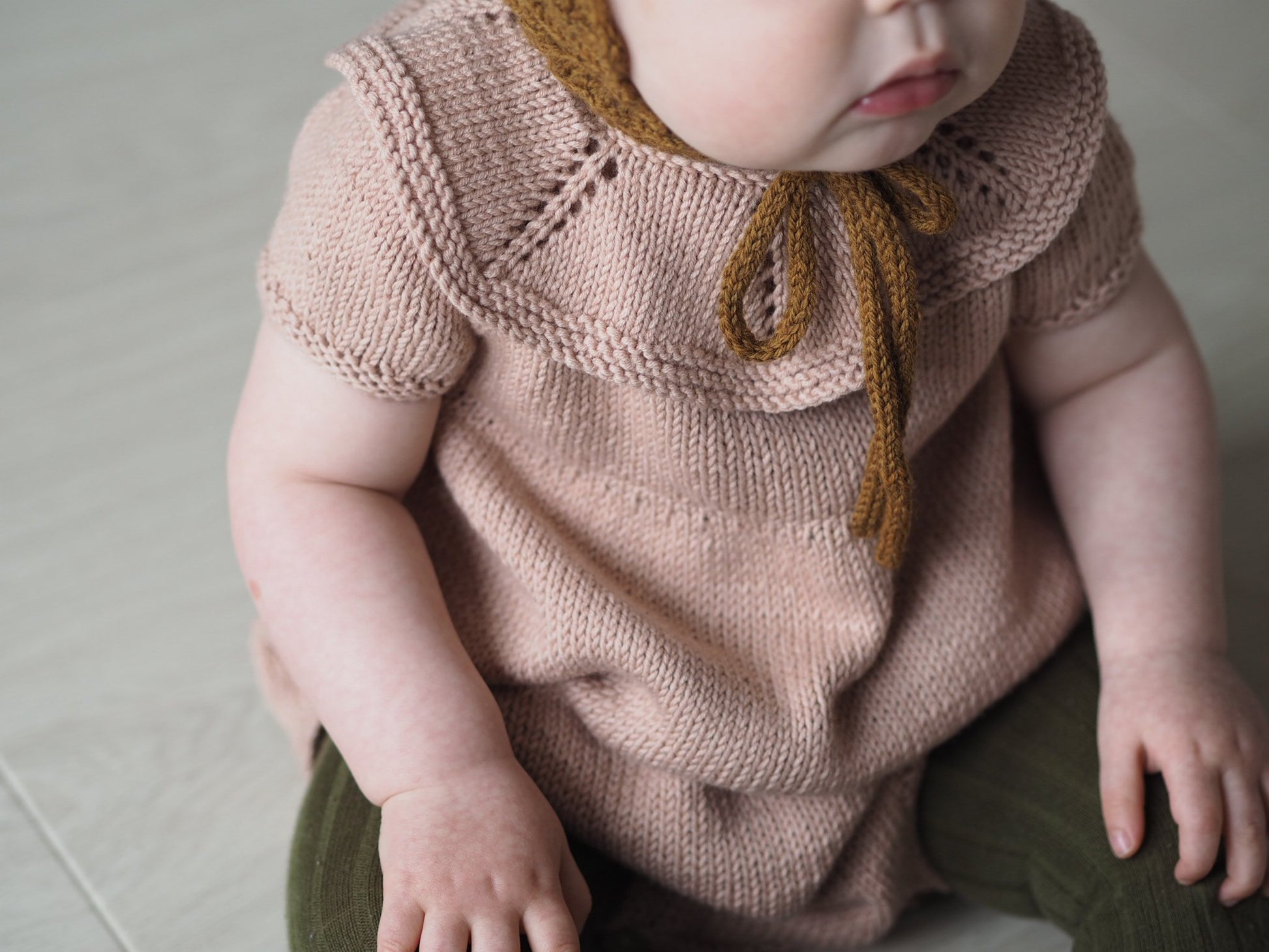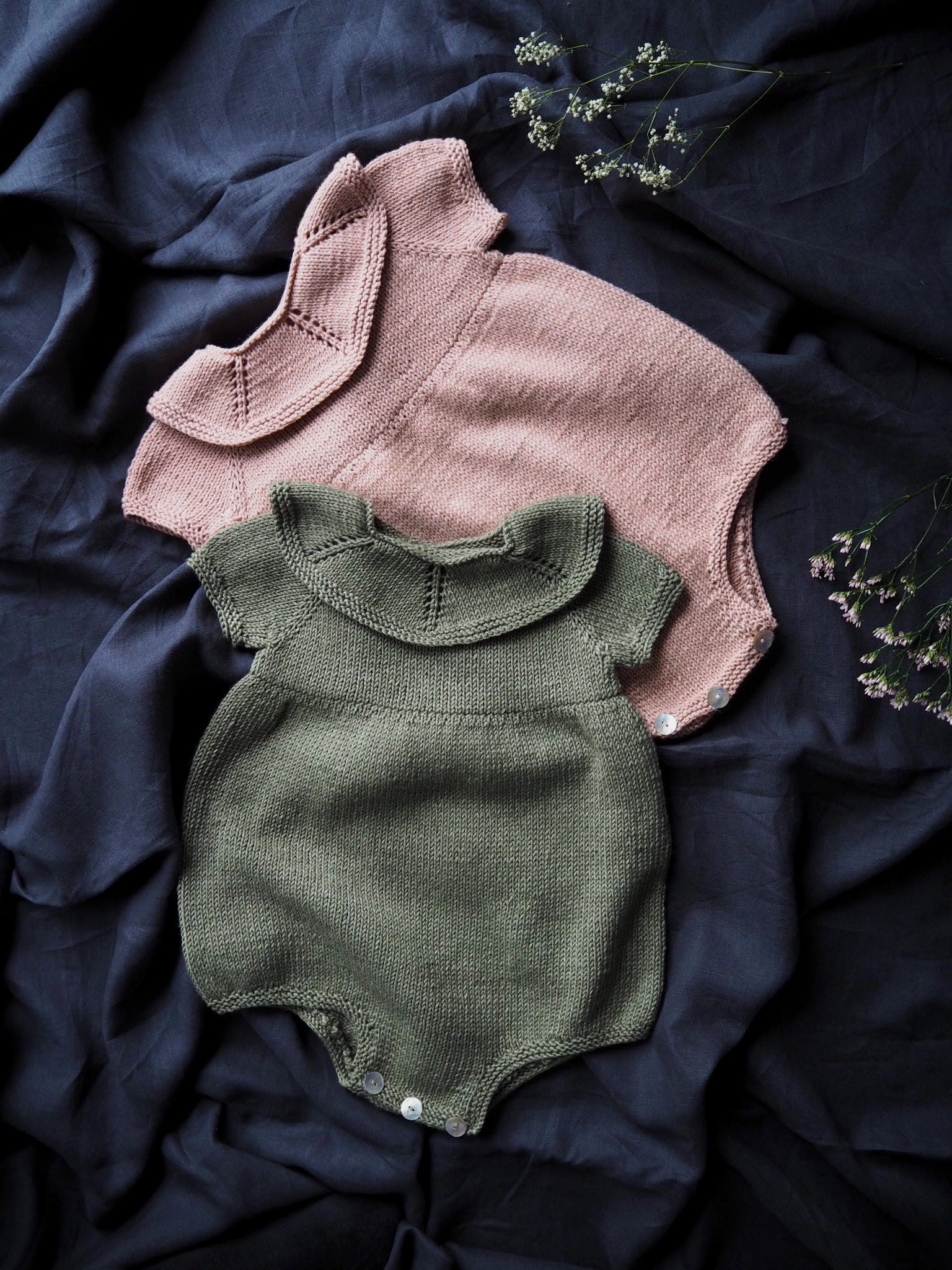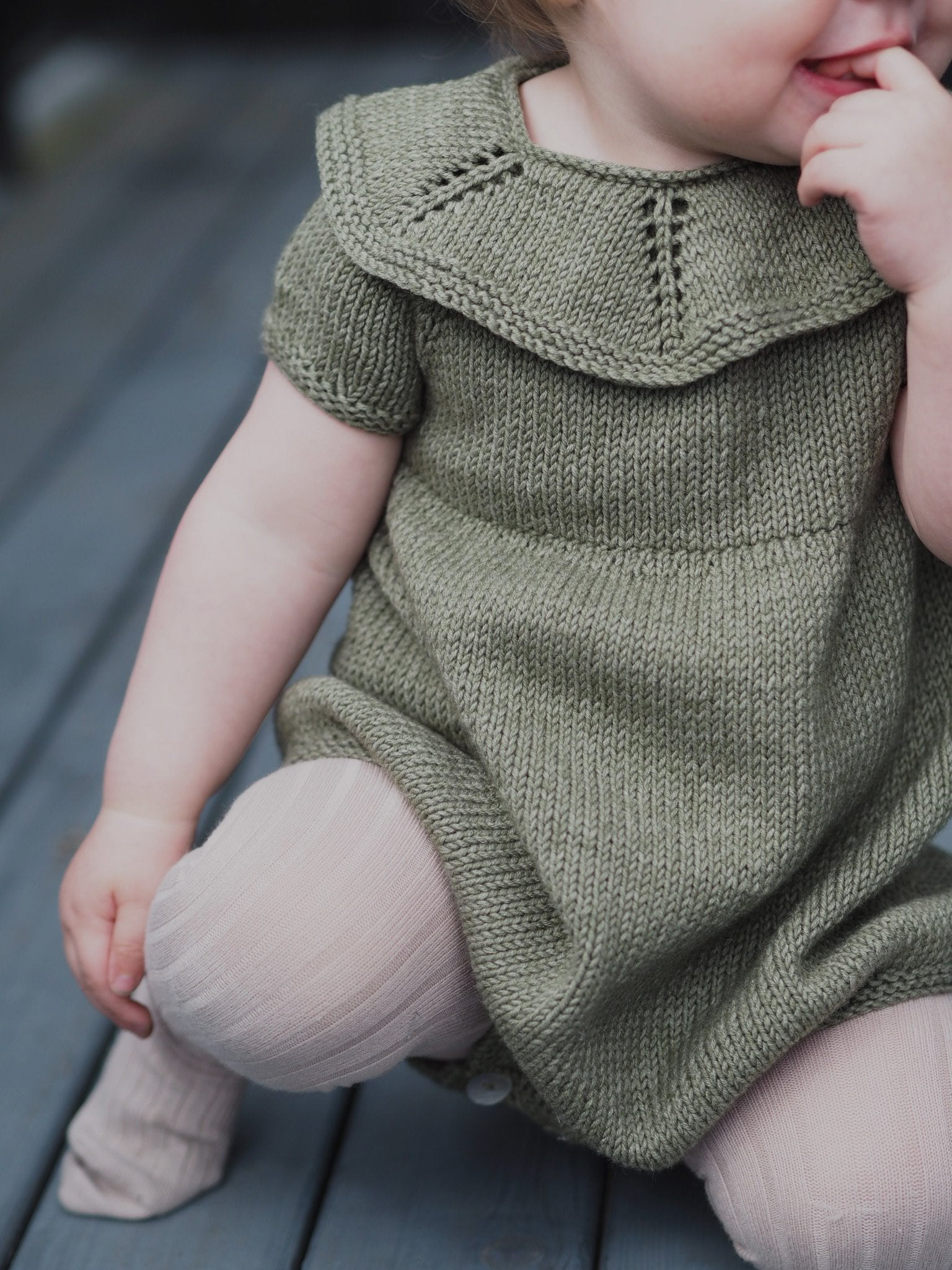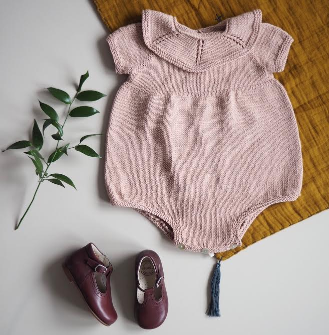 Romperen strikkes ovenfra og ned med raglanøkninger. Til å begynne med strikkes den flatt for å gjøre det mulig å lage åpningen til hodet og knappebåndet bak. Den strikkes så rundt.