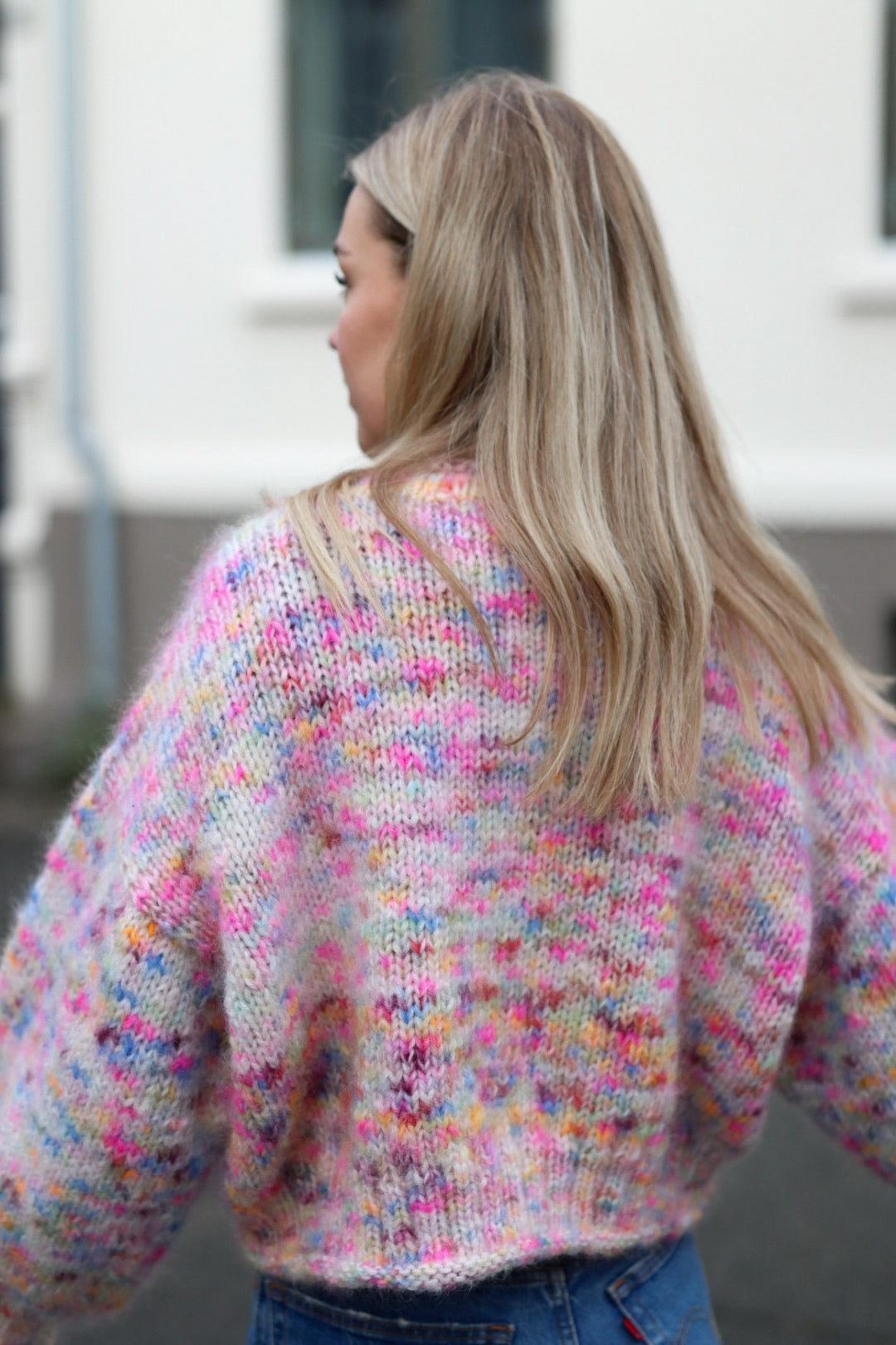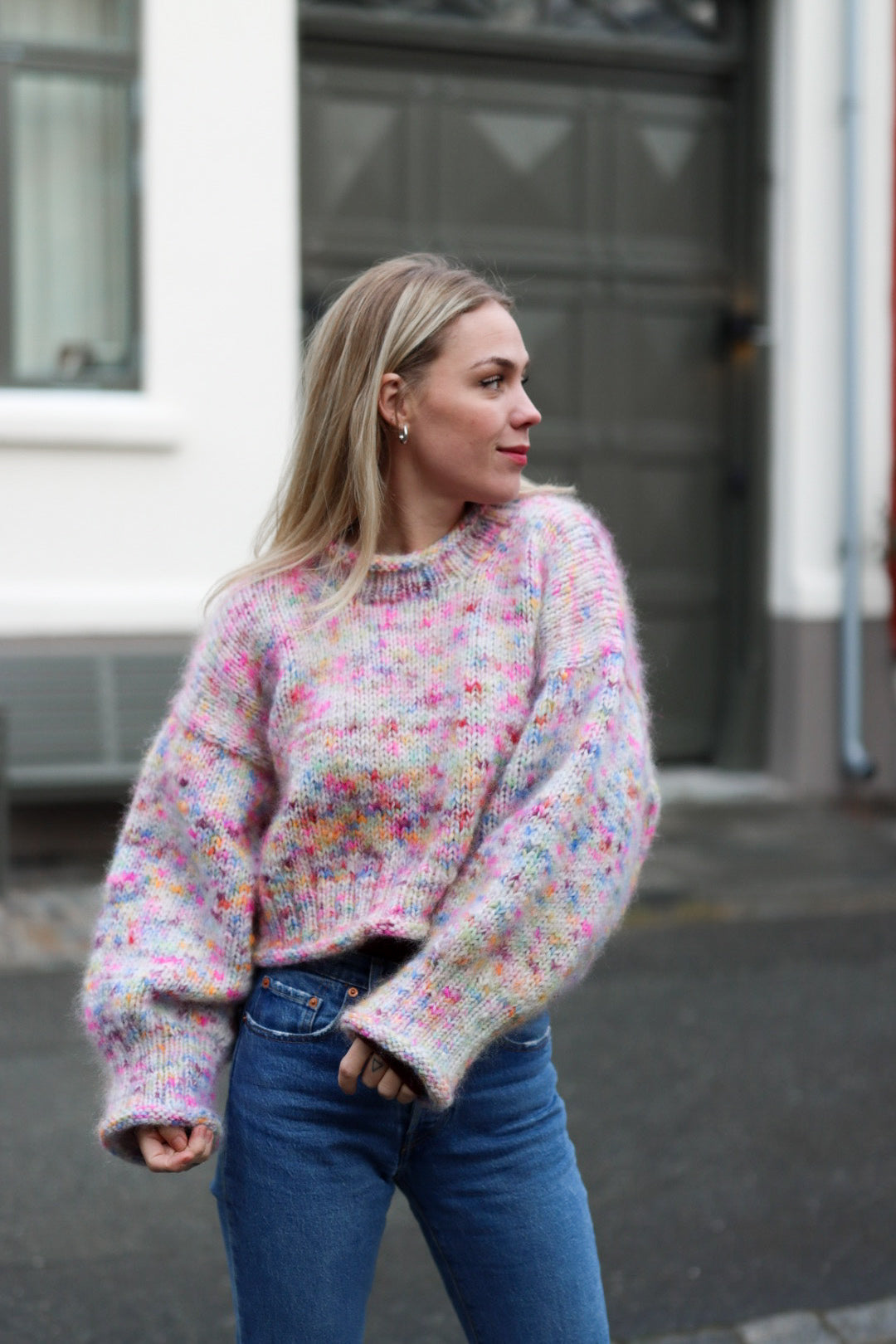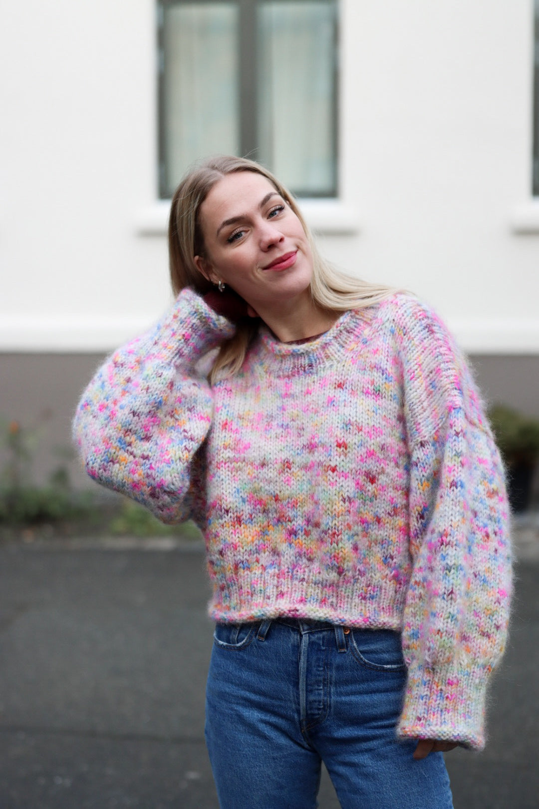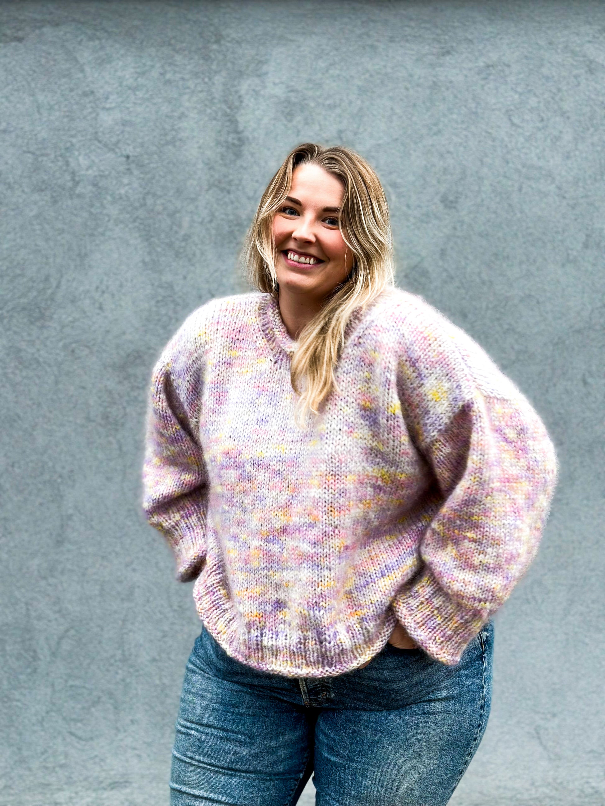 Confetti Sweater er en god og varm genser som strikkes kjapt på pinne 8 med en tråd Chunky mohair og en tråd Supreme Wool holdt sammen. Passformen er oversize og avslappet. Den strikkes ovenfra og ned så du enkelt kan tilpasse lengden etter eget ønske. Ermene plukkes opp i ermehullet og strikkes rundt.