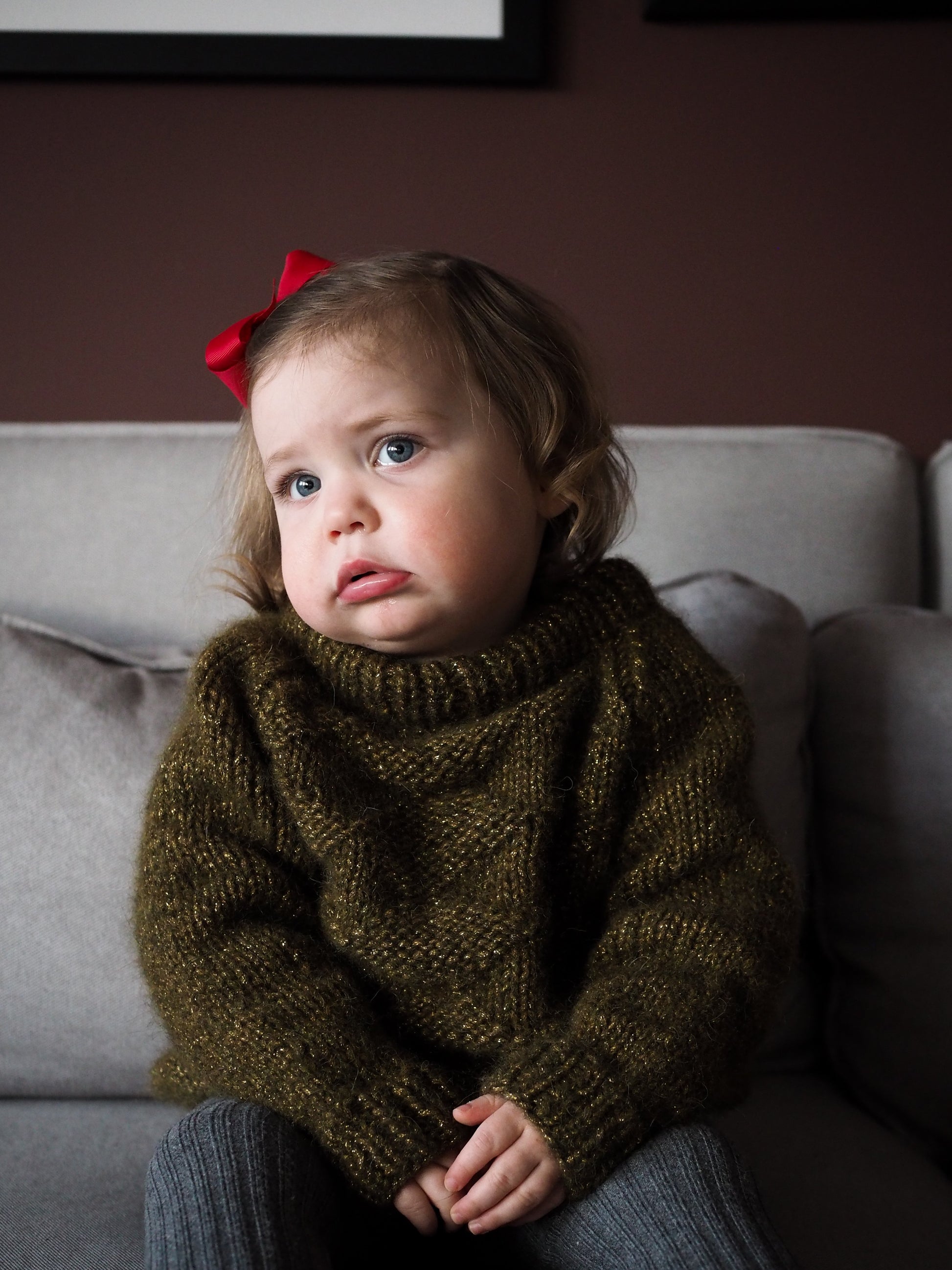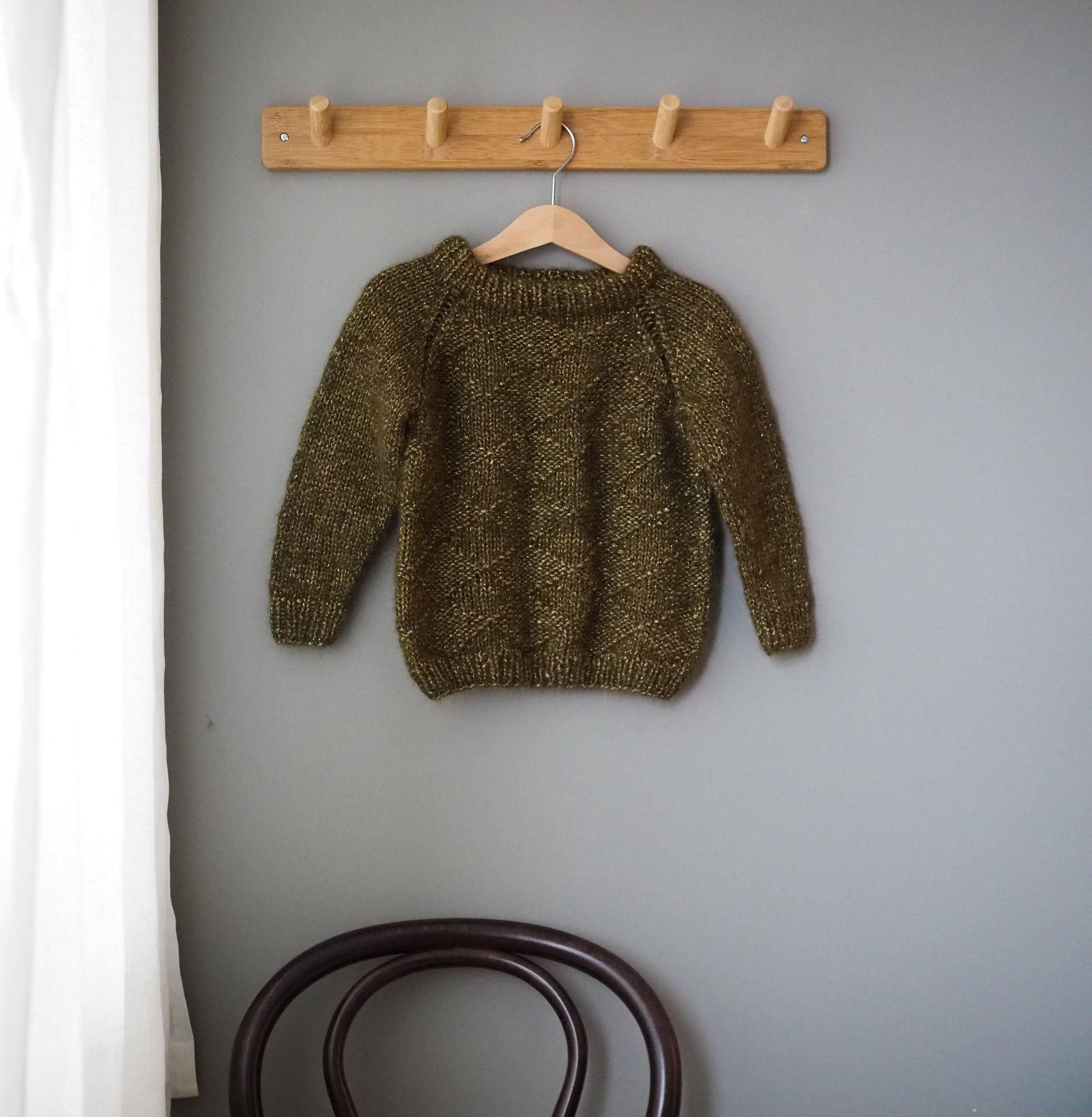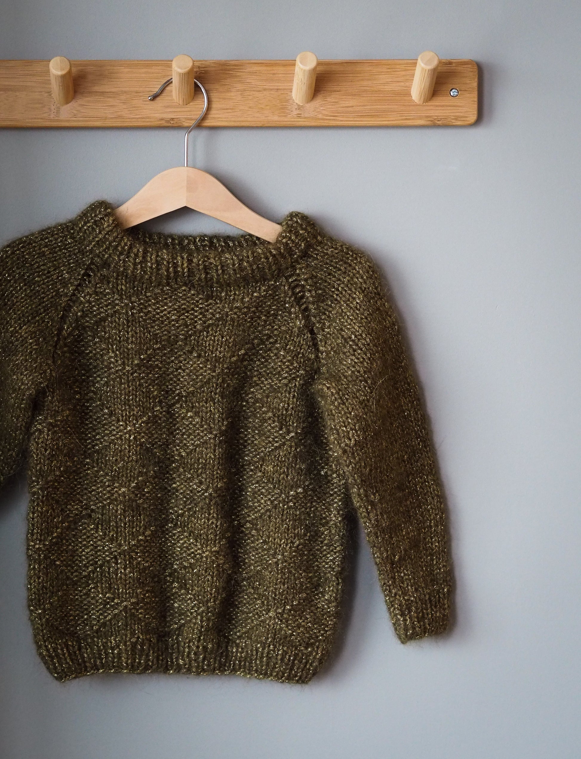 Diamantgenser er en lett oversized barnegenser på tykke pinner som strikkes nedenfra og opp med raglanfellinger.