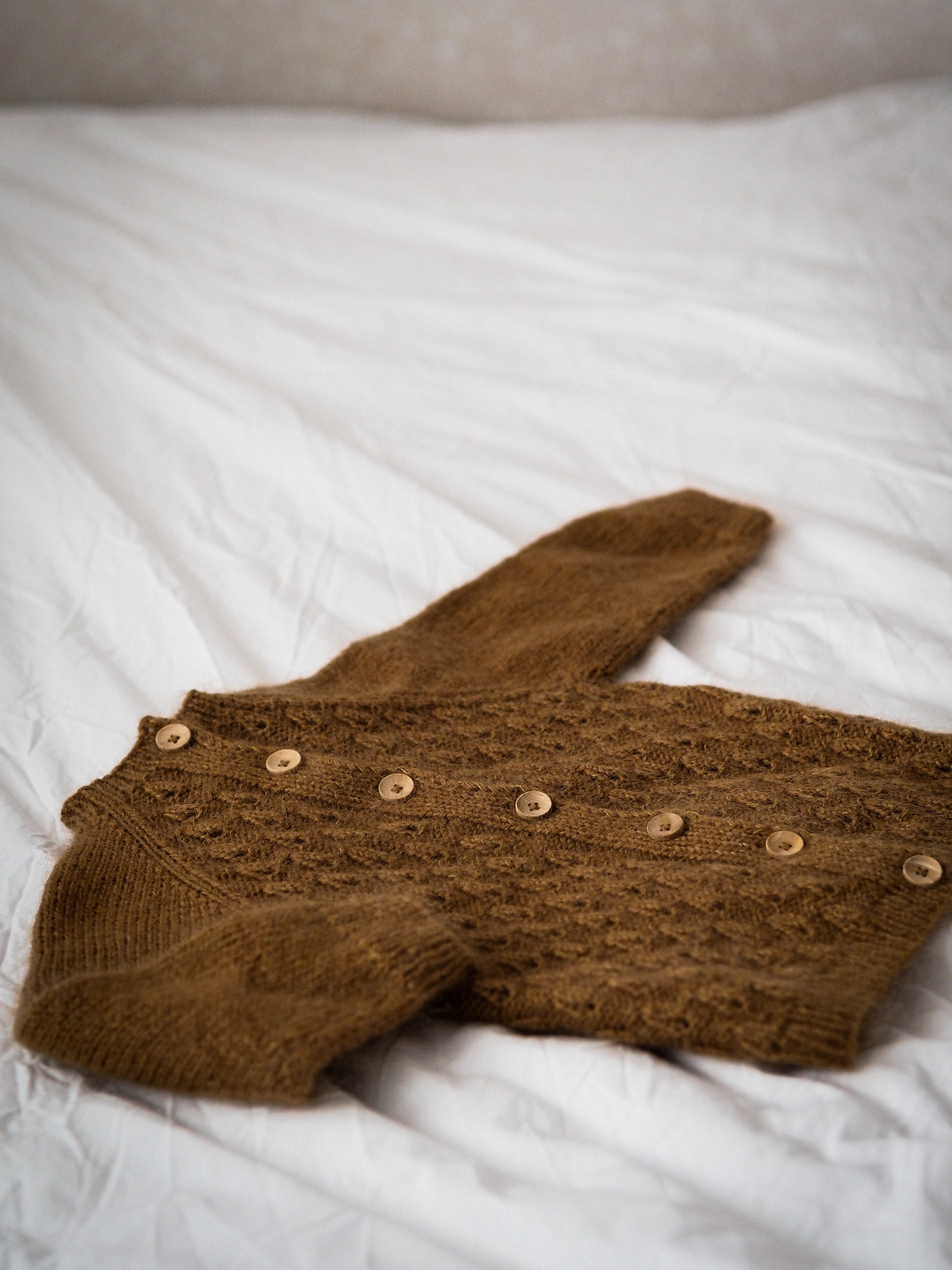 Det jobbes nedenfra og opp. Ermene og bolen strikkes separat og skjøtes deretter sammen for det raglanformede bærestykket. Knappebånd og knapphull strikkes underveis.