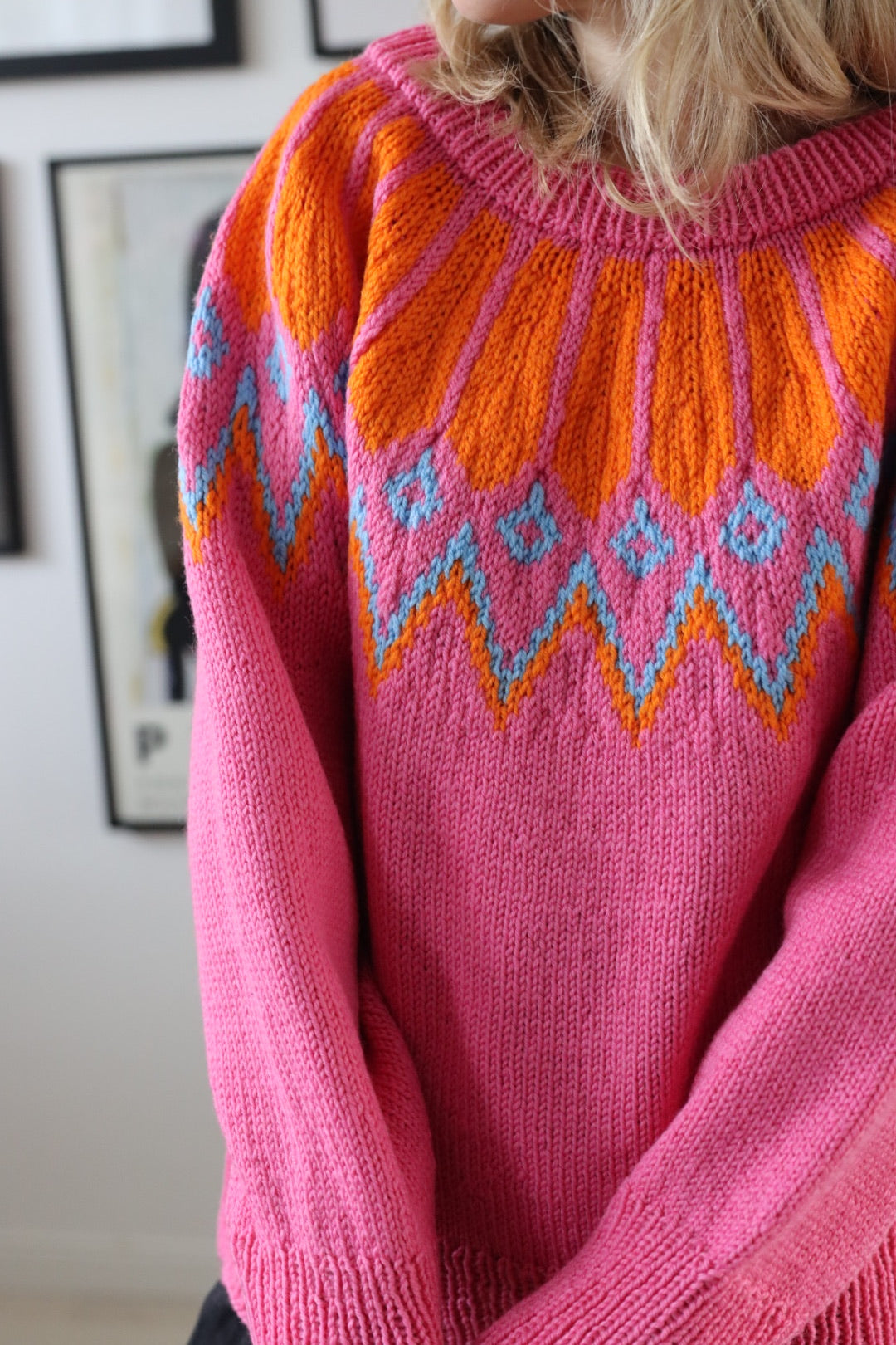 Ekkertinden Sweater er en oversized genser med mønster på bærestykket som strikkes i enkel tråd Supreme Wool. Genseren strikkes ovenfra og ned med rundøkninger på bærestykket. Siden den strikkes ovenfra og ned kan lengden enkelt justeres.