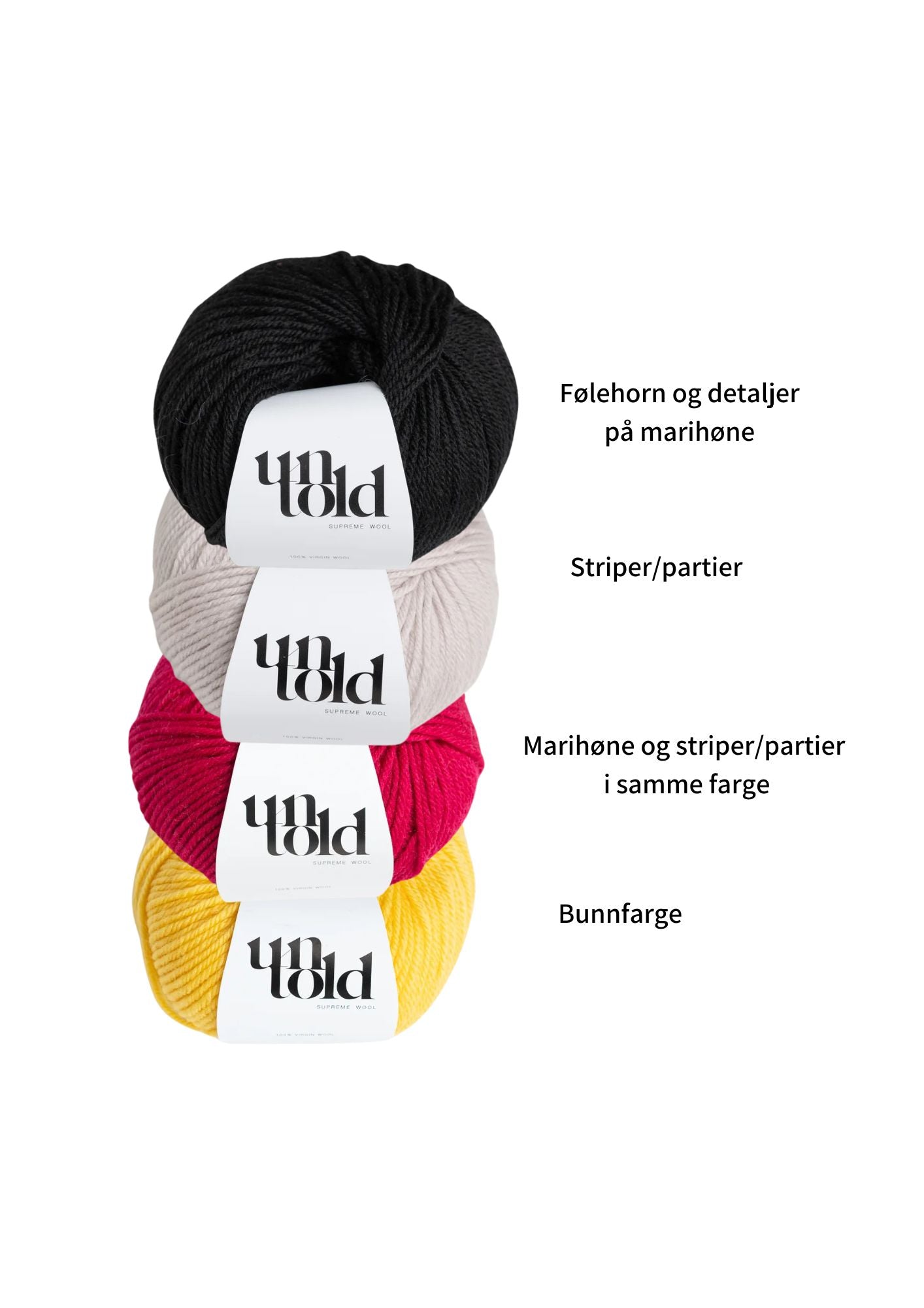 Mønsterfarge 1: 50 gram i alle størrelser (marihøne og striper/partier i samme farge)