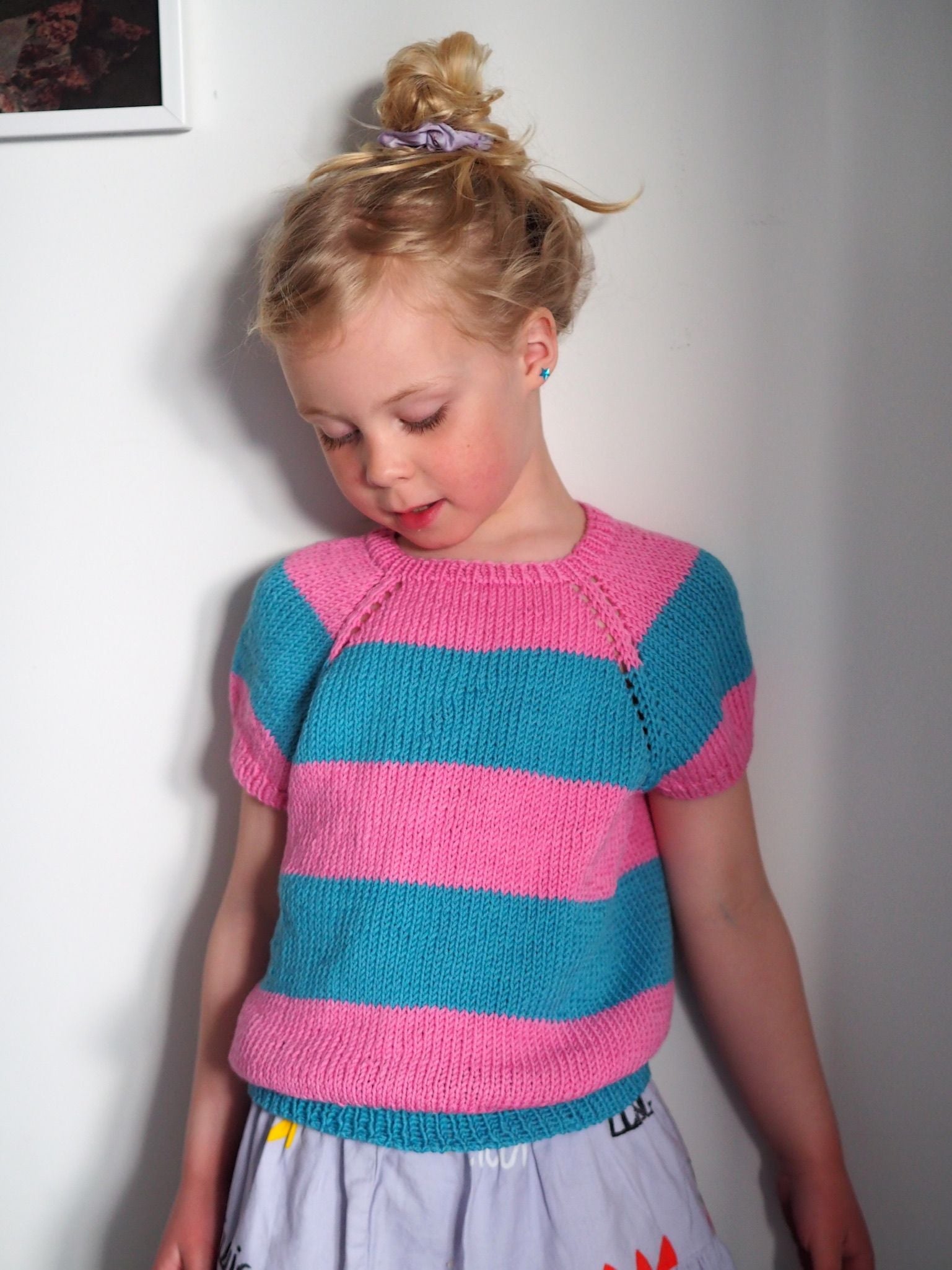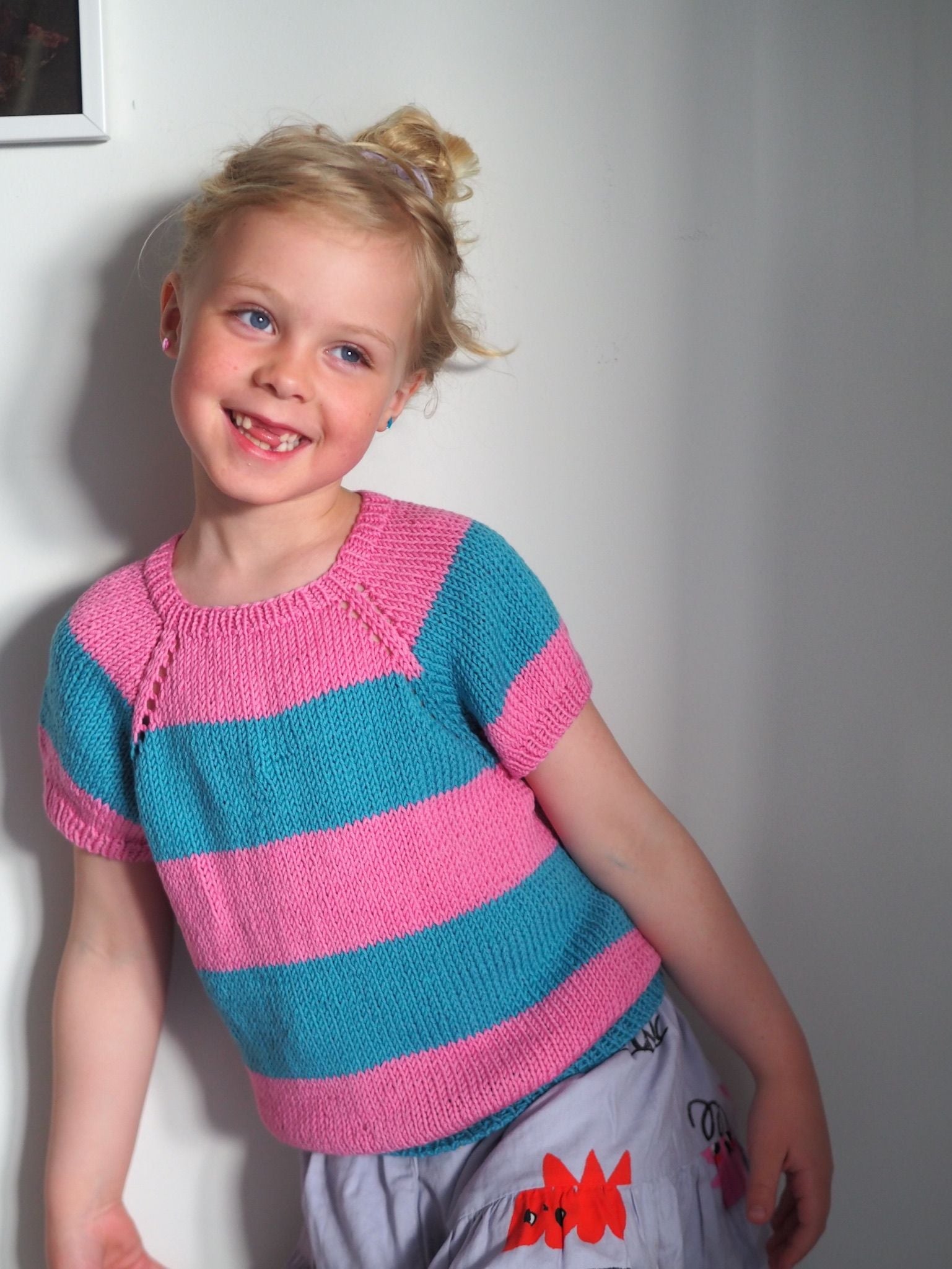 Deilig sommertskjorte med vide ermer, strikkes ovenfra og ned med kast som raglanøkning. Den er kjappstrikket og du kan bruke oppskriften til grunnoppskrift. Prøv gjerne underveis for å få tilpasse barnet.