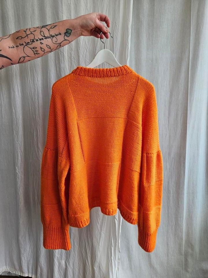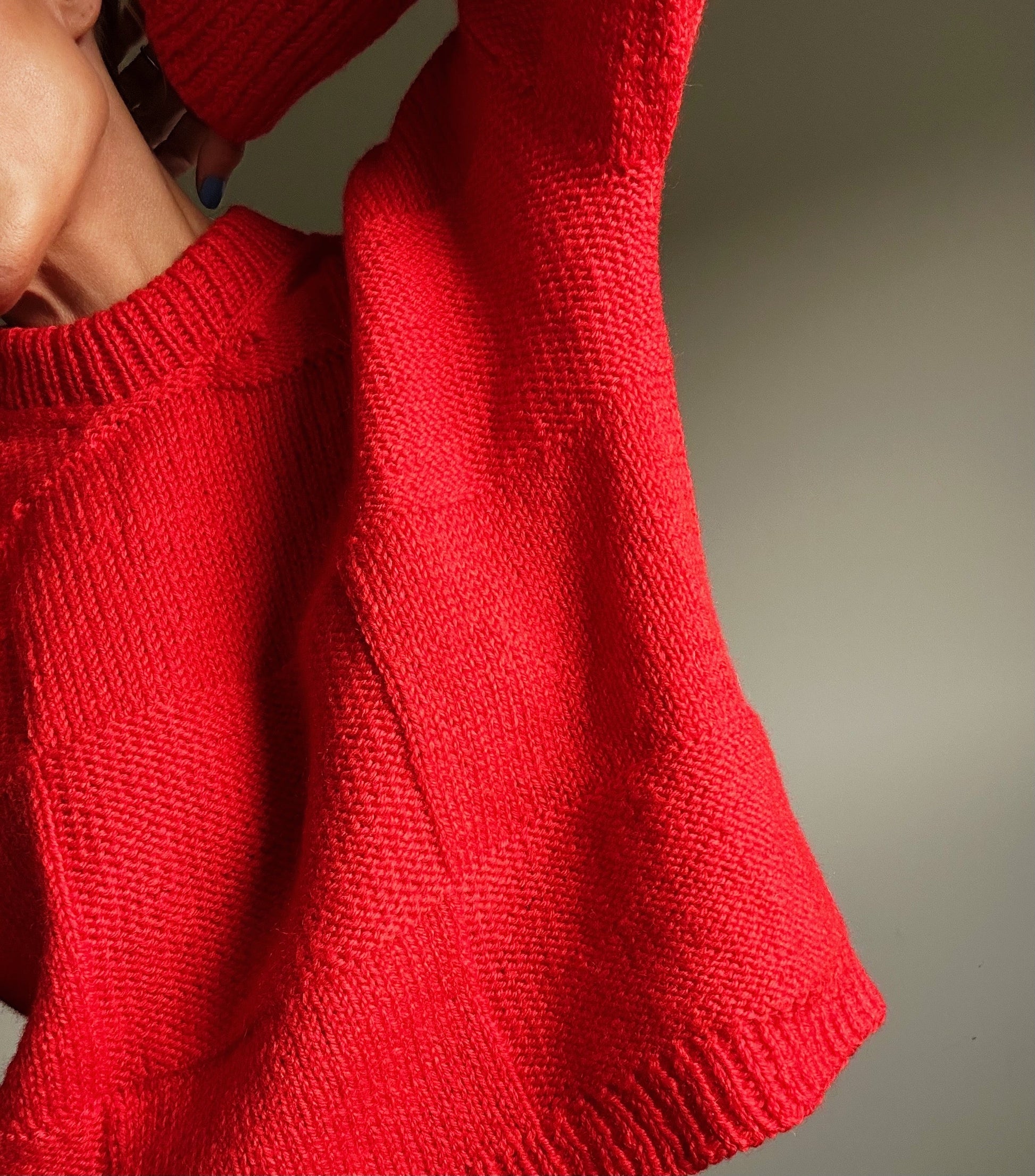 Genserene på bildene er strikket i fargene True Blue, Orange Pop og Fiery Red.