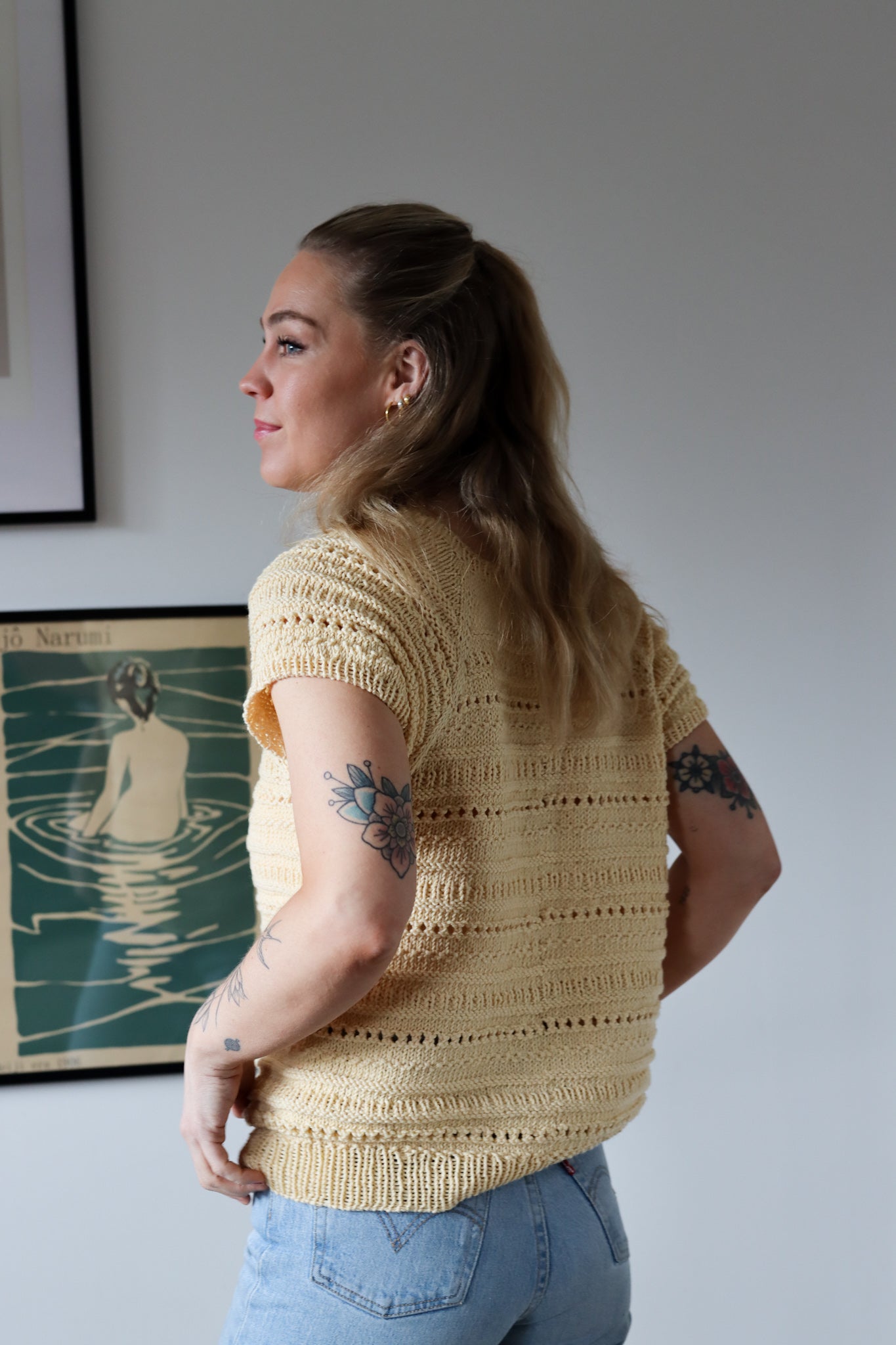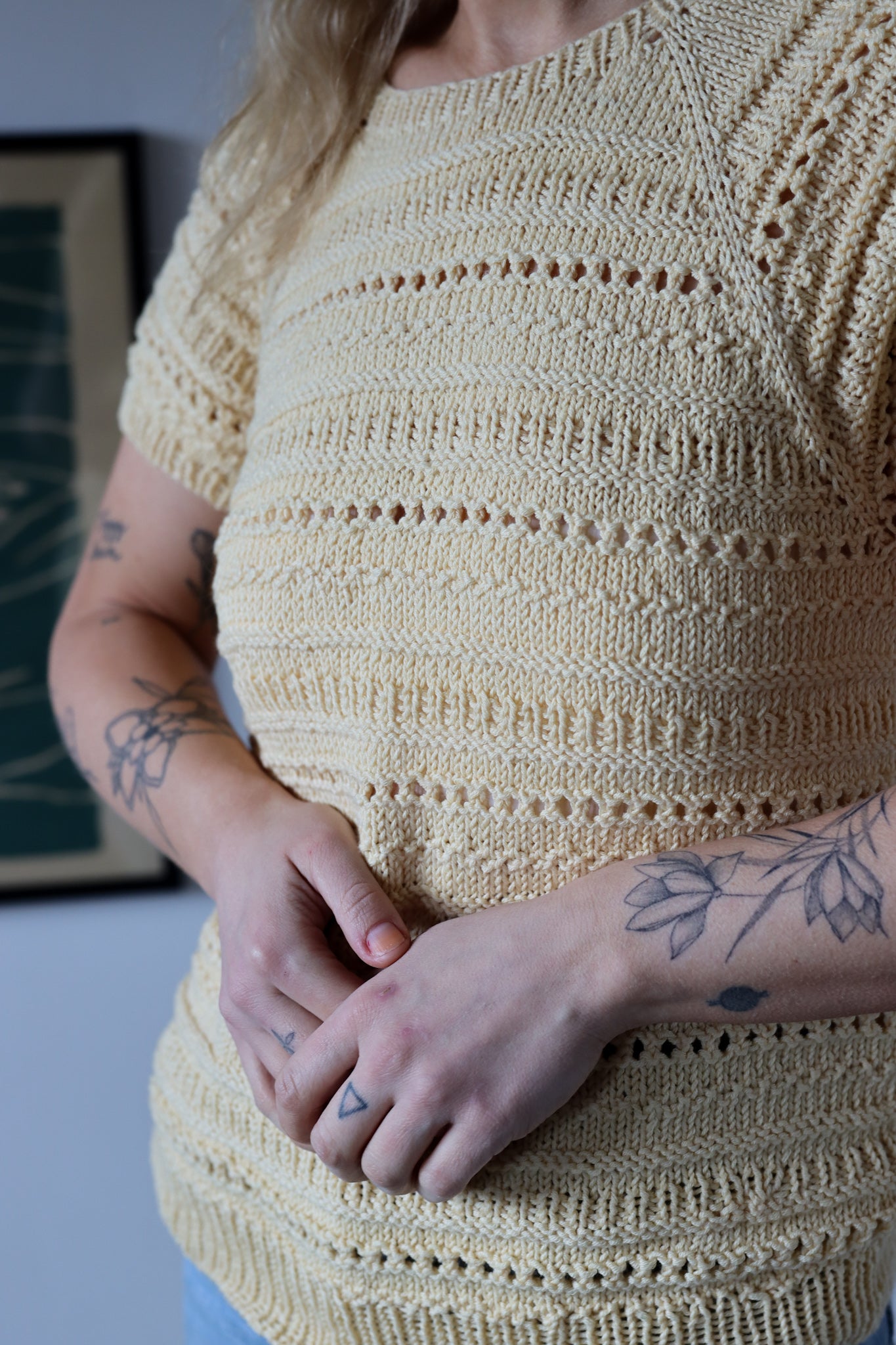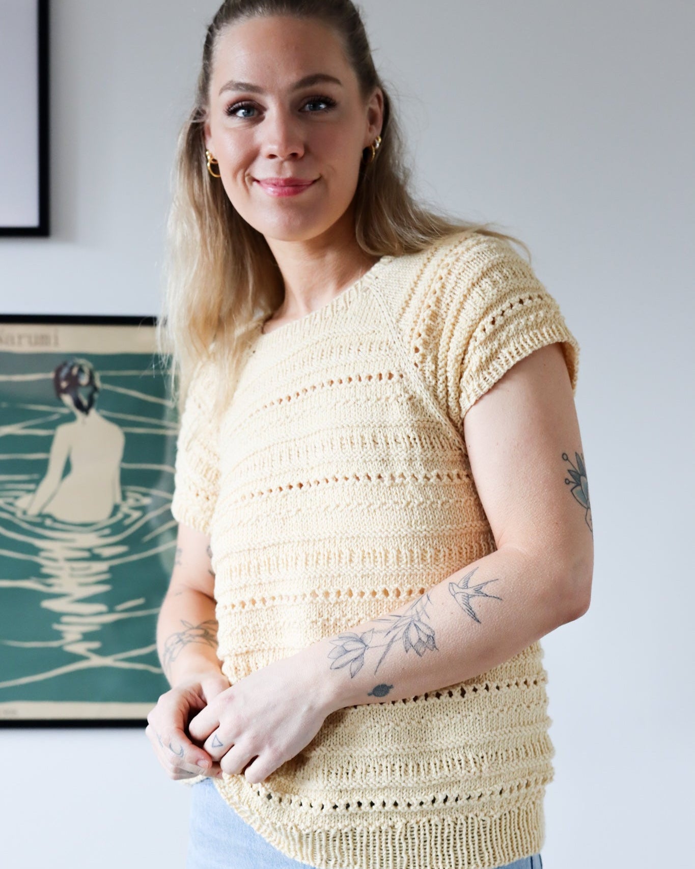 Biscotti Tee er en enkel og elegant t-skjorte med et nydelig, luftig hullmønster som både ser avansert ut og er lett å memorere. Den strikkes ovenfra og ned med raglanøkninger, noe som gir en behagelig passform og gjør det enkelt å tilpasse lengden underveis – perfekt for deg som vil ha en personlig vri på plagget. Biscotti Tee passer like godt til late sommerdager som til lag-på-lag i kjøligere vær. En nydelig basis i garderoben, med det lille ekstra!
