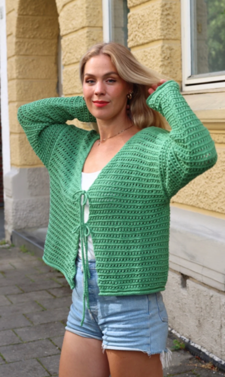 Breezy jacket er en jakke med hullmønster hele veien. Hullmønsteret er repeterende og lett å følge, også for nybegynnere! Jakken strikkes, men mønsteret ligner en hekleteknikk! Den er like fin med lange ermer som korte! Jakken lukkes med i-cord snorer som knytes som søte sløyfer. Siden den strikkes ovenfra og ned kan den med fordel prøves på underveis for å oppnå ønsket lengde.