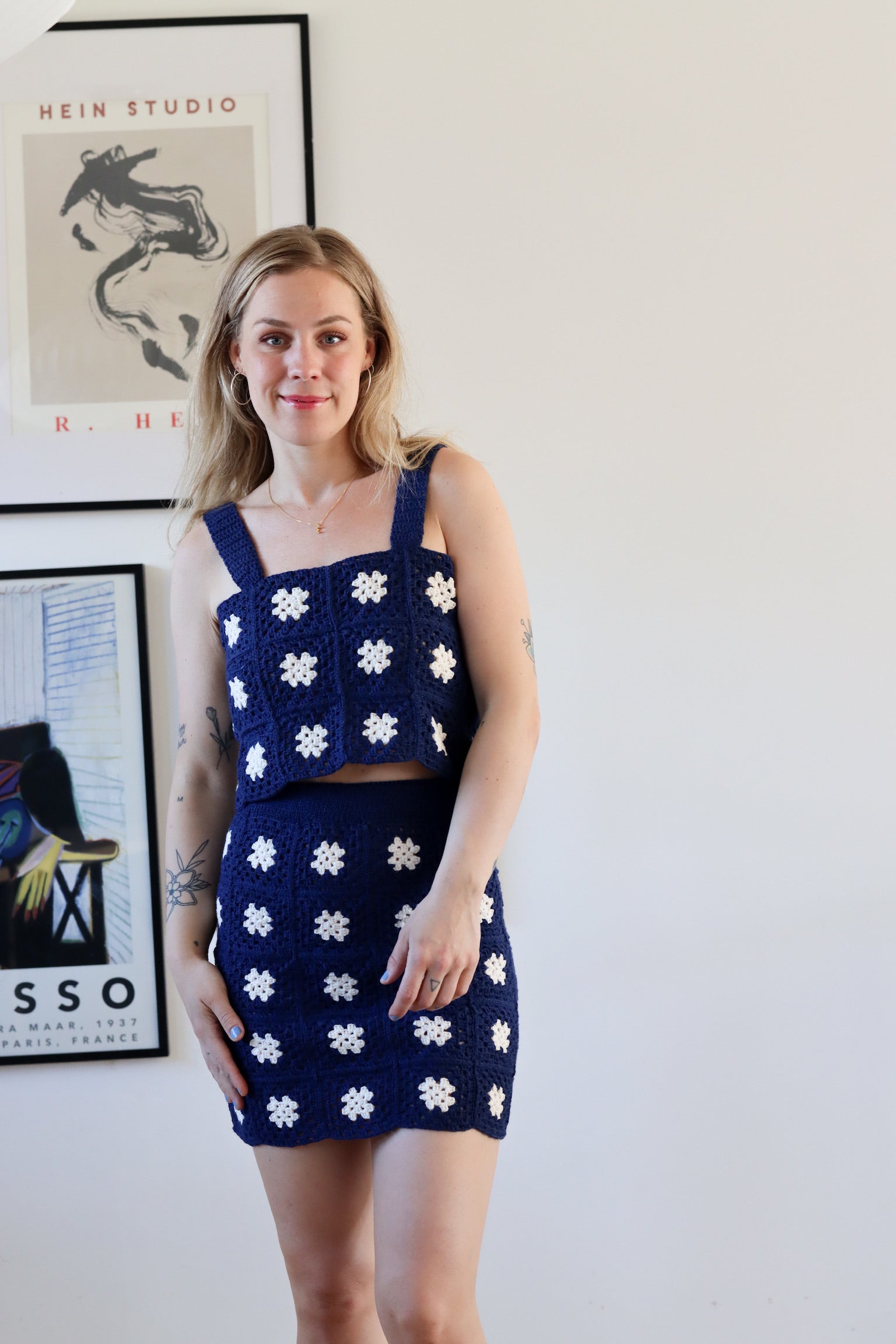 Skjørtet på bildene er heklet i fargene Deep Sea og Ivory.