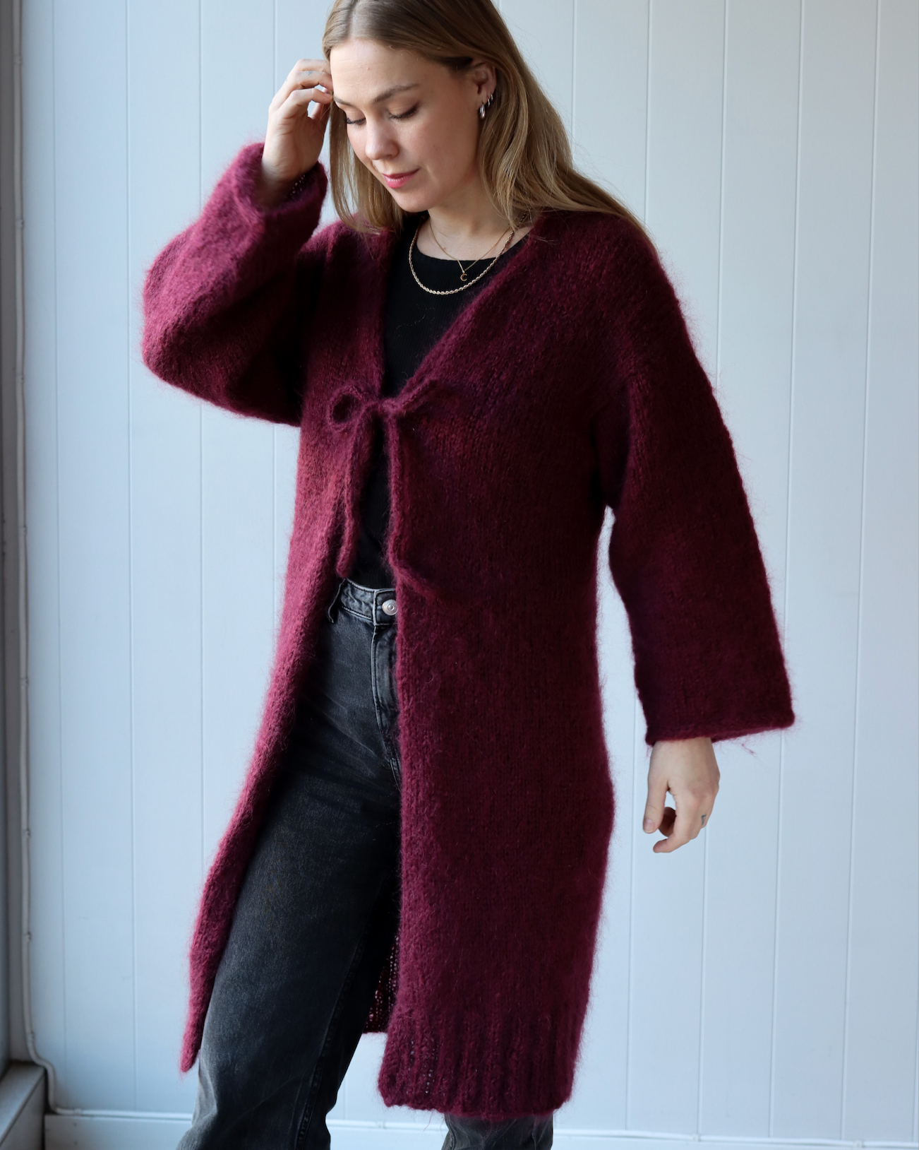 Modellen på bildet har på seg cardigan i fargen Rouge Noir i str 1.