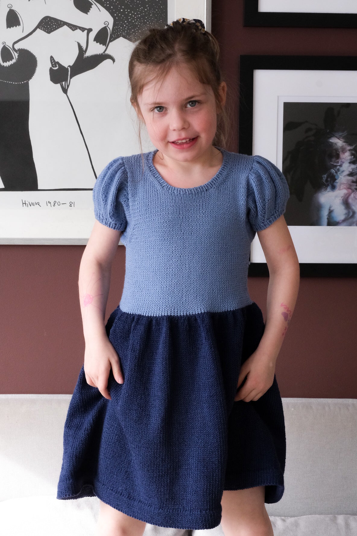 Den tofargede blå kjolen er strikket i Blue Jeans/Deep Sea.