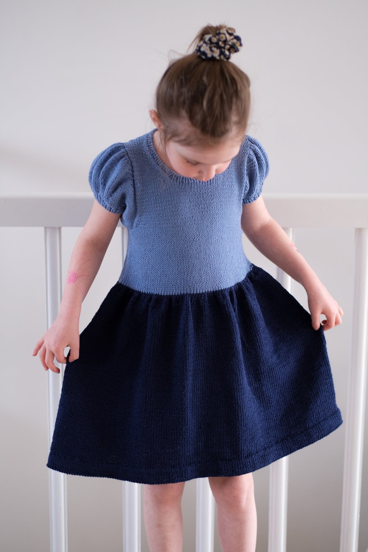 Den tofargede blå kjolen er strikket i Blue Jeans/Deep Sea.