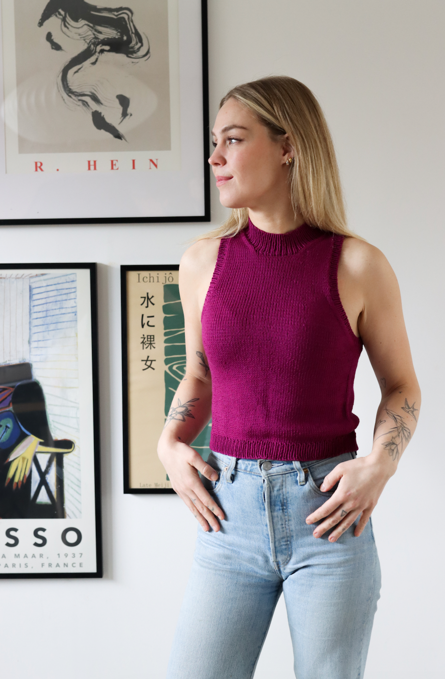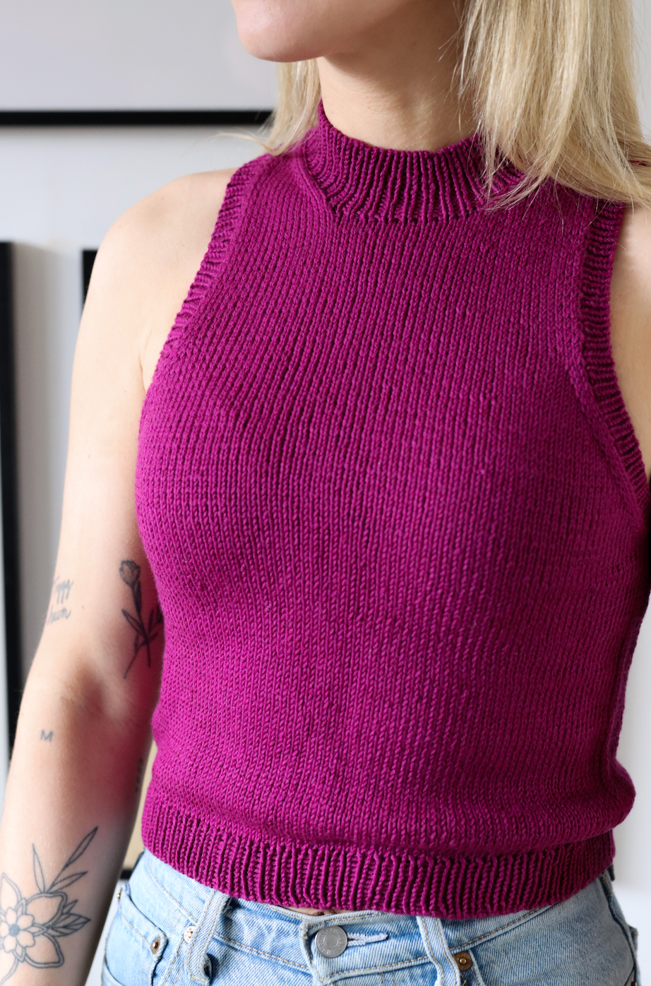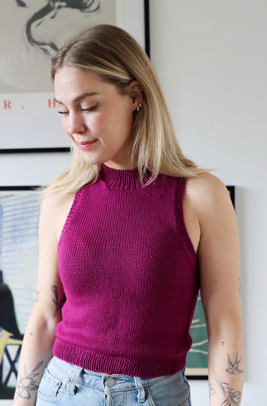 Lilja tank er en basic topp med halvhøy hals. Den er ettersittende, formflatterende og cropped i livet. Siden den strikkes ovenfra kan den med fordel prøves på underveis for den perfekte lengden til akkurat deg!