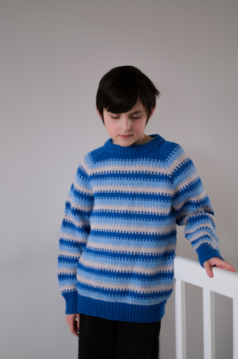 Pixel sweater JR er en raglangenser med enkel mønsterstrikk som strikkes ovenfra og ned med raglanøkninger. Det enkle mønsteret gjentas hele veien og er lett å memorere. Siden den strikkes ovenfra og ned kan lengden enkelt tilpasses underveis.