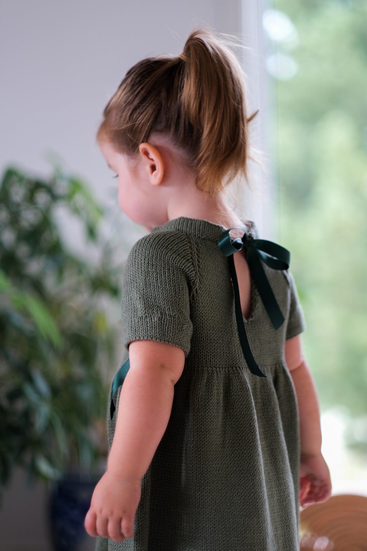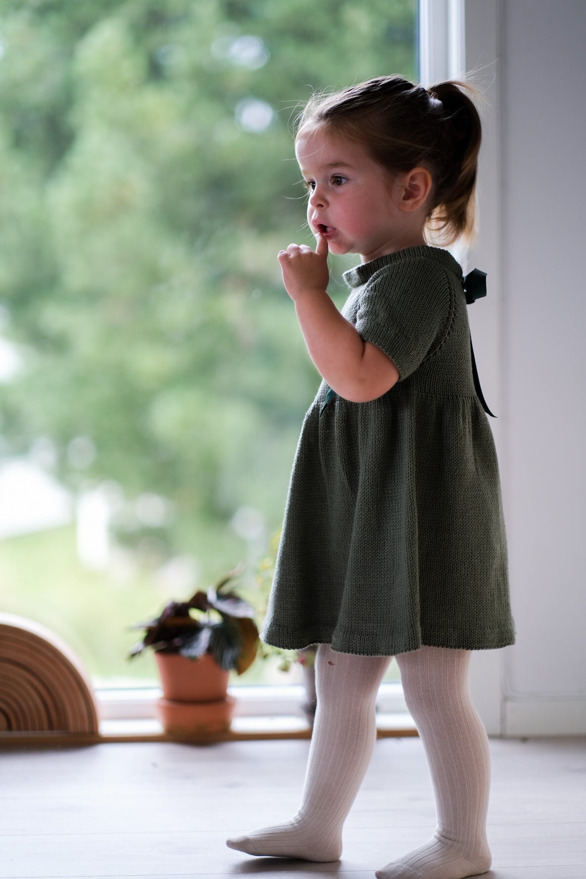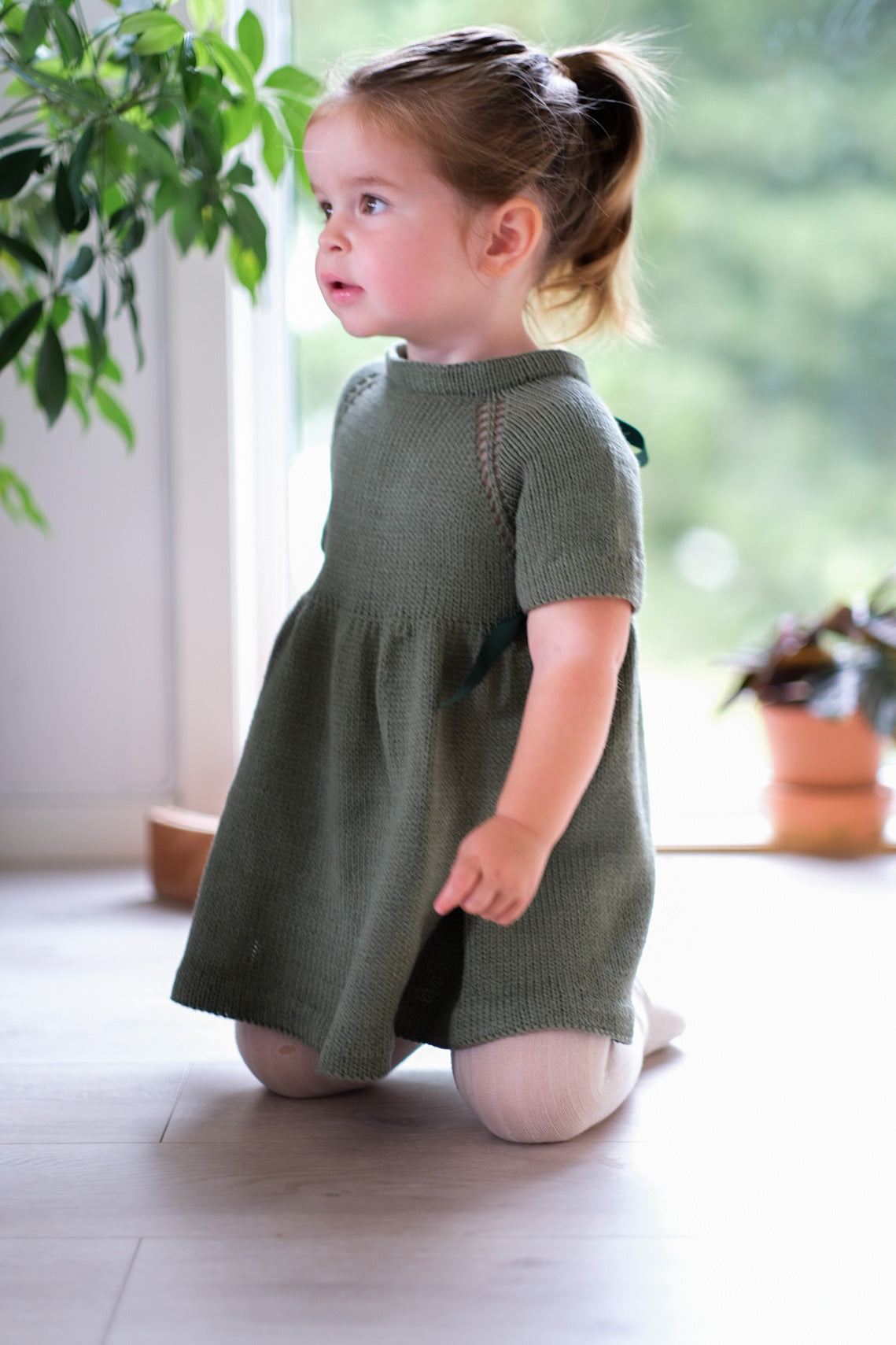 Sonjakjole er en enkel kjole som strikkes ovenfra og ned med løpegang i halsen og ermene.