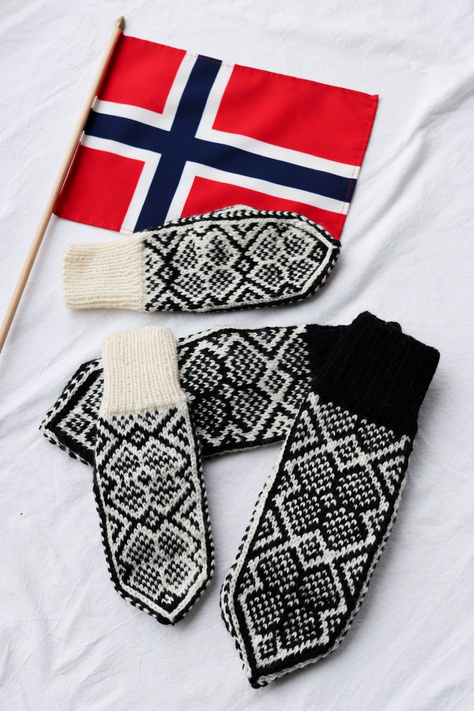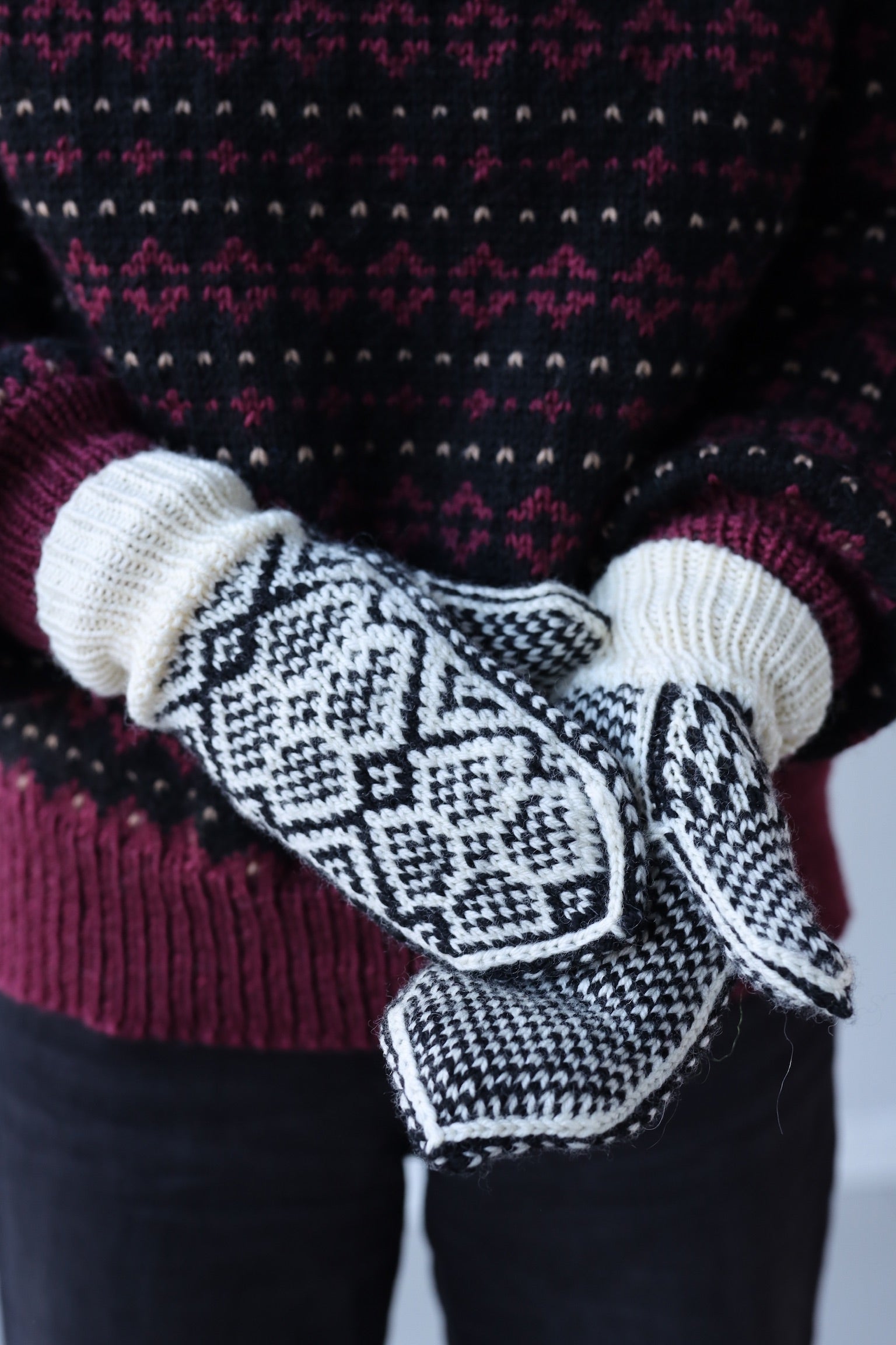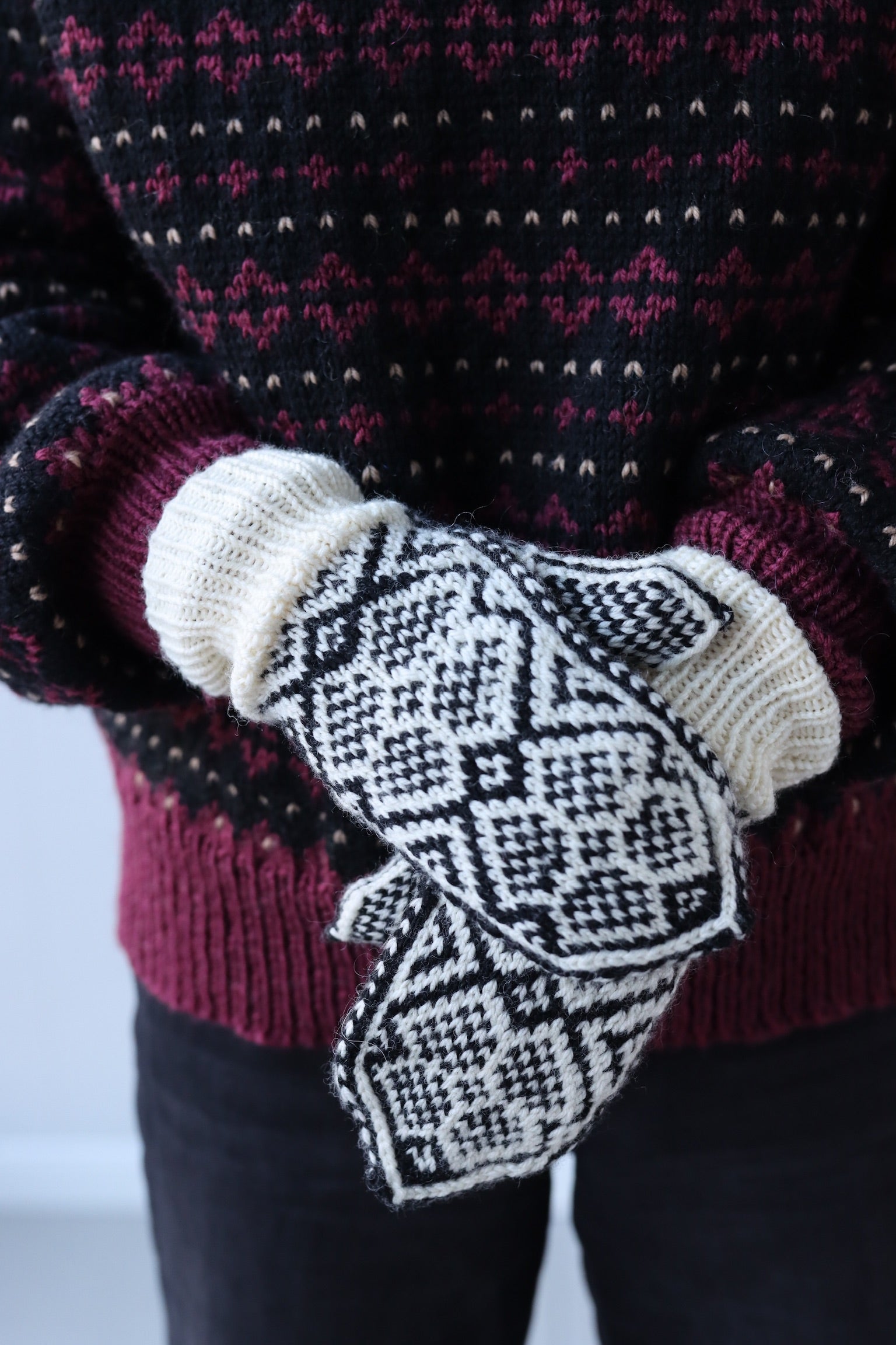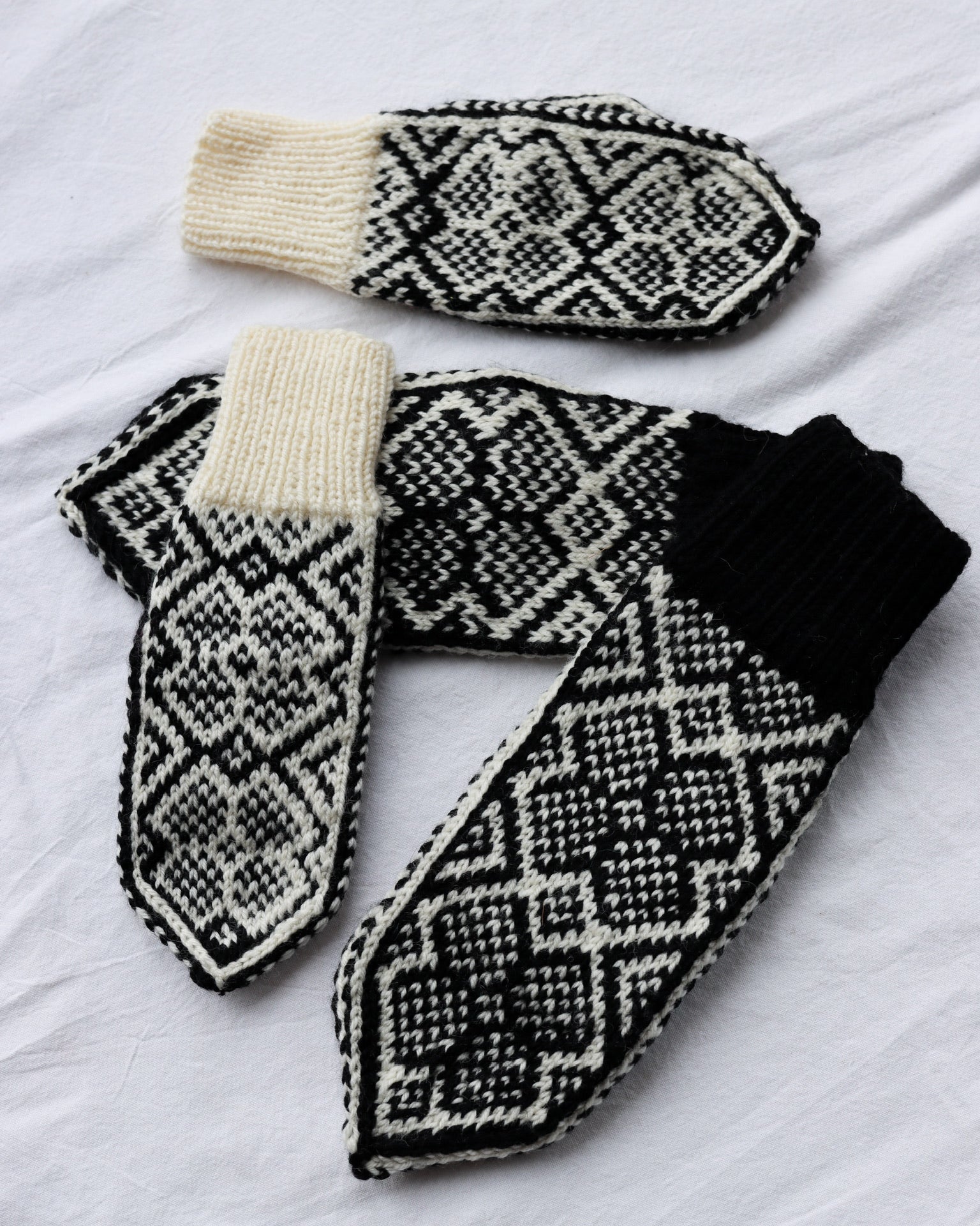 Vottene på bildene er strikket i fargene Jet Black og Ivory.