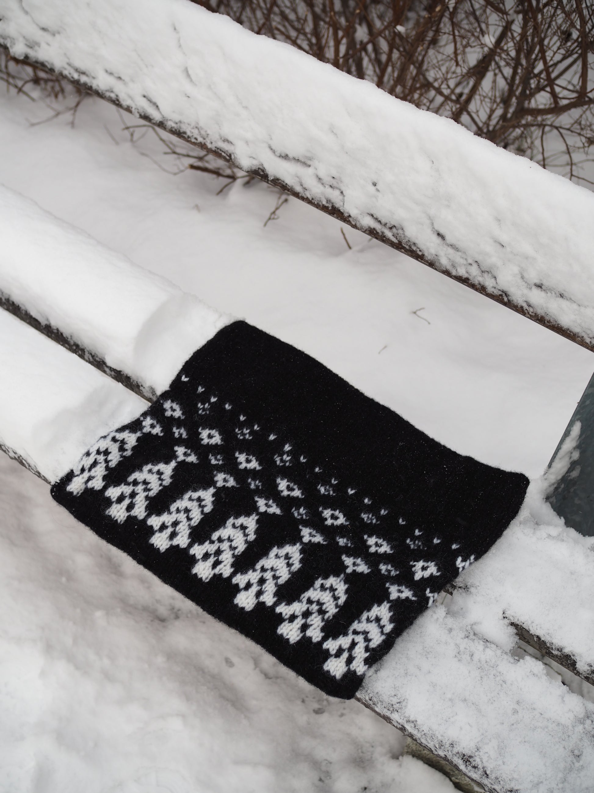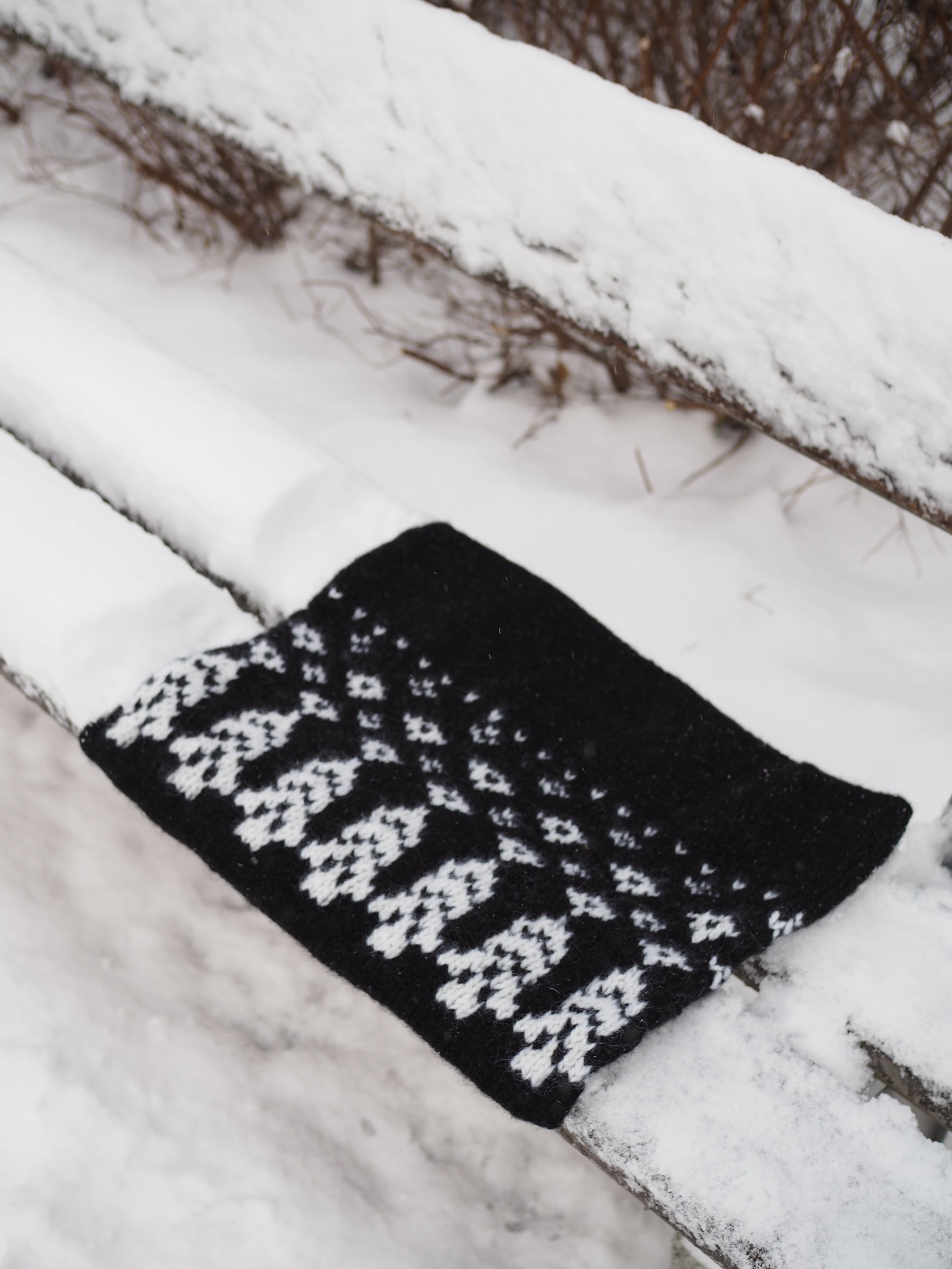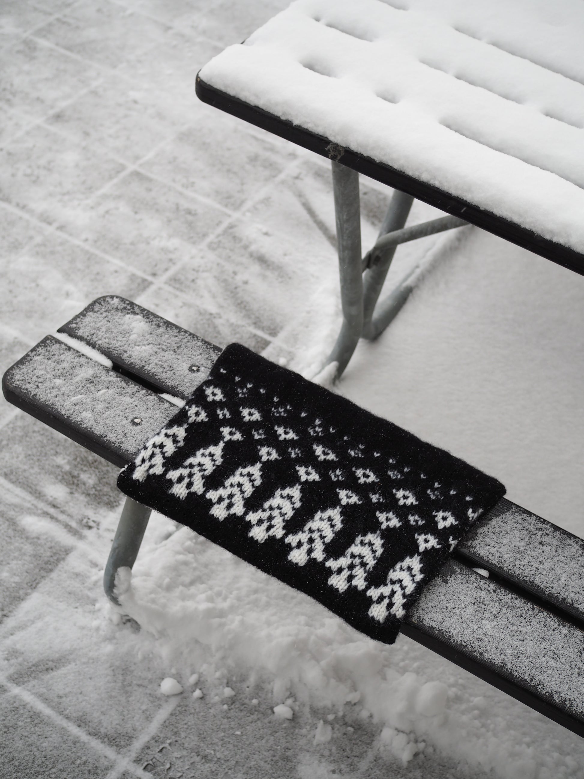 Sitteunderlaget på bildene er strikket i fargene Jet Black og Ivory.
