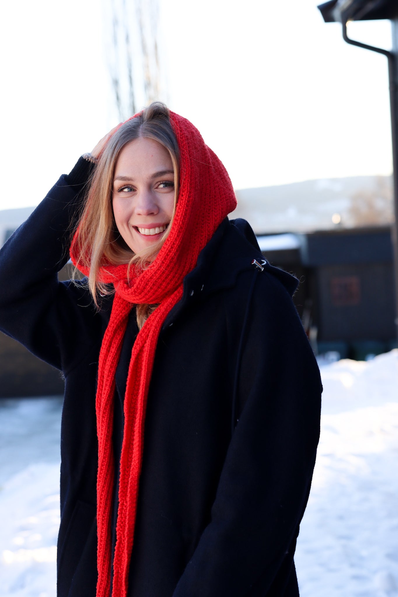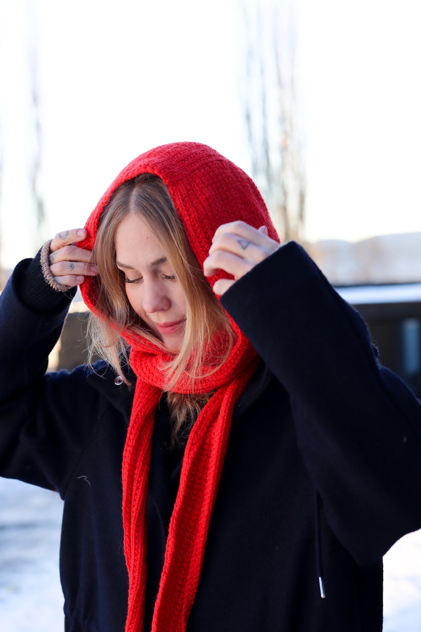 Dette hette-skjerfet strikkes ovenfra og ned. Man starter med et kvadratisk panel først, for så å plukke opp masker rund og strikke nedover. Når man har strikket hetten deler man opp arbeidet i to og strikker to sider med “skjerf”.