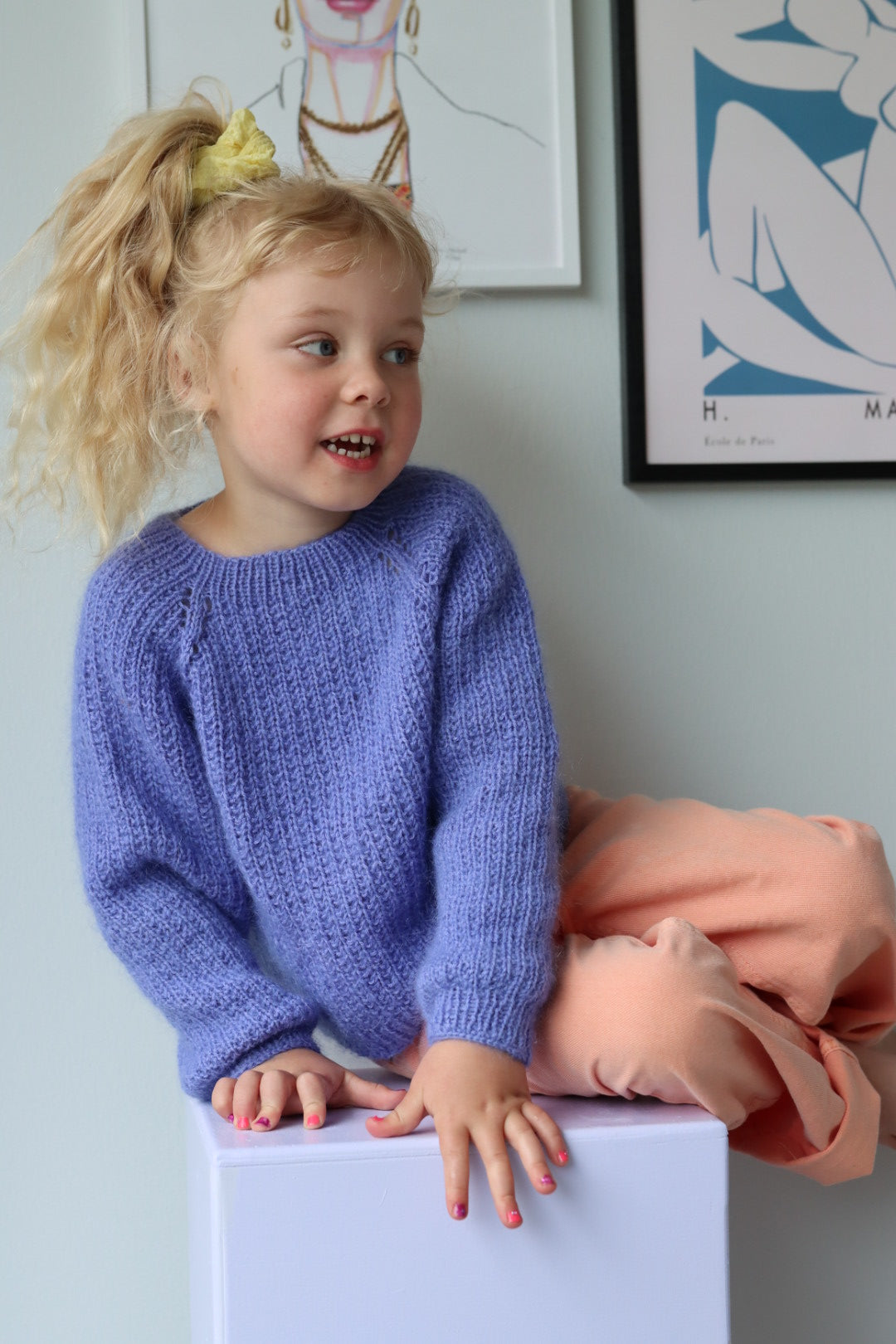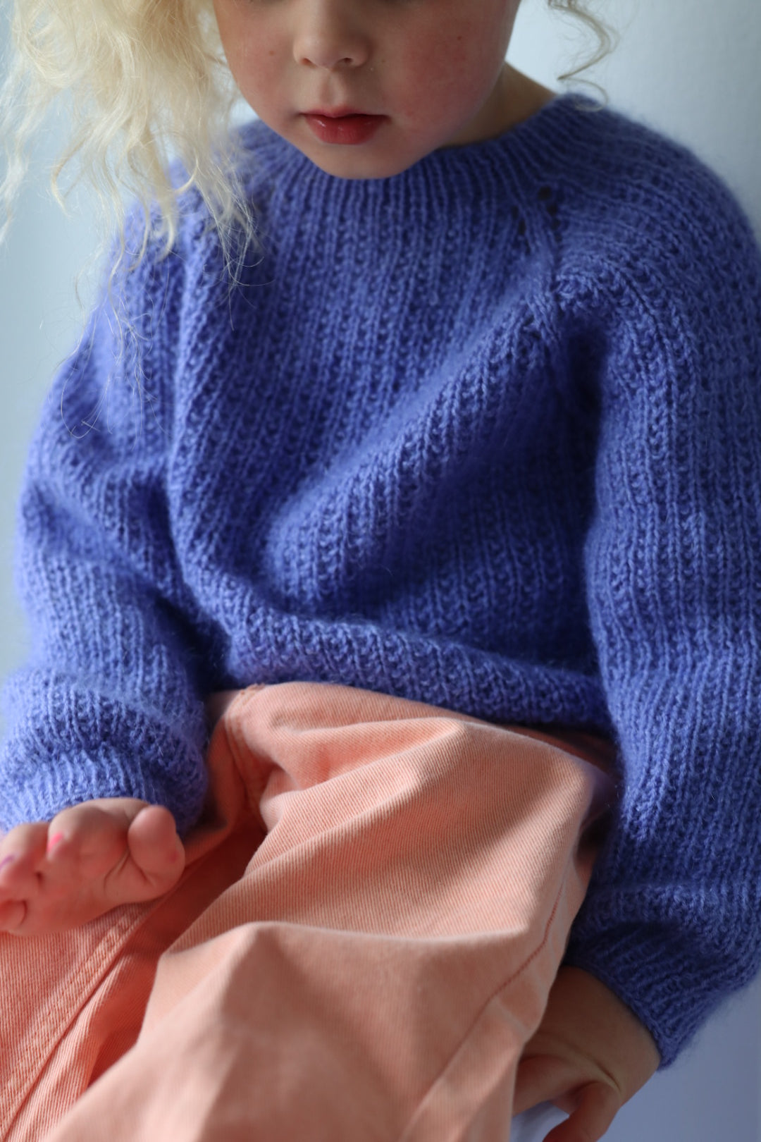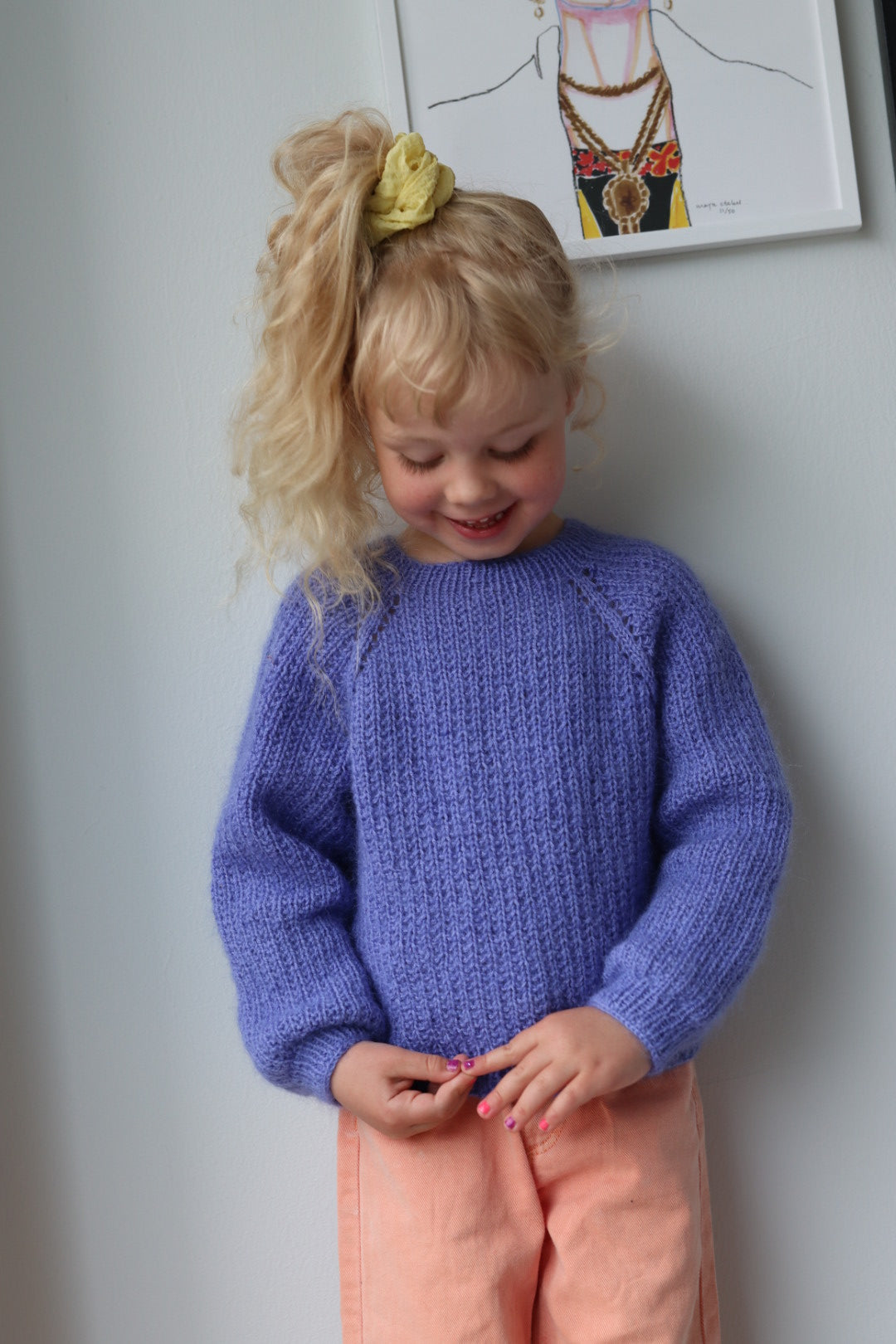 HarlowsweaterJR strikkes ovenfra og ned ved hjelp av raglanøkninger i dobbel tråd (1 tråd Light Merino / 1 tråd Pure Silk mohair). Hele arbeidet strikkes i perlestrikk. Halsen strikkes først deretter økes det ut til raglan ved hjelp av kast. Når raglanøkningene er ferdig, strikkes bol. Til sist strikkes ermene. Siden genseren strikkes ovenfra og ned anbefaler vi å prøve på underveis slik at barnet får den lengde som passer best.