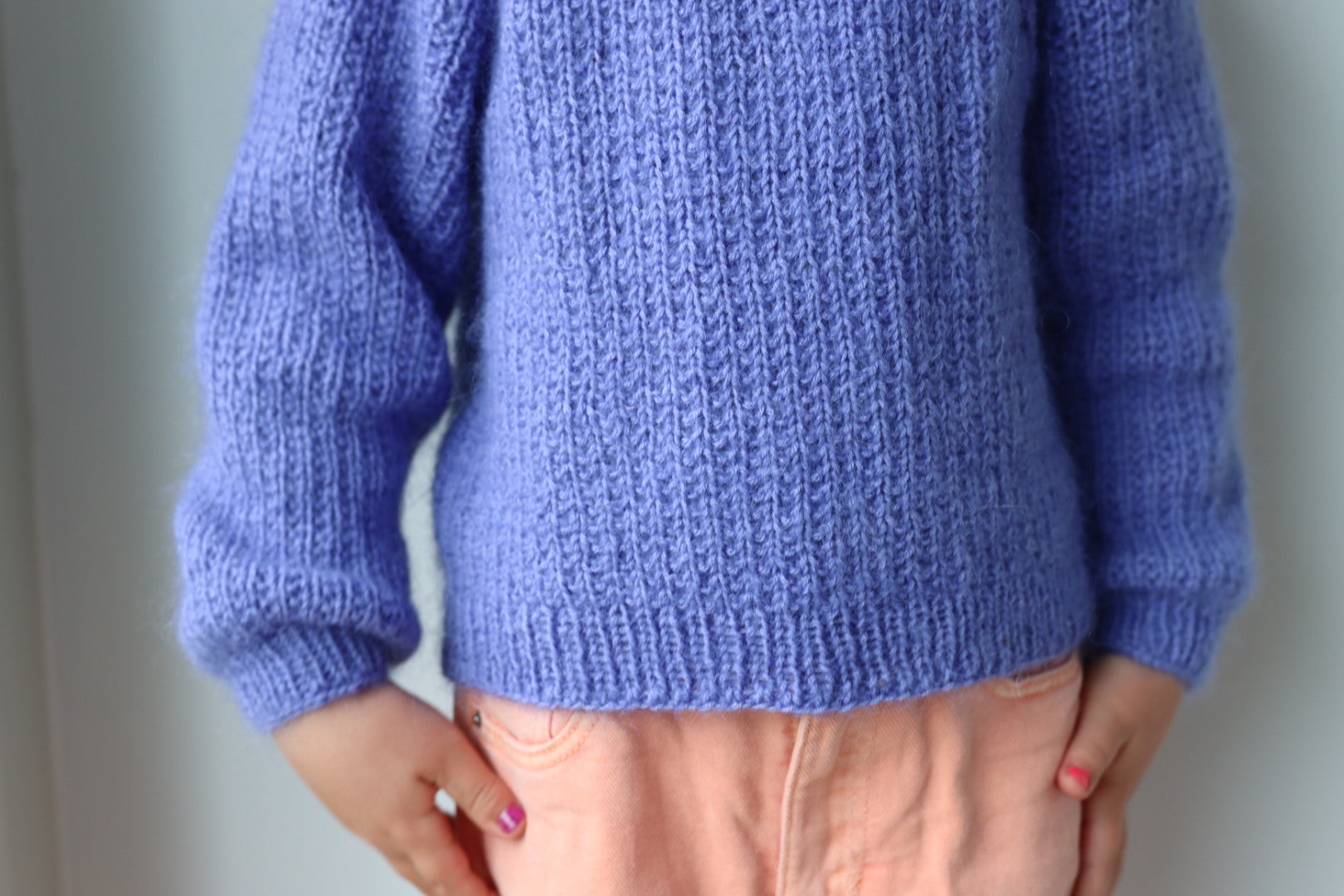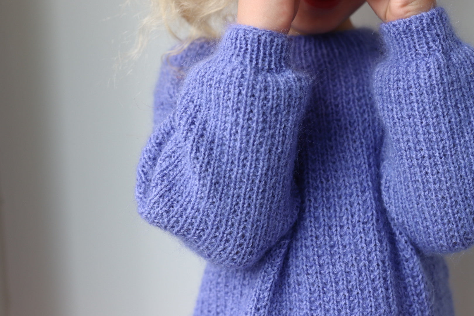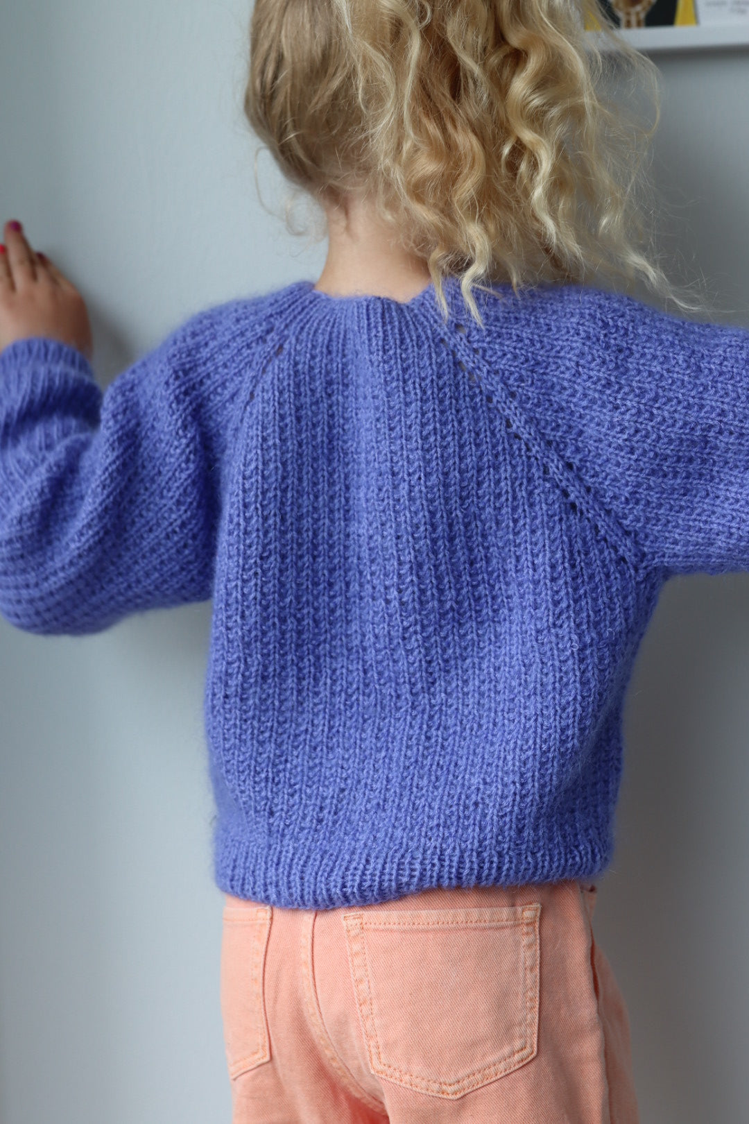 HarlowsweaterJR strikkes ovenfra og ned ved hjelp av raglanøkninger i dobbel tråd (1 tråd Light Merino / 1 tråd Pure Silk mohair). Hele arbeidet strikkes i perlestrikk. Halsen strikkes først deretter økes det ut til raglan ved hjelp av kast. Når raglanøkningene er ferdig, strikkes bol. Til sist strikkes ermene. Siden genseren strikkes ovenfra og ned anbefaler vi å prøve på underveis slik at barnet får den lengde som passer best.