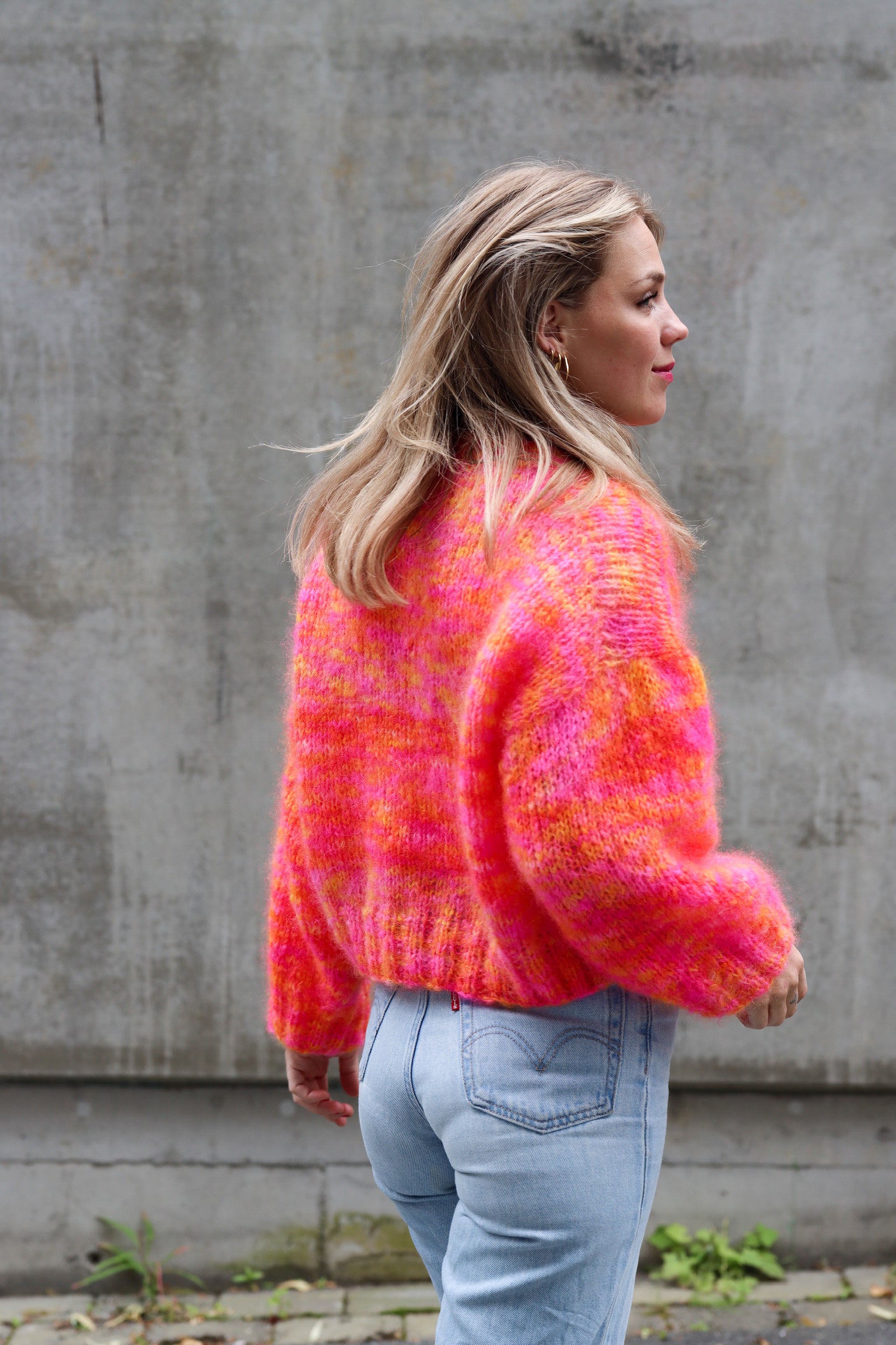 Modellen på bildet har på seg cardigan i fargen Tropesommer i str 2.