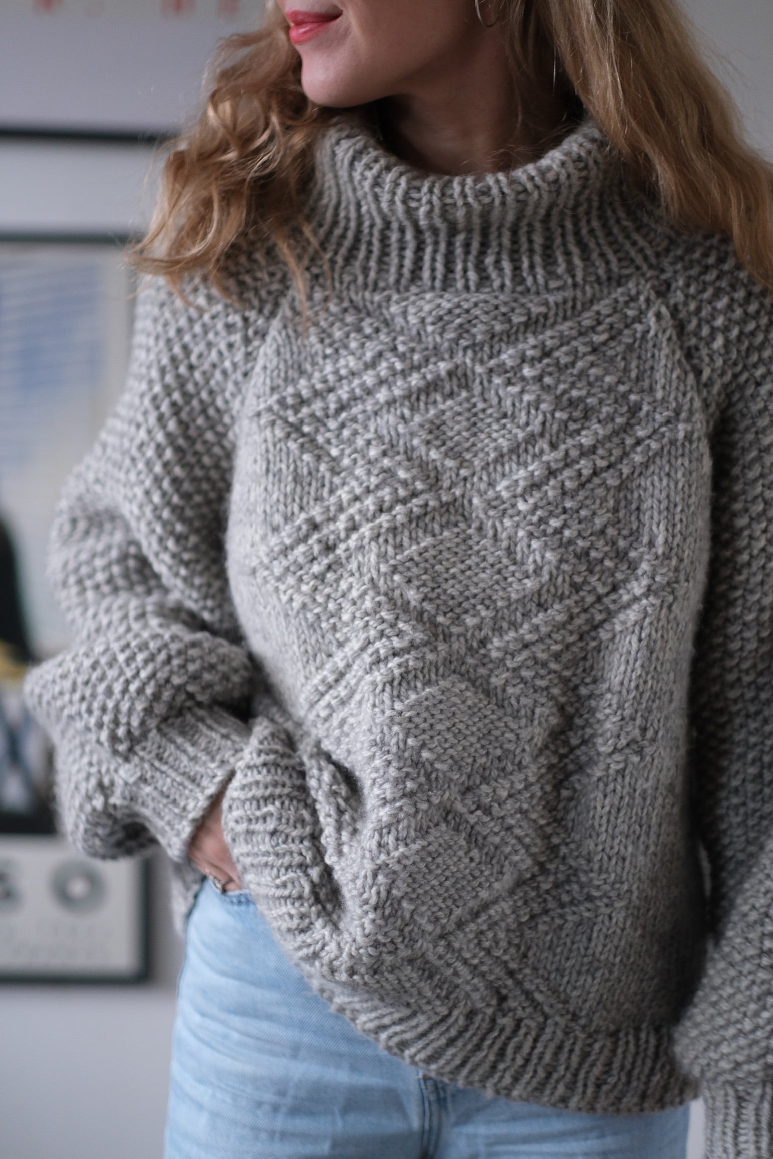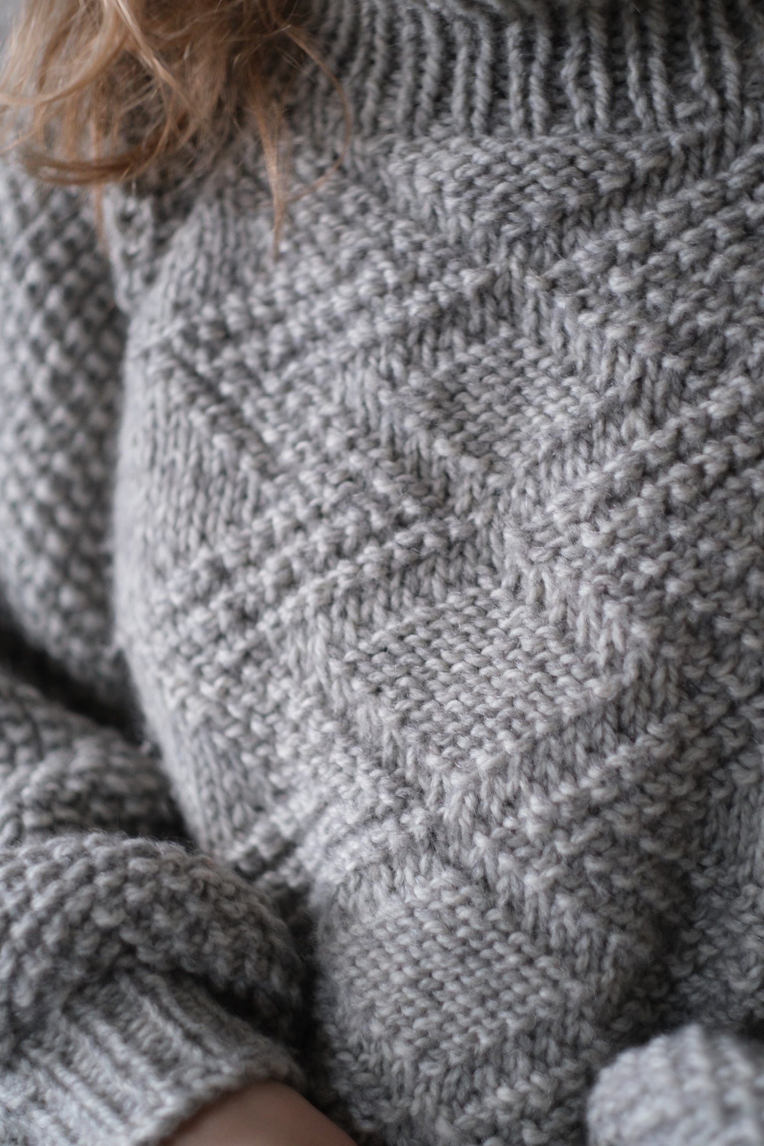 Vinterens fineste genser strikkes ovenfra og ned. Mønsteret strikkes med rett og vrangmasker - enkelt og greit! På ermene strikkes det perlestrikk. Dette er et mønster er gøy og enkelt å strikke! På ryggen slår det glattstrikk, mens på forstykket er det mønsterstrikk.
