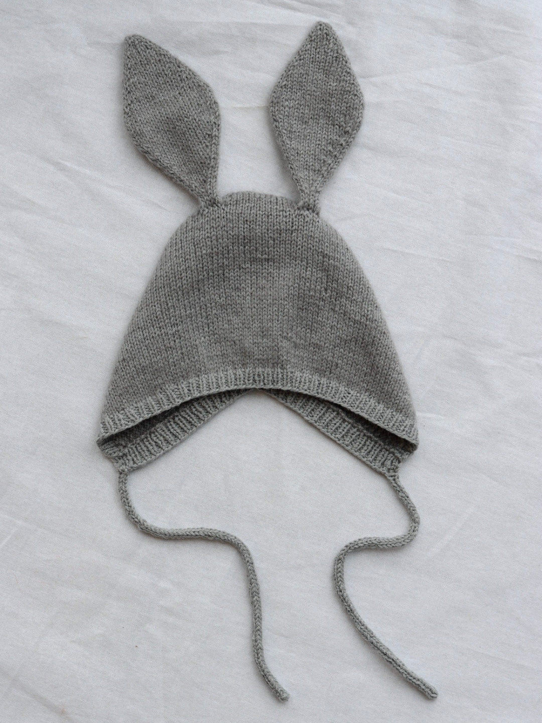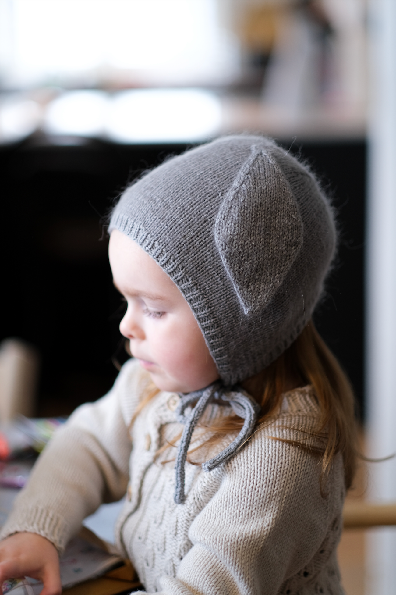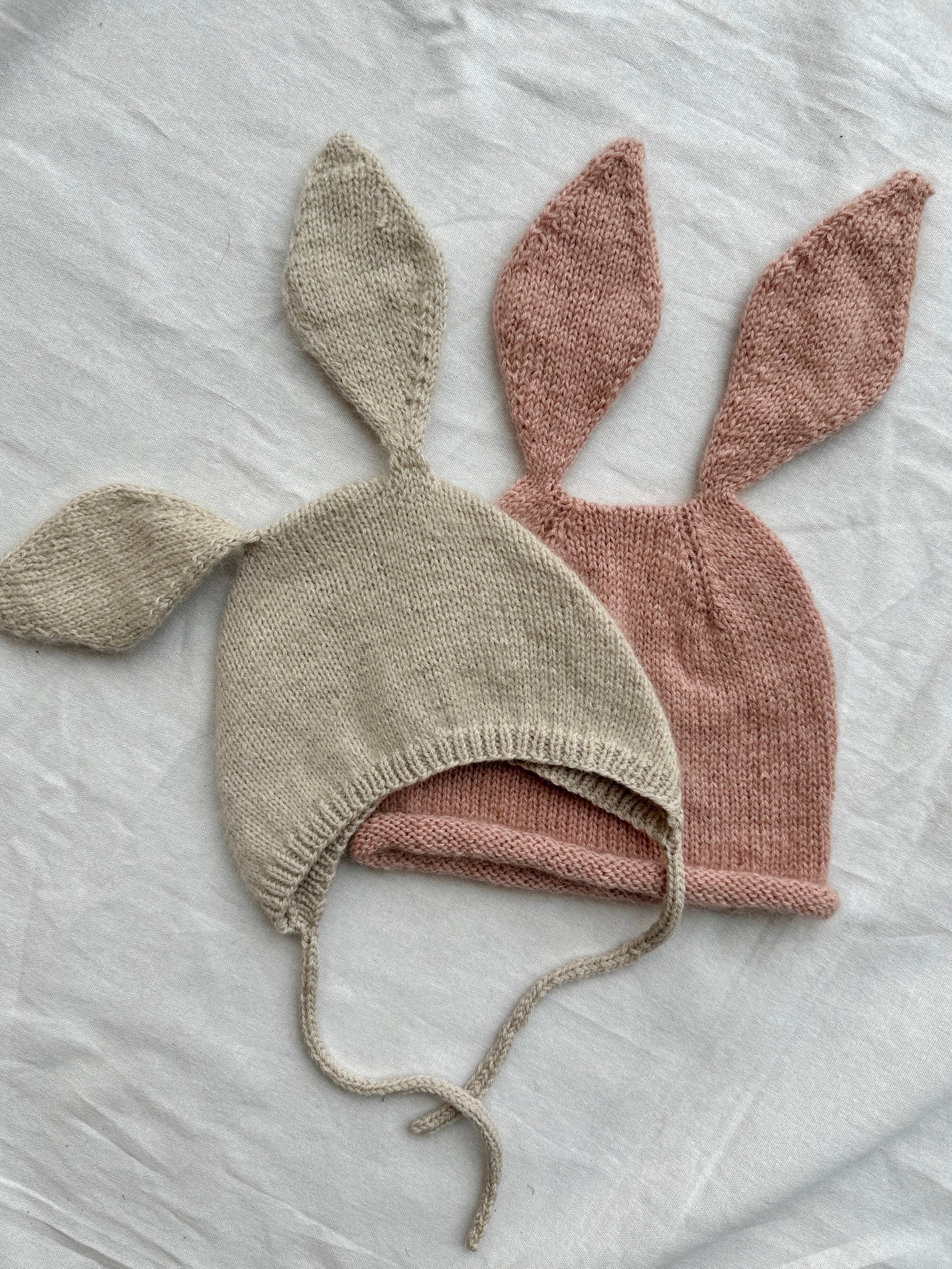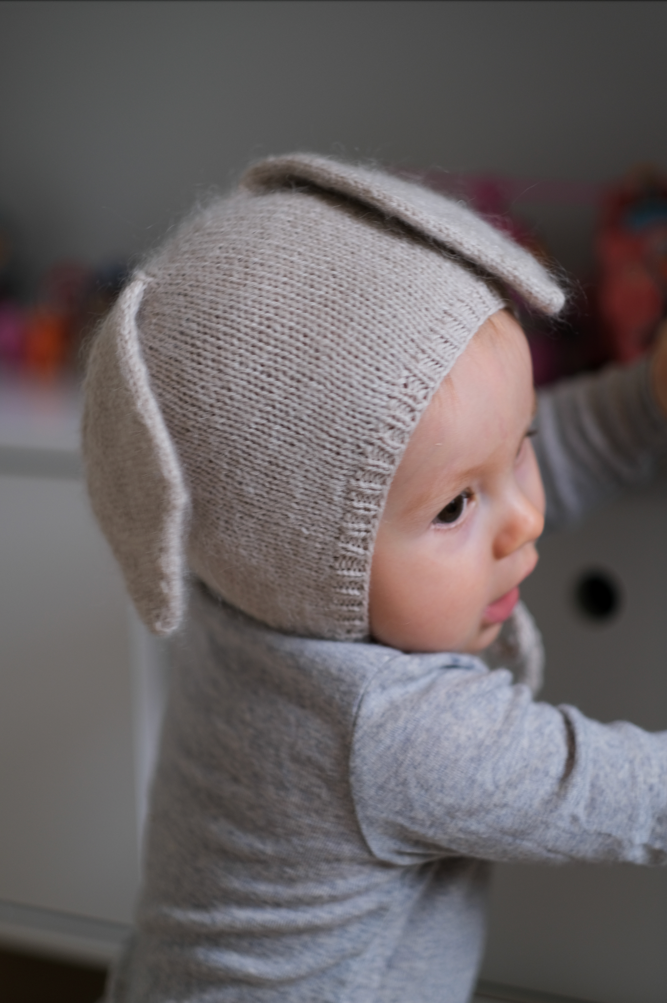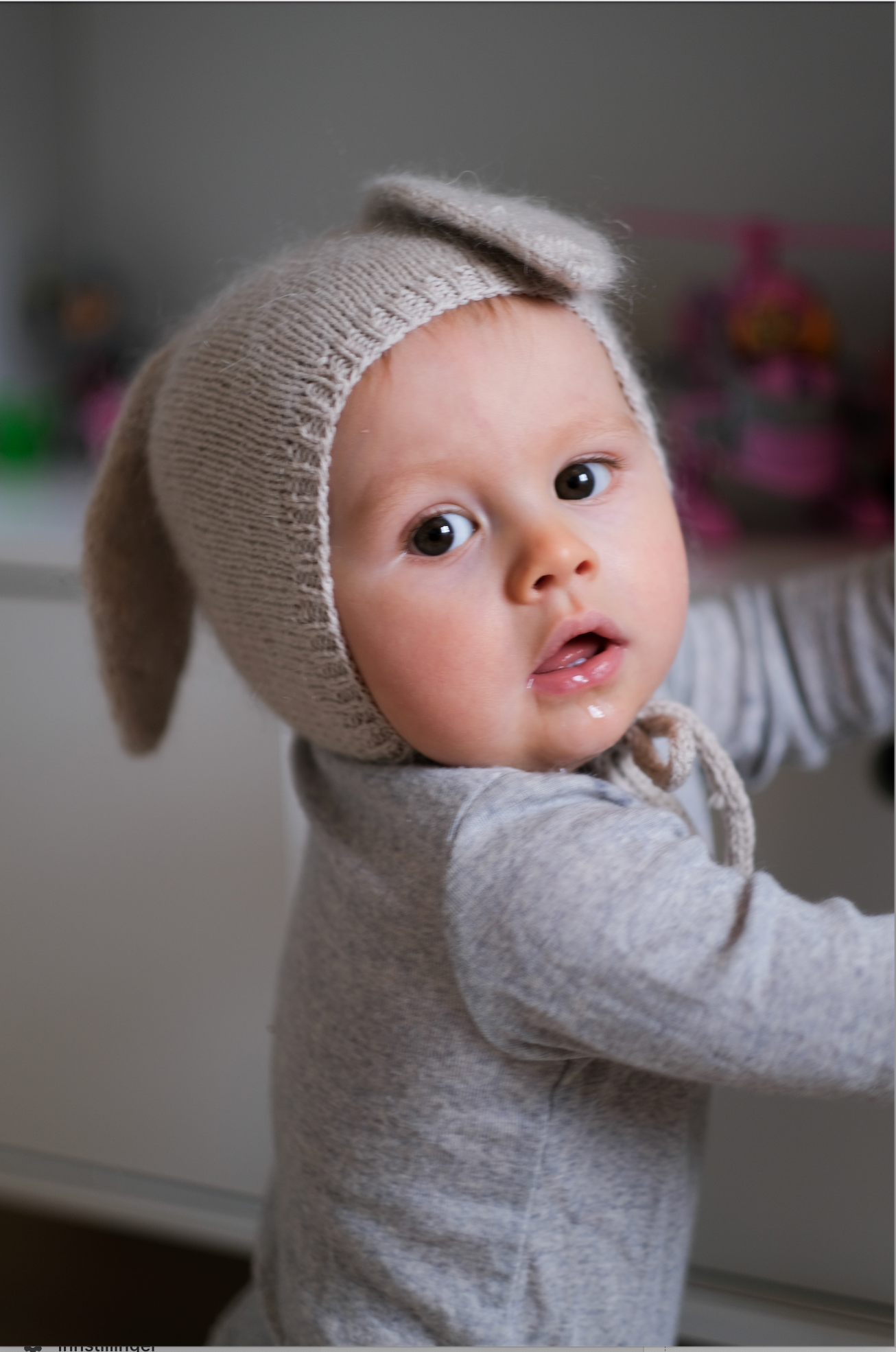 Bunny kyse er en søt kyse med kaninører. Den strikkes i en myk og varm kombinasjon av Light merino og Pure silk mohair. Vi anbefaler at kantene og snorene strikkes i dobbel tråd Light merino for å hindre at mohairfibrer skaper irritasjon i munn og nese. Strikk søskenmatch med Bunny lue for større barn. Oppskriften finner du her.
