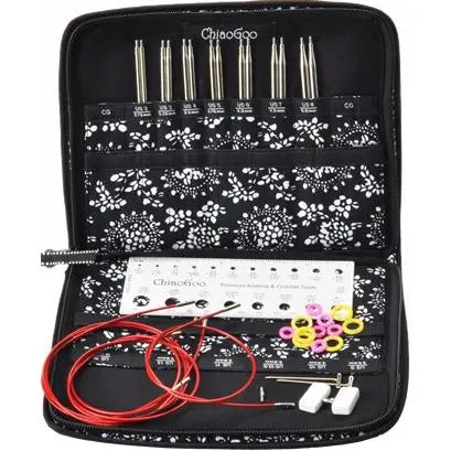 Sett med utskiftbare rundpinner fra ChiaoGoo. ChiaoGoo har fantastiske strikkepinner i kirurgisk stål med en vaier som ikke krøller seg, perfekt for magic loop!