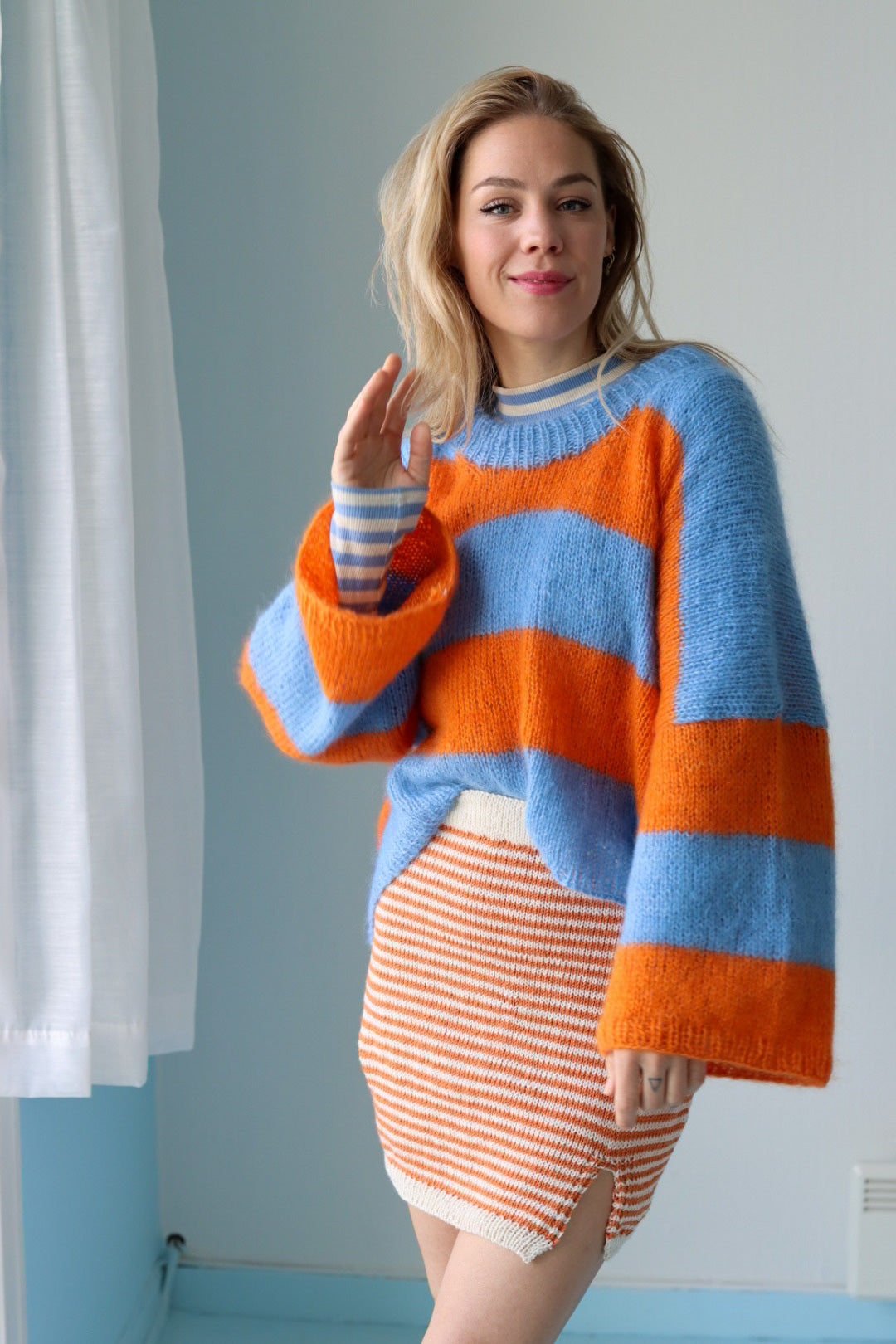 Skjørtet har litt høy midje og en formflatterende passform med økninger i sidene. Beregn en bevegelsesvidde på ca. 1- 8 cm målt rundt hoften. Eksempel: Din hofteomkrets er 107 cm. 107 + 1- 8 cm = 108 -115 cm. Altså bør du strikke en str. 4 med en hofteomkrets på 110 cm. Skjørtet slutter omtrent midt på låret. Beregn et ekstra garnnøste dersom du vil strikke det lenger.